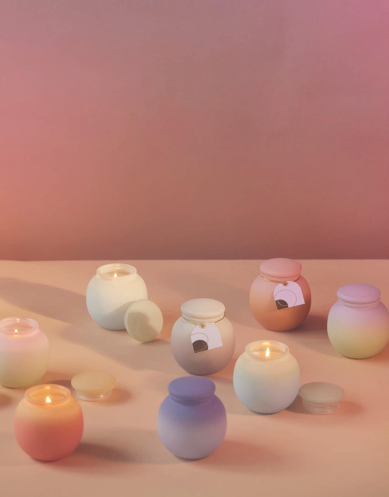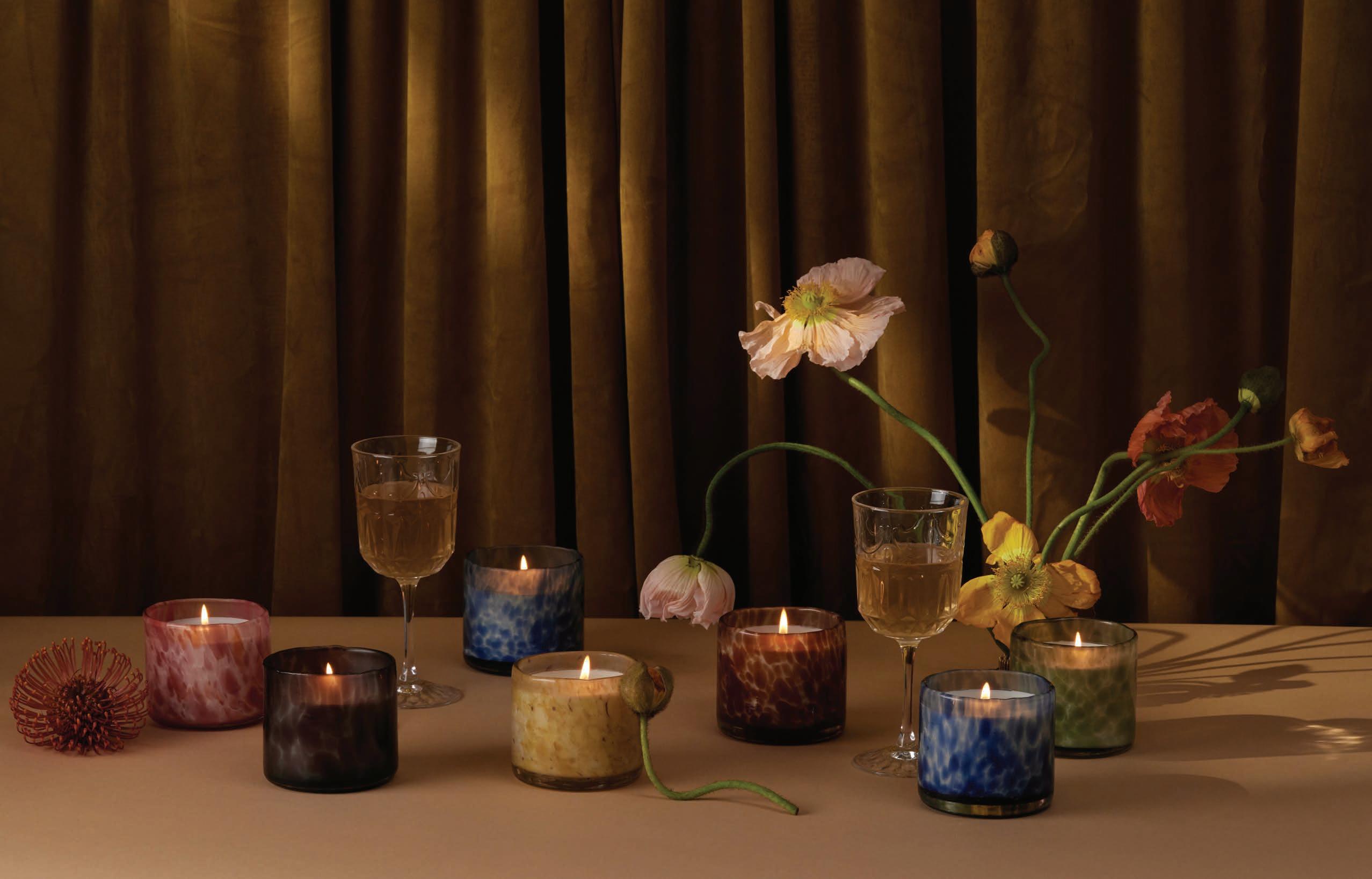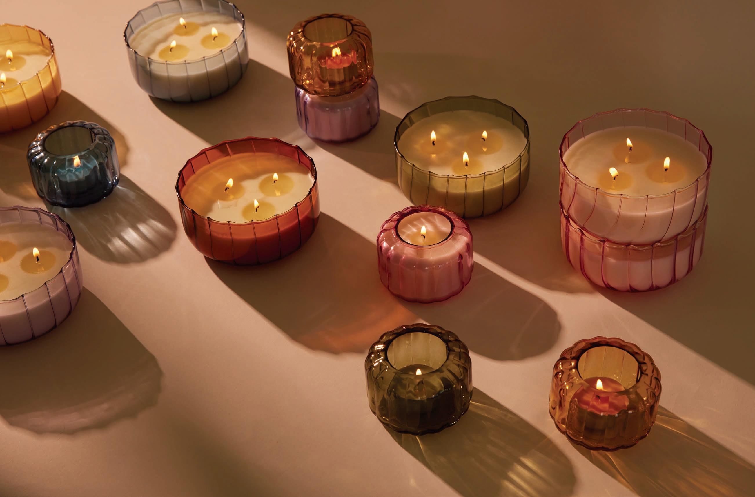 •MINI GLASS CANDLES IN MATCHING TRANSPARENT COLORS CAN BE REPURPOSED AS ADORABLE CATCHALLS AND TEA LIGHT HOLDERS