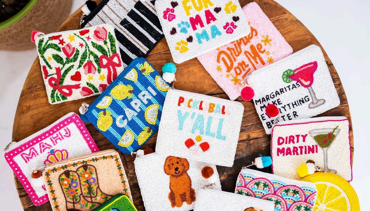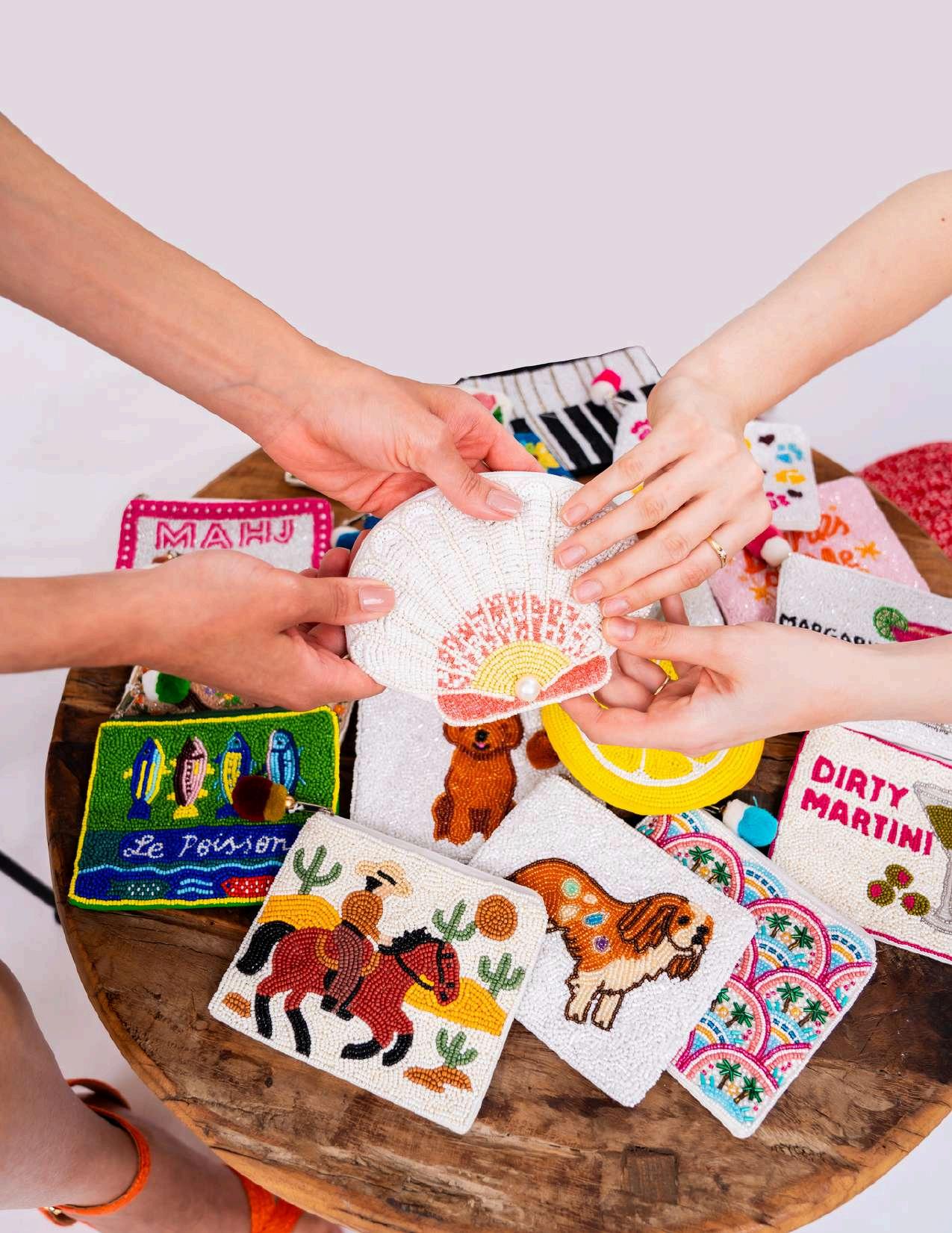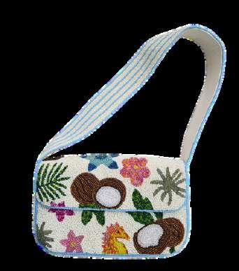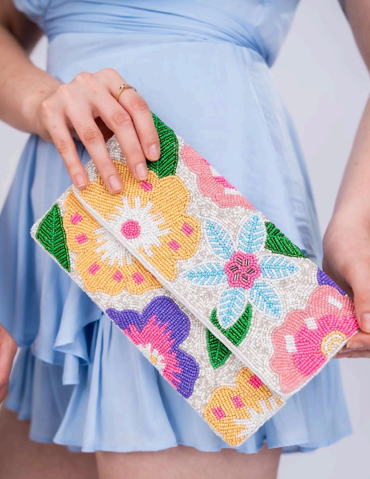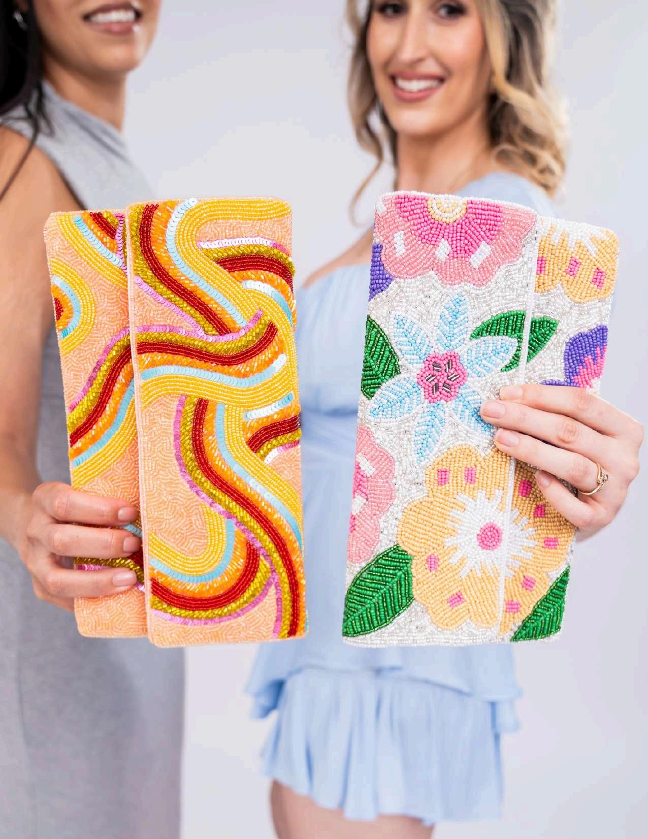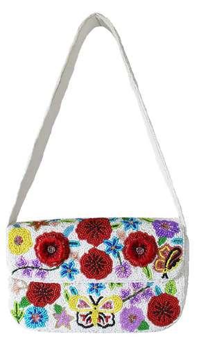 $40. Fully beaded with a 100% cotton interior, one interior wall pocket, and two magnetic snap closures. Spot clean only.