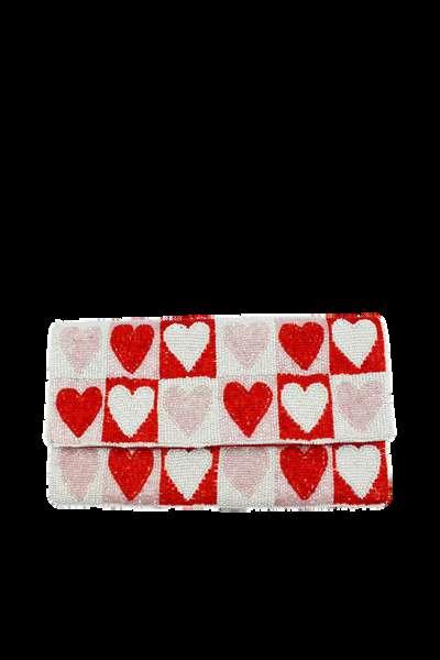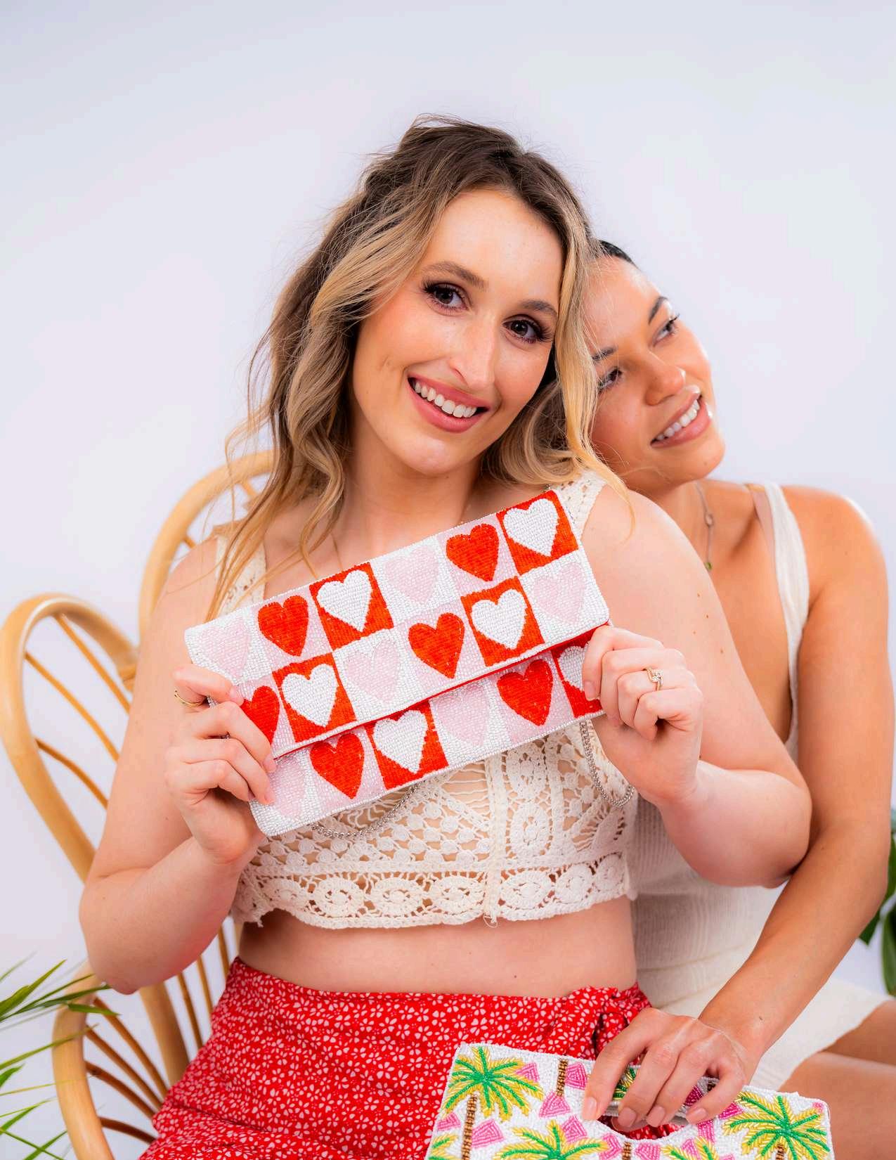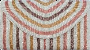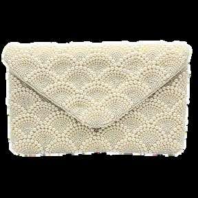 Handmade beaded clutch. Approx. 10" x 6". One interior wall pocket, one magnetic snap closure, a detachable crossbody chain, and 100% cotton backing and interior Spot clean only