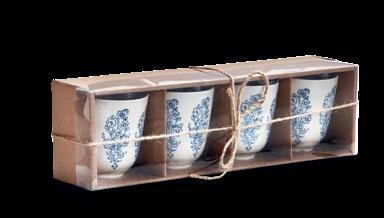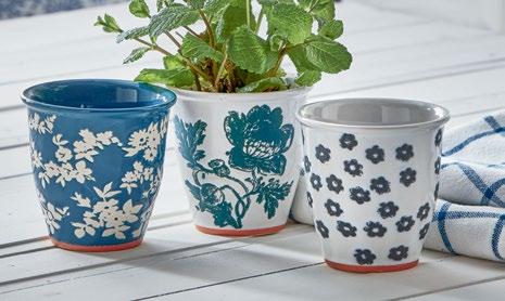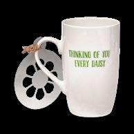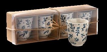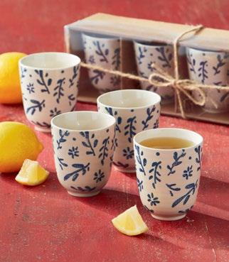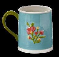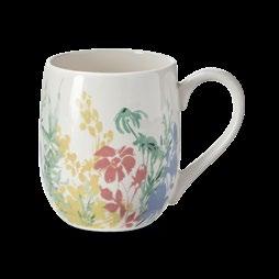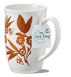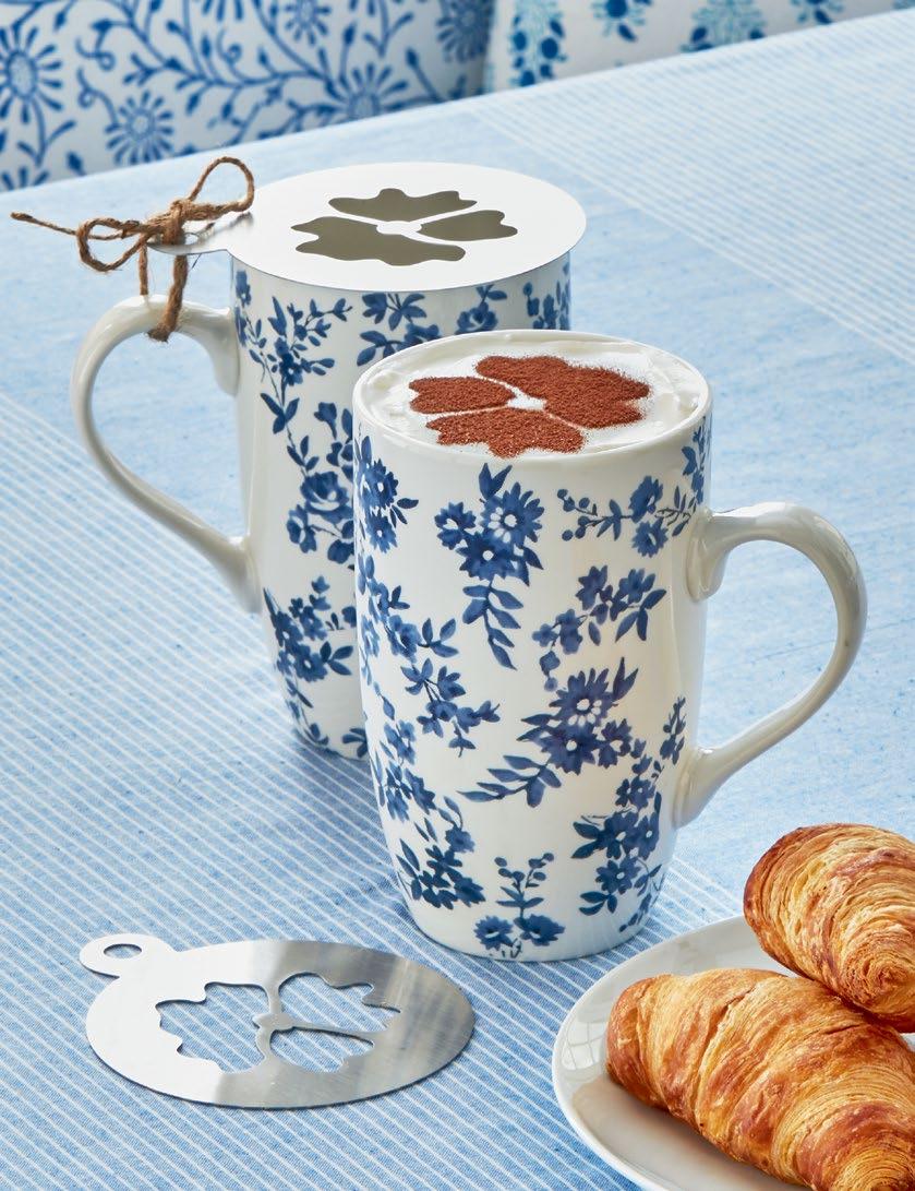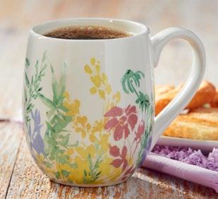 L NEW! G18238 SPRINGTIME FLORAL MUG & STENCIL SET (Multi) Bone china, stainless steel. Dishwasher safe, do not microwave. Hang tag. 3.5”L x 3.5”W x 6”H 22 oz. Pk 4/set. $7.50/set.