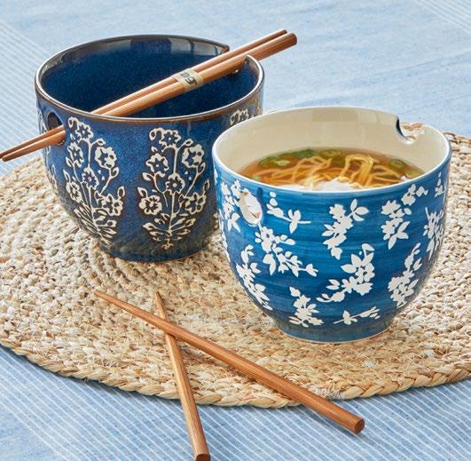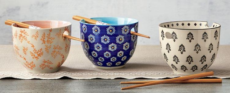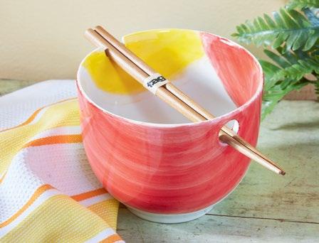 L NEW! G17990 SPRINGTIME NOODLE BOWL SET (Multi) Stoneware, bamboo. Hand paint. Bowl: dishwasher safe. May get hot in microwave; chopsticks: hand wash only. Hang tag with silicone band. 5”L x 5”W x 3.9”H 16 oz; Chopstick: 7.87”L. Pk 4/set. $8.50/set.
