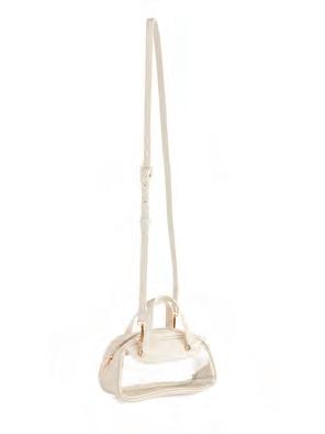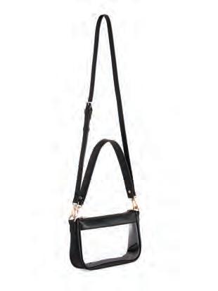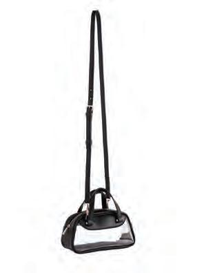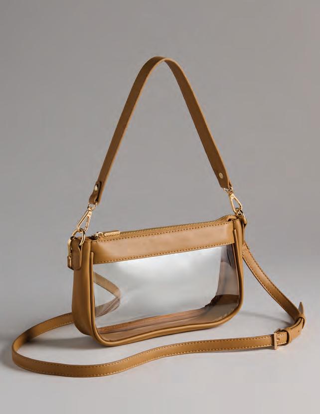L 10.5” x W 2.5” x H 6”; strap 8.5”, adj 23.5” • tpu and smooth pu; gold hardware; interchangeable straps: single shoulder strap; adjustable cross-body strap; top zip closure • China v MSRP $59 min 2 $27 ea