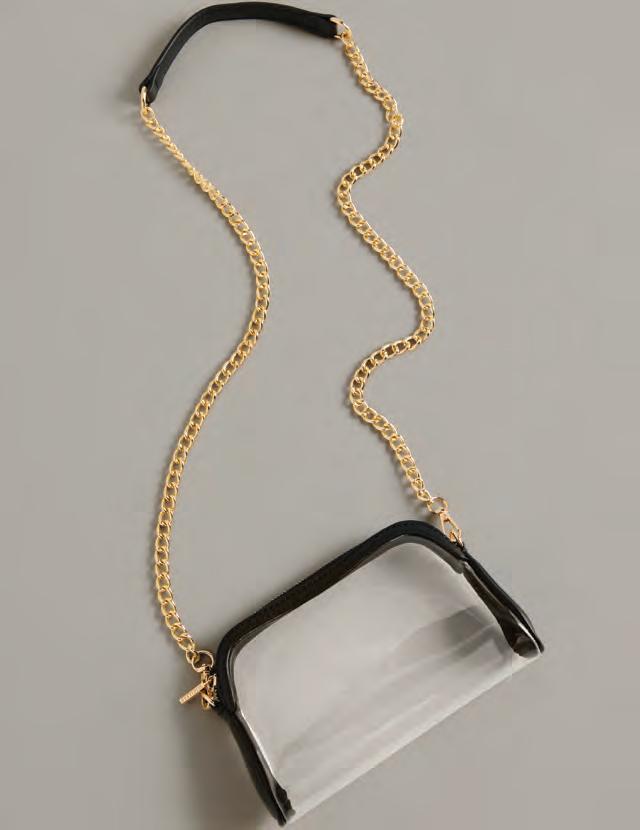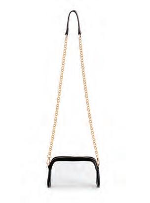 L 8.5” x W 2” x H 5.5”; strap 22.5” • tpu and smooth pu; gold hardware; detachable cross-body chain strap; top zip closure • China v MSRP $55 min 2 $24 ea