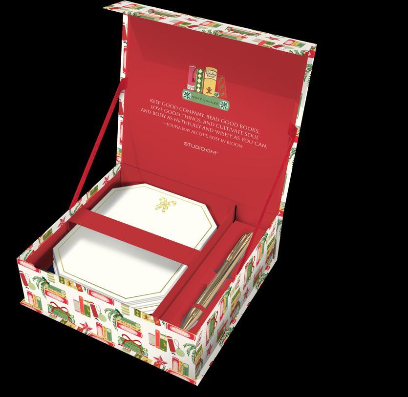 Set of 12 note cards, 12 envelopes, 12 embossed sticker seals, and 1 black ink pen