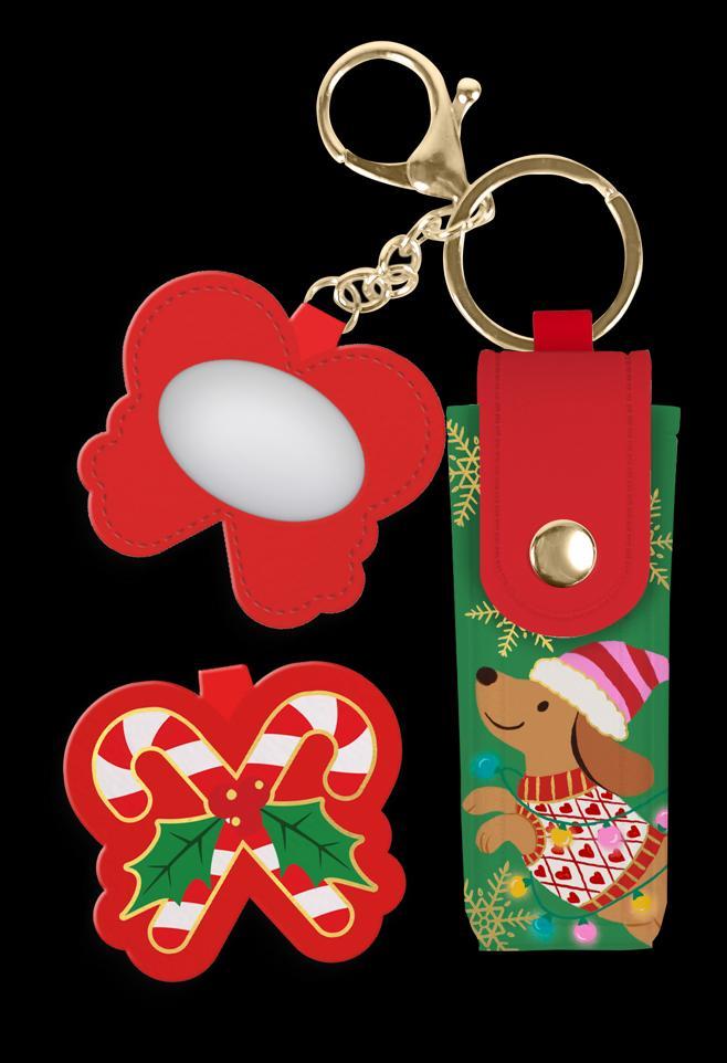 HANDY LIP BALM HOLDER CLIPS TO BAGS, BACKPACKS, OR BELT LOOPS INCLUDES A UNIQUELY SHAPED MIRROR FOR TOUCH-UPS ON THE GO