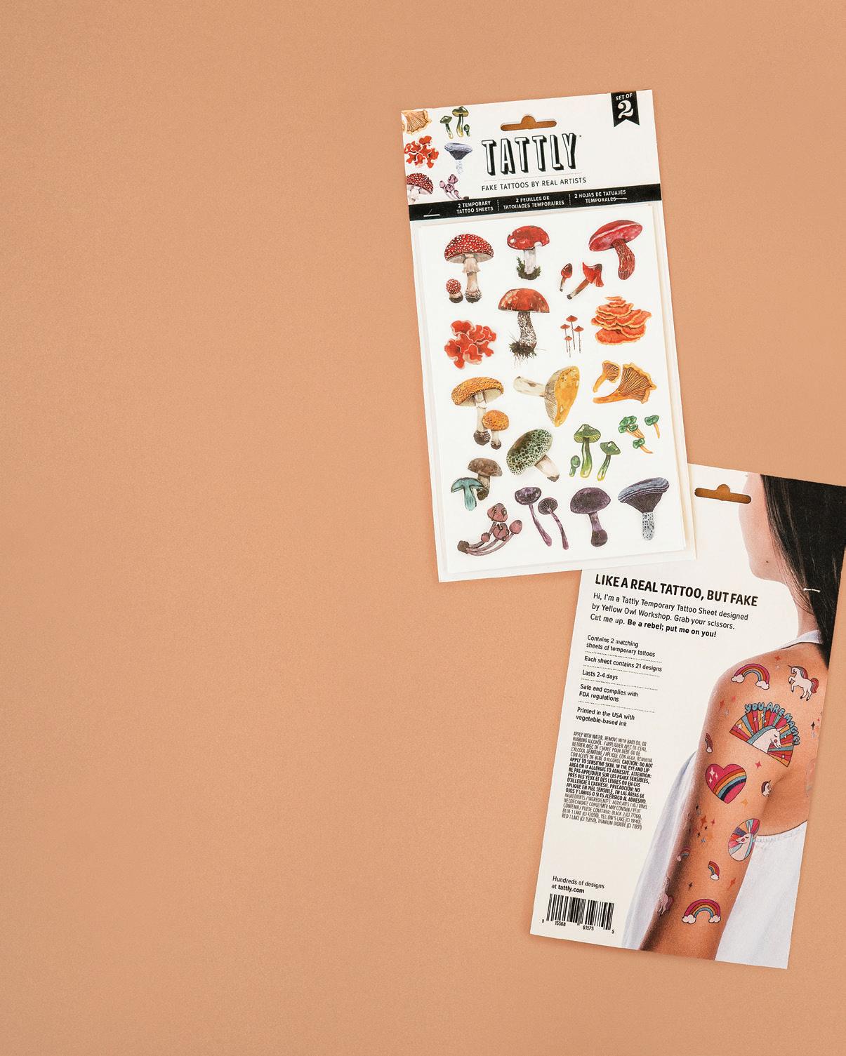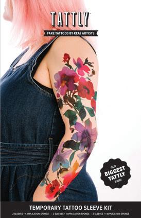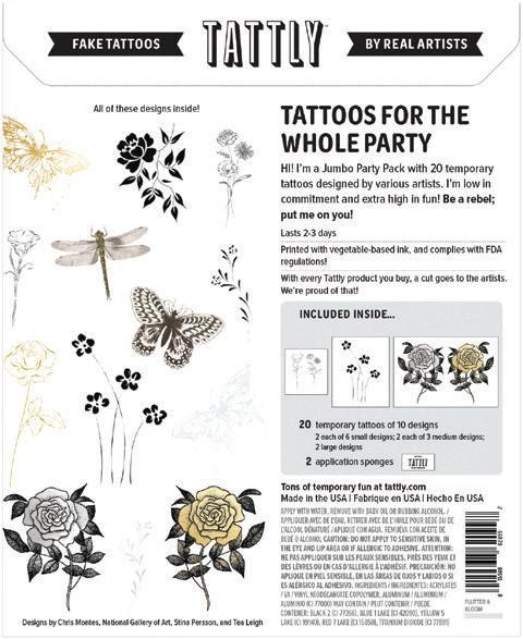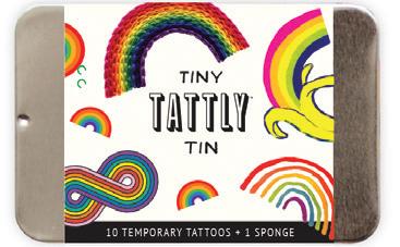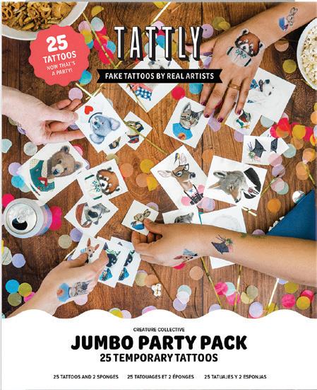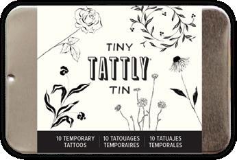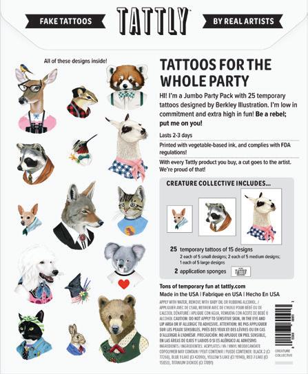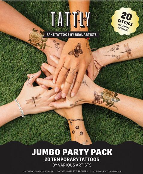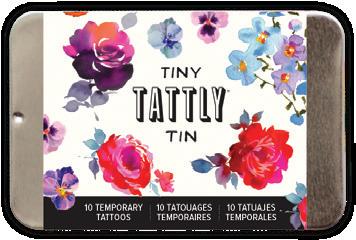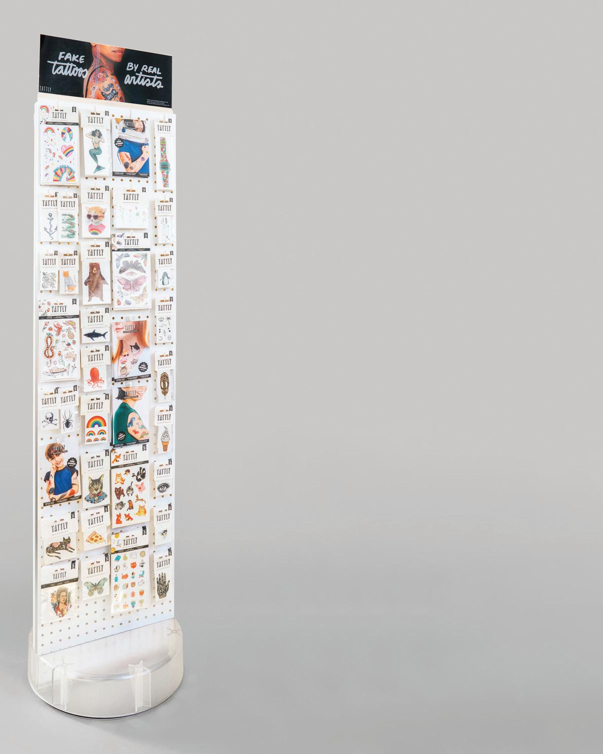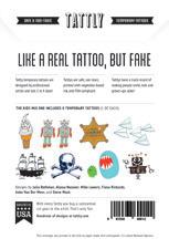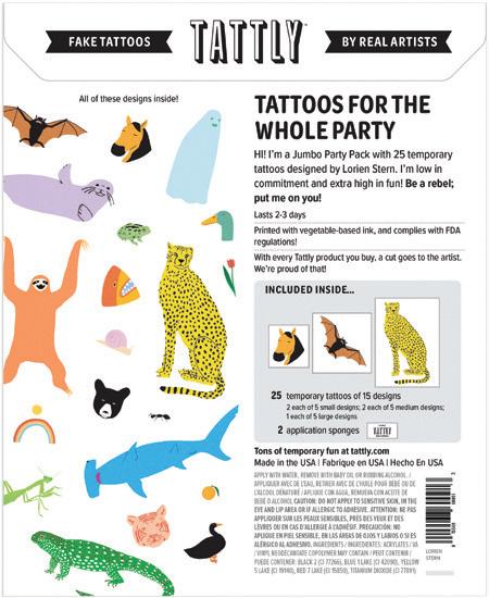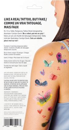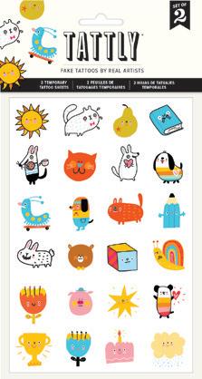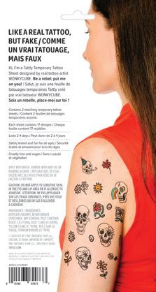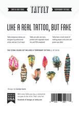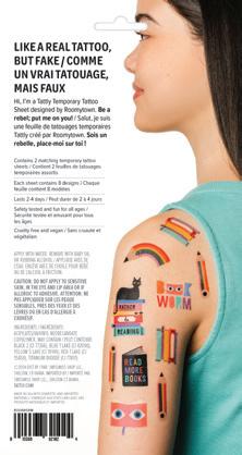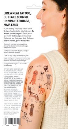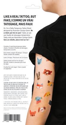 Tattly Tattoo Sheets contain multiple designs that are meant to be cut apart and shared! Each style comes with two identical sheets packaged in a polybag with its own unique backer card, featuring a full-color photo of the applied designs. All Tattoo Sheets include a sturdy hang tab that can be displayed on a pegboard or even on our special spinning display unit! (pg. 57)