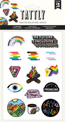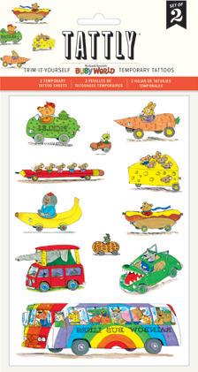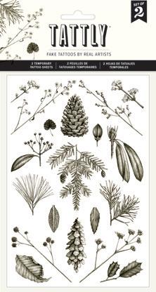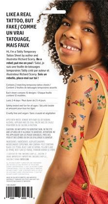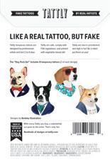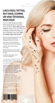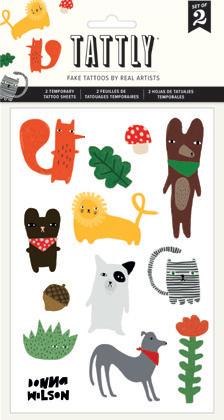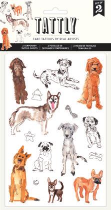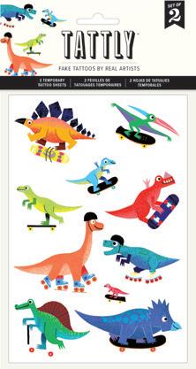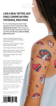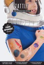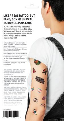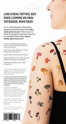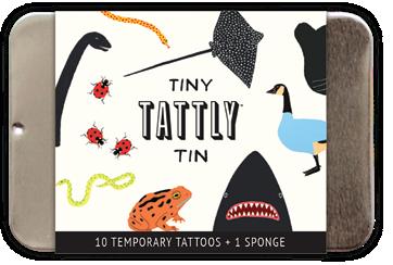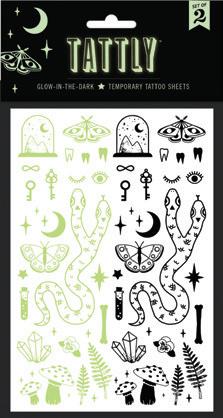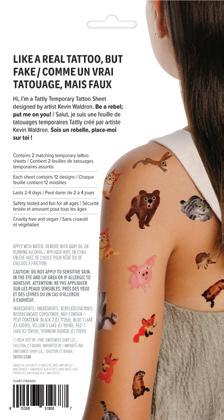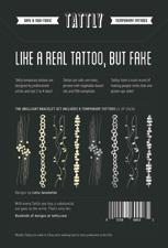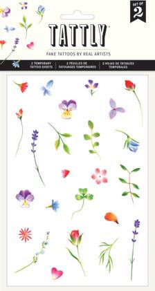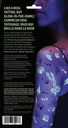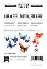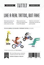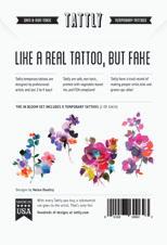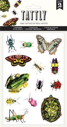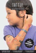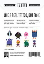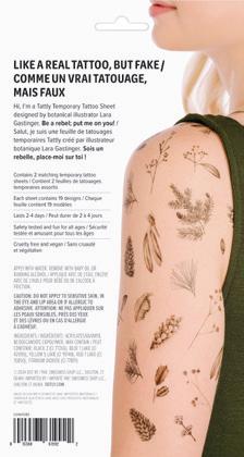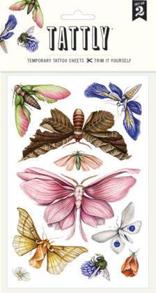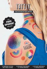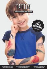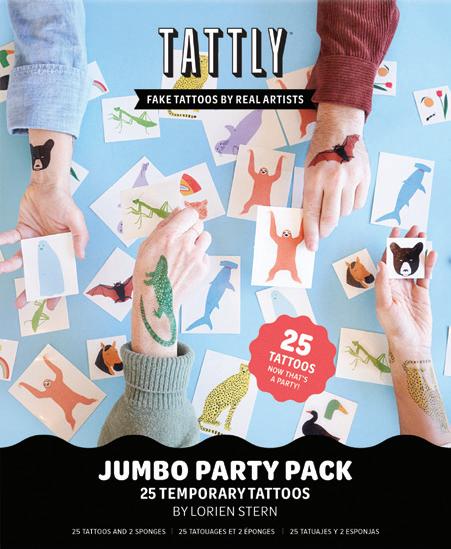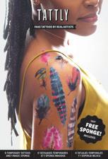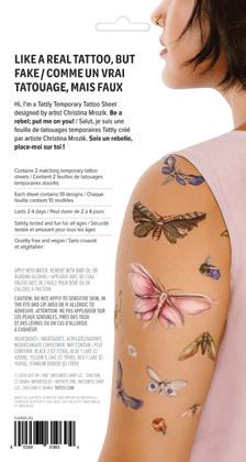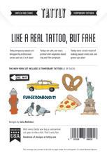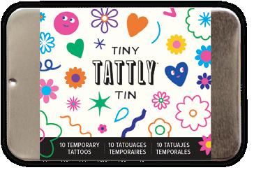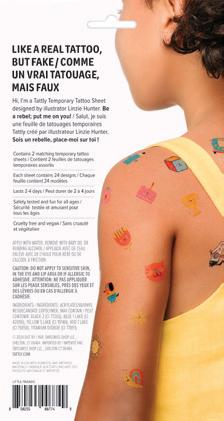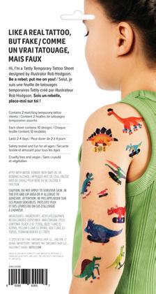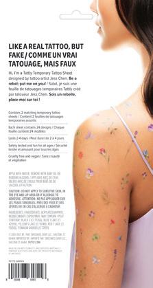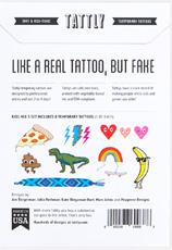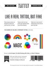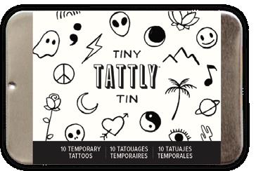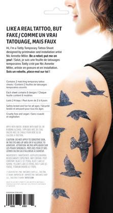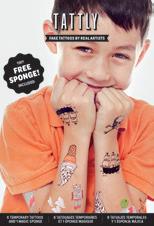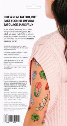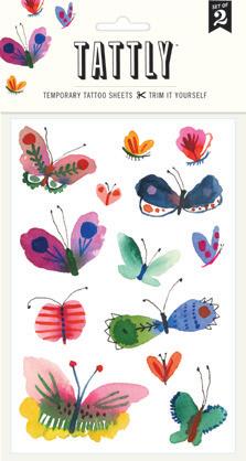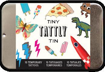Tattly Tattoo Sheets contain multiple designs that are meant to be cut apart and shared! Each style comes with two identical sheets packaged in a polybag with its own unique backer card, featuring a full-color photo of the applied designs. All Tattoo Sheets include a sturdy hang tab that can be displayed on a pegboard or even on our special spinning display unit! (pg. 57)