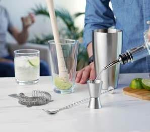 Includes Boston shaker tin & glass with m easurements, muddler, bar spoon, strainer, double jigger, ice tongs, bottle opener, 4 pourers, & 2 shot glasses