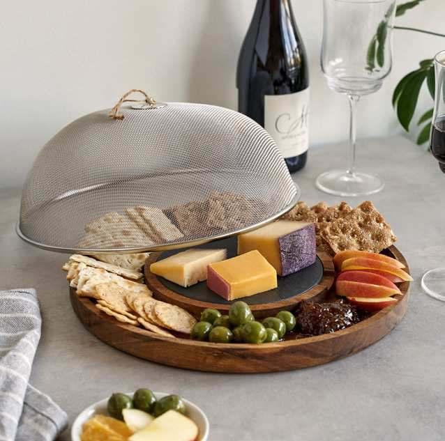 Elevate your cheese or charcuterie course with this gorgeous acacia wood cheese platter and removable slate board. A channel around the rim helps prevent spills and catch crumbs, while the mesh dome cover protects the spread from pesky flies.