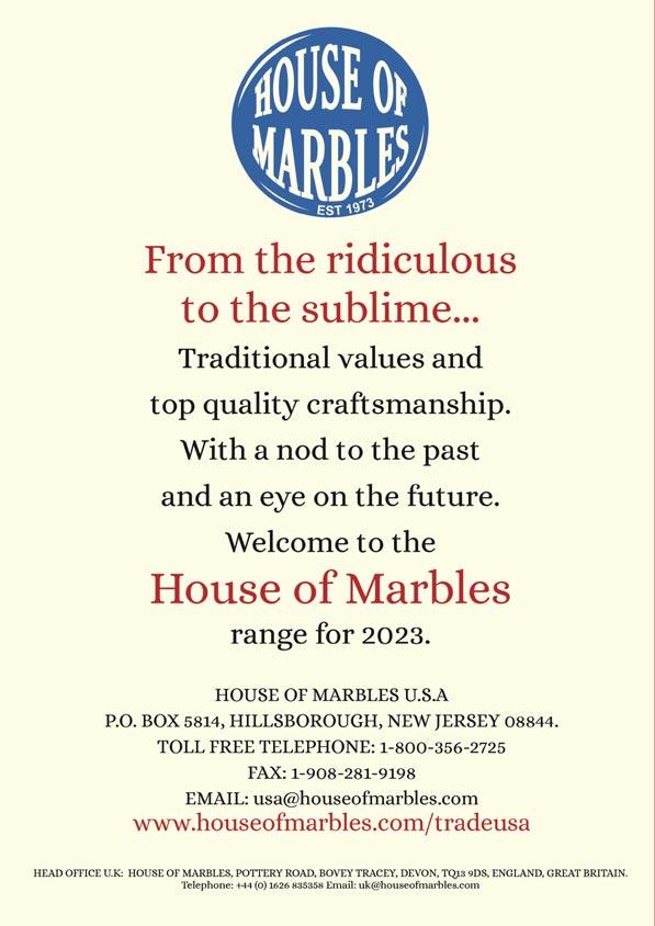 04...... P 04 Pocket Money ocket 14...... Natur 1 14 Natural World al 19........... P 1 19 Party Gifts arty Gifts & Stocking Filler & Fillers s 25...... Tiddly T 2 25 Tots ots 27...... W 2 27 Woolly Wonders oolly Wonders 28...... Puppet Book 2 28 Books s 30...... Big Splash 3 30 Splash 32...... Childhood Memories 3 32 Memories 39..... Inquisitiv 3 39 Inquisitive Minds 40....... Marbles 4 40 & Marble G & Marble Games ames HOUSE OF MARBLES: P.O. BOX 5814, HILLSBOROUGH, NEW JERSEY 08844. TOLL FREE TELEPHONE: 1-800-356-2725 • FAX: 1-908-281-9198 • EMAIL: usa@houseofmarbles.com 52..... G 52 Galactic Fantastic! lac ic 54...... Dino Might! 5 54 Dino Might! 56...... Ov 5 56 Over the Rainbow er 58...... Kites 5 58 60...... Ac 6 60 Active Fun tive 62...... Air Cr 6 62 Craft aft 64...... Adv 6 64 Adventure enture 68..... Magic, Puzzles & Jok 6 68 Puzzles & Jokes es 70...... F 7 70 Family Games amily Games 76...... T 7 76 Traditional Games raditional 78...... Christmas F 7 78 Fun un 80...... Quirk 8 80 Quirky Home & Style y Home & 84...... Brilliant Book 8 84 Books s