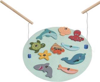 Fishing fun for small hands, with chunky magnetic wooden sea creatures plus a felt pond and two sturdy rods.