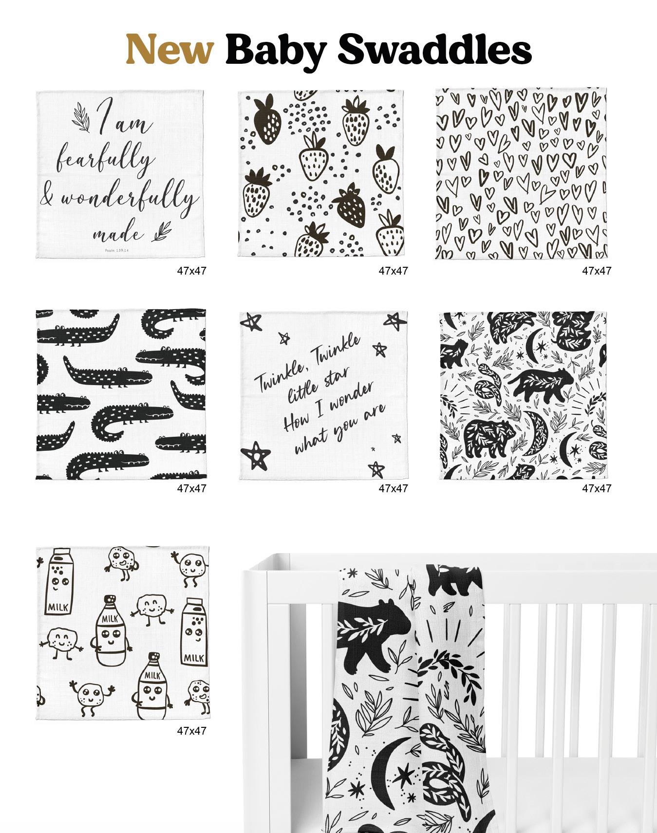 8 40025 31641 6 8 40025 31712 3 8 40025 31643 0 8 40025 31642 3 8 40025 31645 4 8 40025 31646 1 BEAR 8 40025 31644 7 HEARTS GATOR TWINKLE TWINKLE MILK + COOKIES SW-101 FEARFULLY MADE SW-107 STRAWBERRIES SW-103 SW-102 SW-105 SW-106 SW-104 Swaddles • $12 ea, min qty 3 47” × 47” • 100% cotton • prewashed muslin (individually packaged) 33