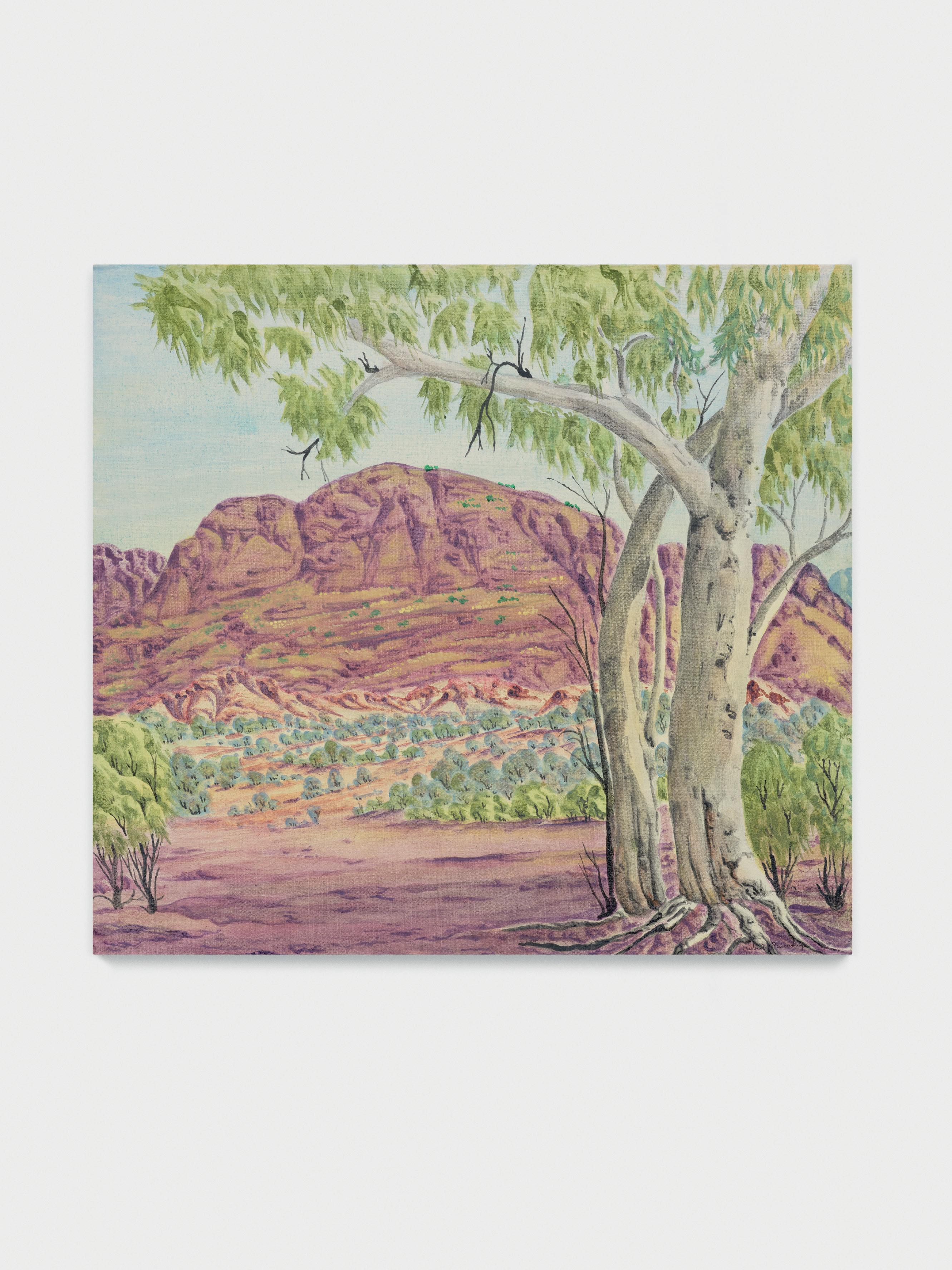 One legacy of this coexistence is the Hermannsburg School, an artistic movement and style of painting pioneered by a non-Indigenous Australian watercolour artist, Rex Battarbee, and Pareroultja’s great grandfather's second wife's grandson, Albert Namatjira. Having seen Battarbee’s paintings in 1934, Namatjira approached the artist, asking for artistic instruction and advice. Battarbee obliged, and Namatjira then rapidly absorbed and developed his own representational style, producing works that now stand as archetypes of the Hermannsburg School. Pareroultja's father and uncles, in turn, received artistic tuition from Namatjira, as did Namatjira's children. Although, of course, each exponent has their own visual lexicon, what unites almost all Hermannsburg practitioners is a hybridity of one-point perspective European landscape painting, and the earth-bound philosophy of the Arrernte. The aesthetic – luminous, almost hallucinatory in its effect, but always representational – is emblematic of the cultural exchange that took place around the Hermannsburg Mission in the early to mid-twentieth century. No known painting by an Indigenous Australian had, until this moment in the 1930s, utilised the one-point perspective of European landscape painting, a compositional framework which eyes adapted to the Western canon perhaps take for granted. Paintings such as Pareroultja’s Ghost Gums & James Range reconcile the perspectives – conceptual and compositional – of two different cultures, and in that hybridity, produce something unique to the Contemporary Indigenous Art Movement.