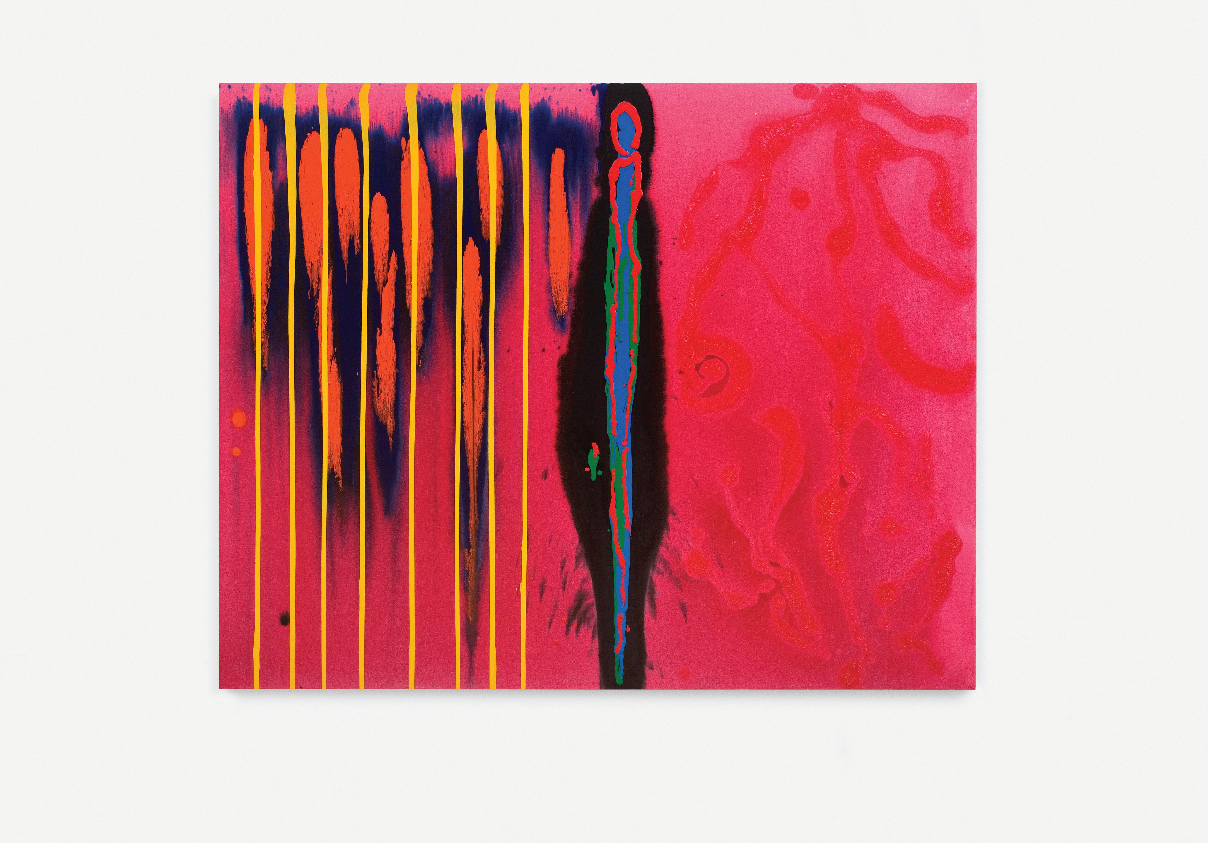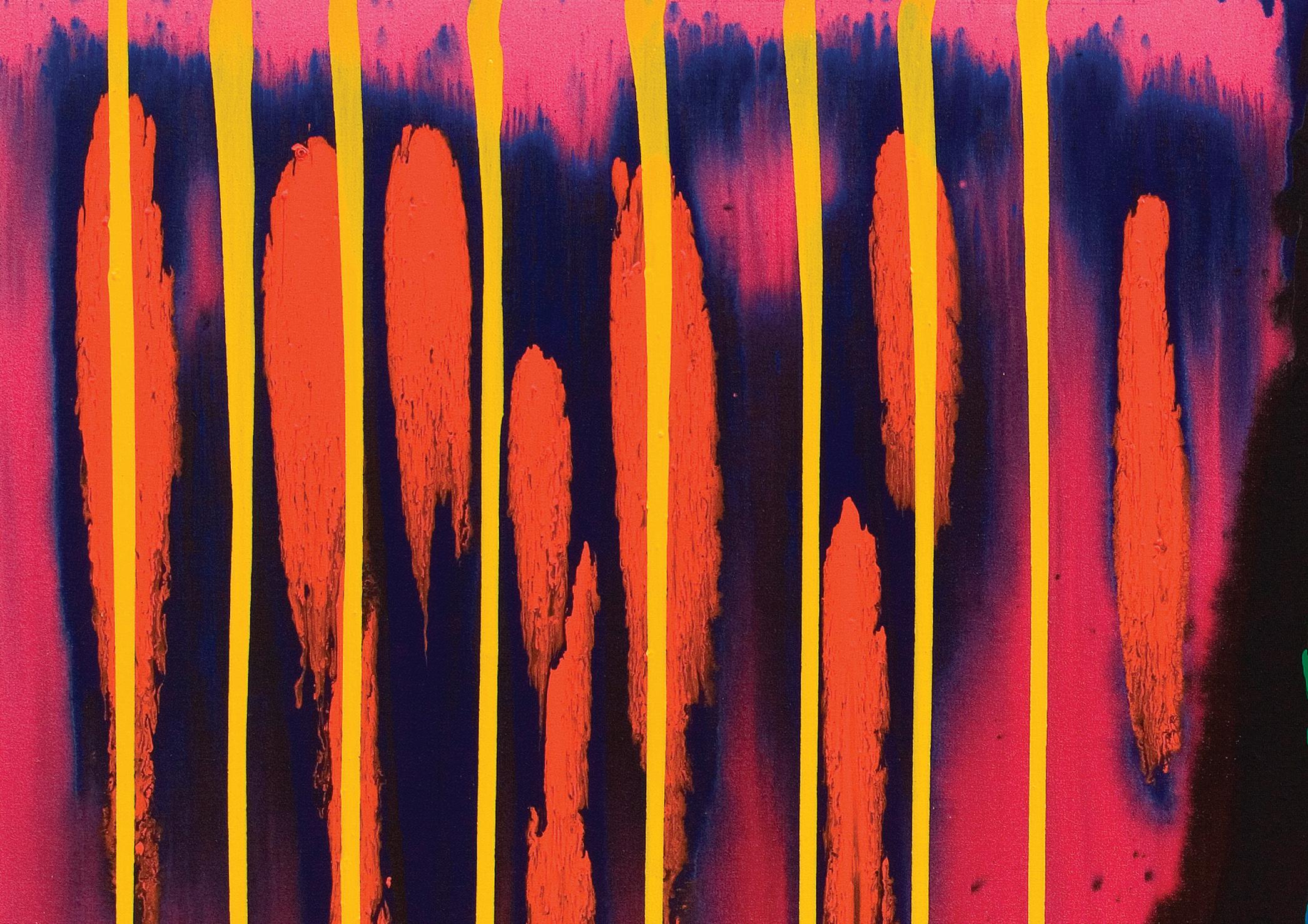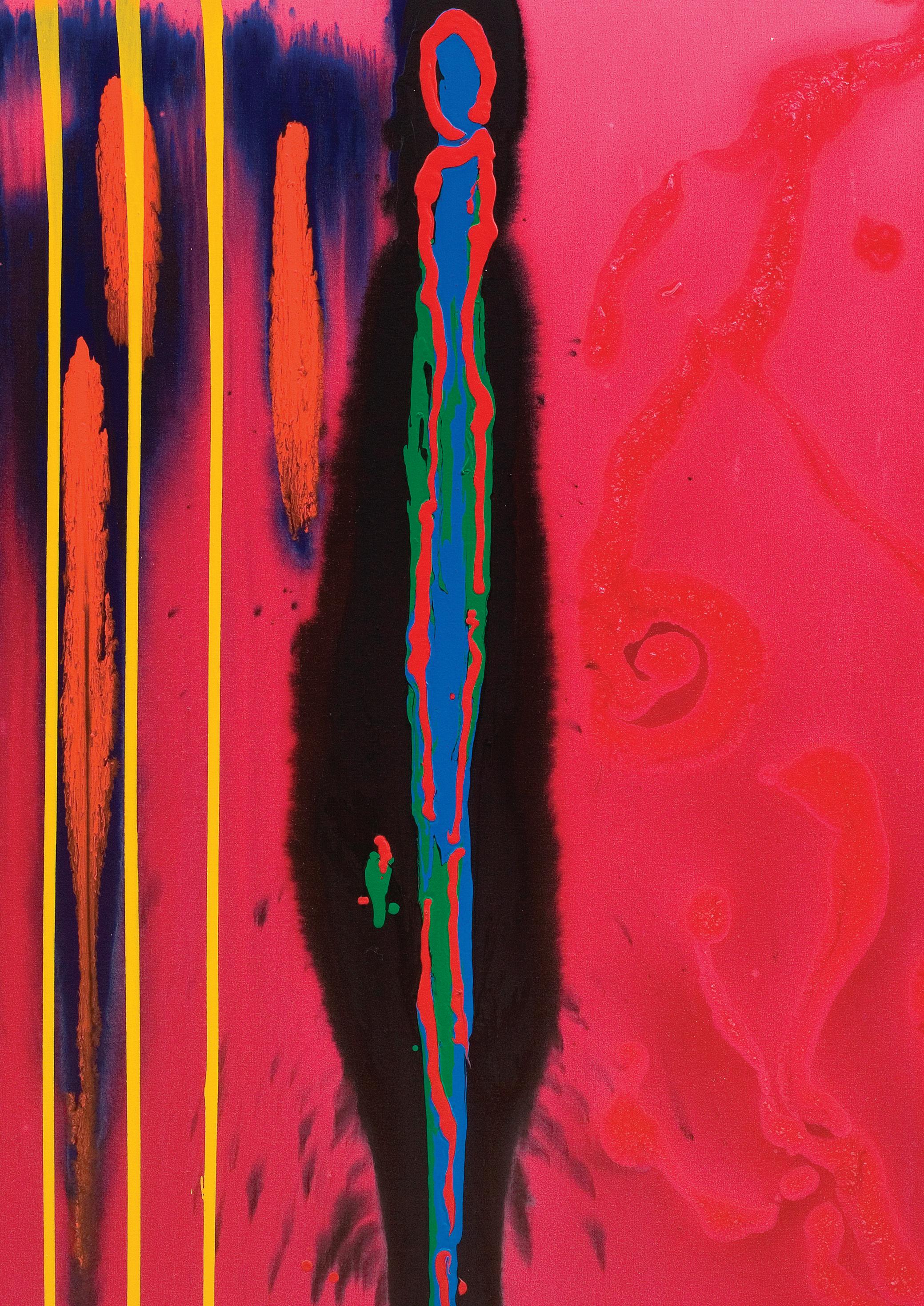 While Hoyland’s paintings from the 1960s in the aftermath of these exhibitions was received with great acclaim, works painted later in his career carry a freedom from the organisation and concreteness that earlier pieces possess. His paintings gradually became looser and more expressive, their emotiveness fuelled by marks in which gesture is not hidden, and vibrant colour and elusive ‘figures’ are made of acrylic impasto. The Visitor (2001) is typical of this development in Hoyland’s practice. Hoyland only began giving descriptive titles to his works in the early 1970s and this inevitably contributes to their interpretation. The Visitor is divided in two by a central inky cavity running vertically, perhaps a doorway, in which an elongated body is suggested by green and blue paint and a red outline. This figure situates the viewer, and we are immediately confronted by an encounter. Hoyland treats the two halves of the painting as spaces for different manners of expression. He paints vertical lines on the left in traffic-light yellow, producing a sharp, consistent beat, while contrasting these with automatic, calligraphic marks on the right, which are more lyrical. Behind the yellow fencing, smears and bleeds of orange and blue paint create a sinister effect, while also alluding to a composition of sustained notes. The right side creates a mystical atmosphere, stimulating an internal debate as to whether the apparition is dangerous or magical. The central figure oozes this duality.