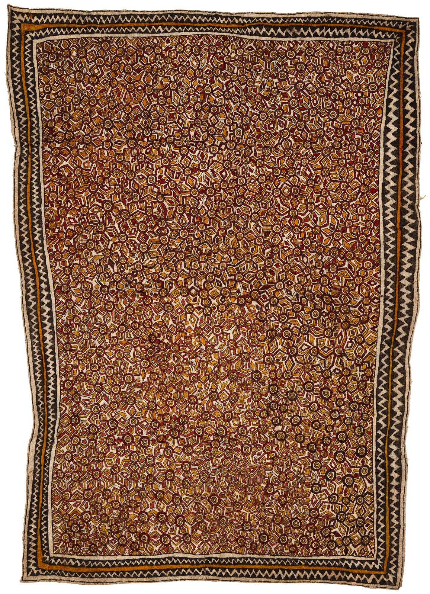 Barbara Rauno (Inasu) is from an entirely different clan and village which tends to lean towards a far more geometric sensibility, yet one that is still loose and organic. The results of such complex compositions can be phenomenal. She was taught to paint by her father, Albert Sirimi (Nanati), and she paints her designs with ever-increasing delicacy and sensitivity. This piece is a fantastic example of recent developments within her painting practice where she has taken nuni'e, the design of the eye, from a man’s bamboo smoking pipe, and then adapted and elaborated it, as if it were unfolding and expanding, and the design has now become a completely new iteration on the barkcloth. Really, she is showing us her culture in a new light.
