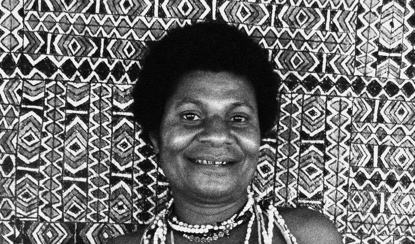 Elvina Naumo (c. 1994) is the daughter of Mary Naumo, former Chief of Ematé clan women and a highly respected barkcloth artist. She was taught to paint certain designs from her mother before she passed away. Naumo is becoming an artist of considerable talent and ambition, often painting highly detailed designs on large scales.