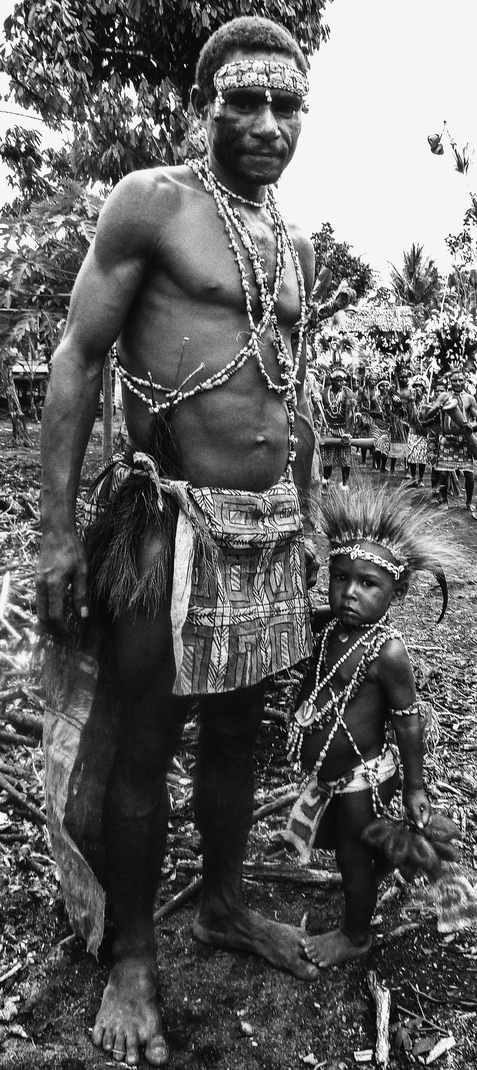 Left: Father & son wearing barkcloth givais (loincloths), painted by Sarah Ugibari, 2010. Photo by Brennan King, courtesy of Ömie Artists.