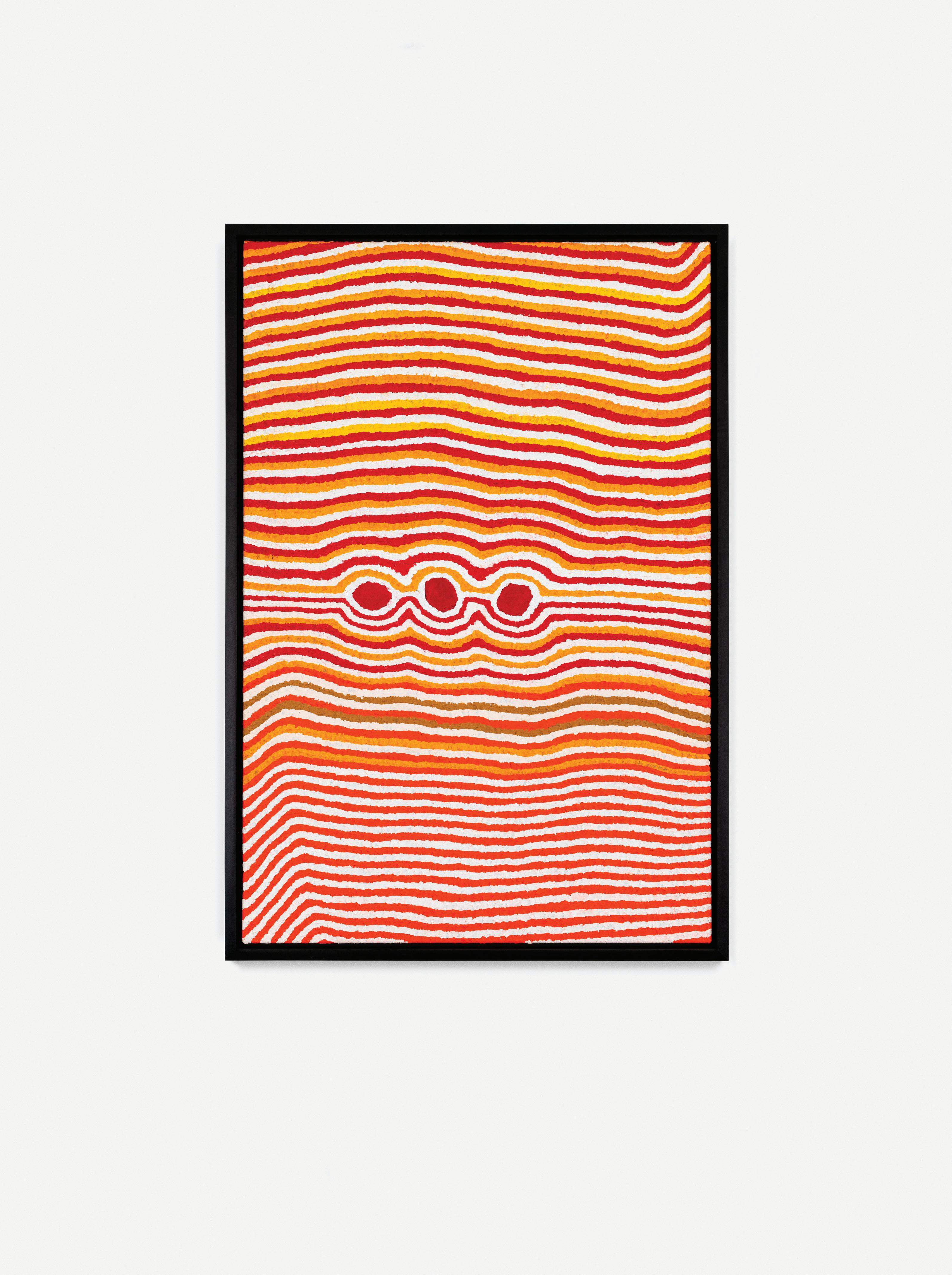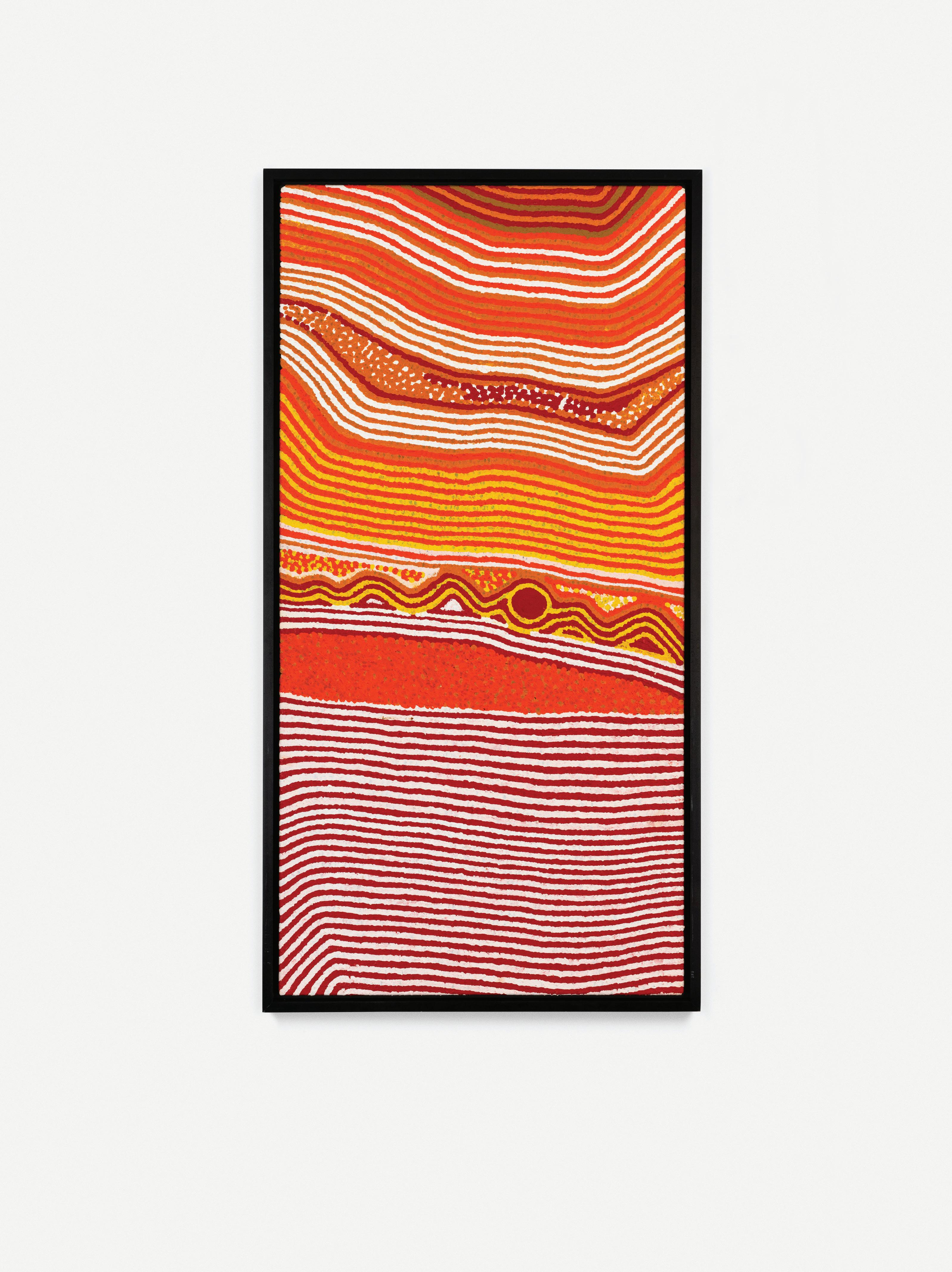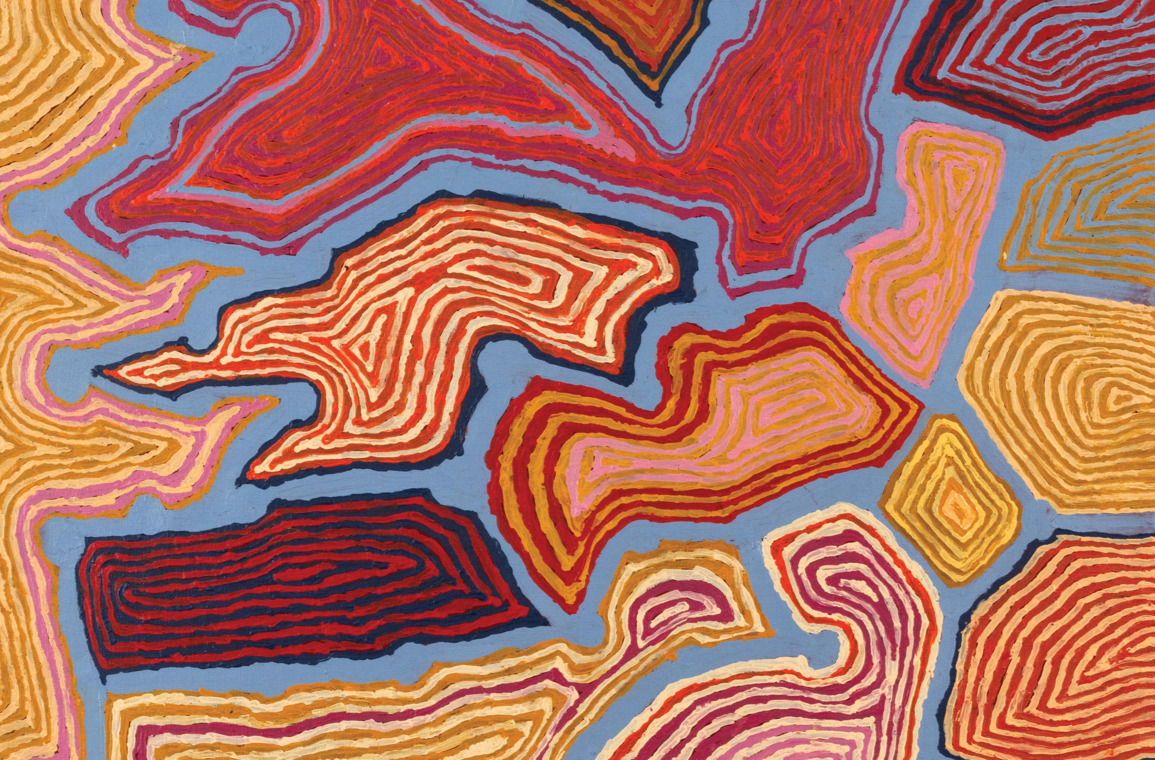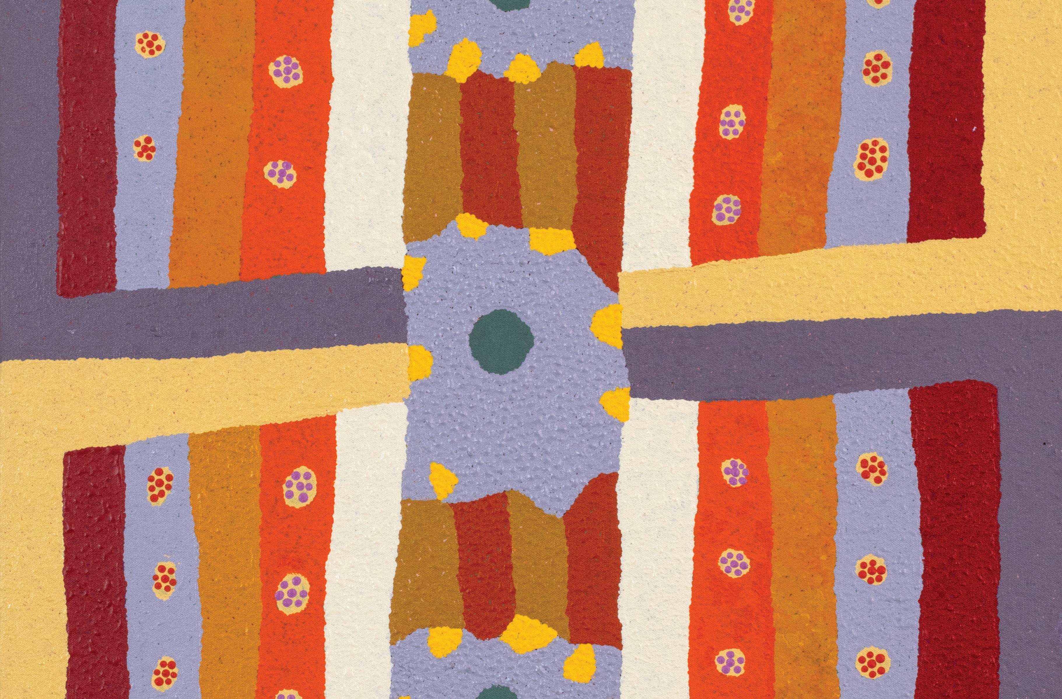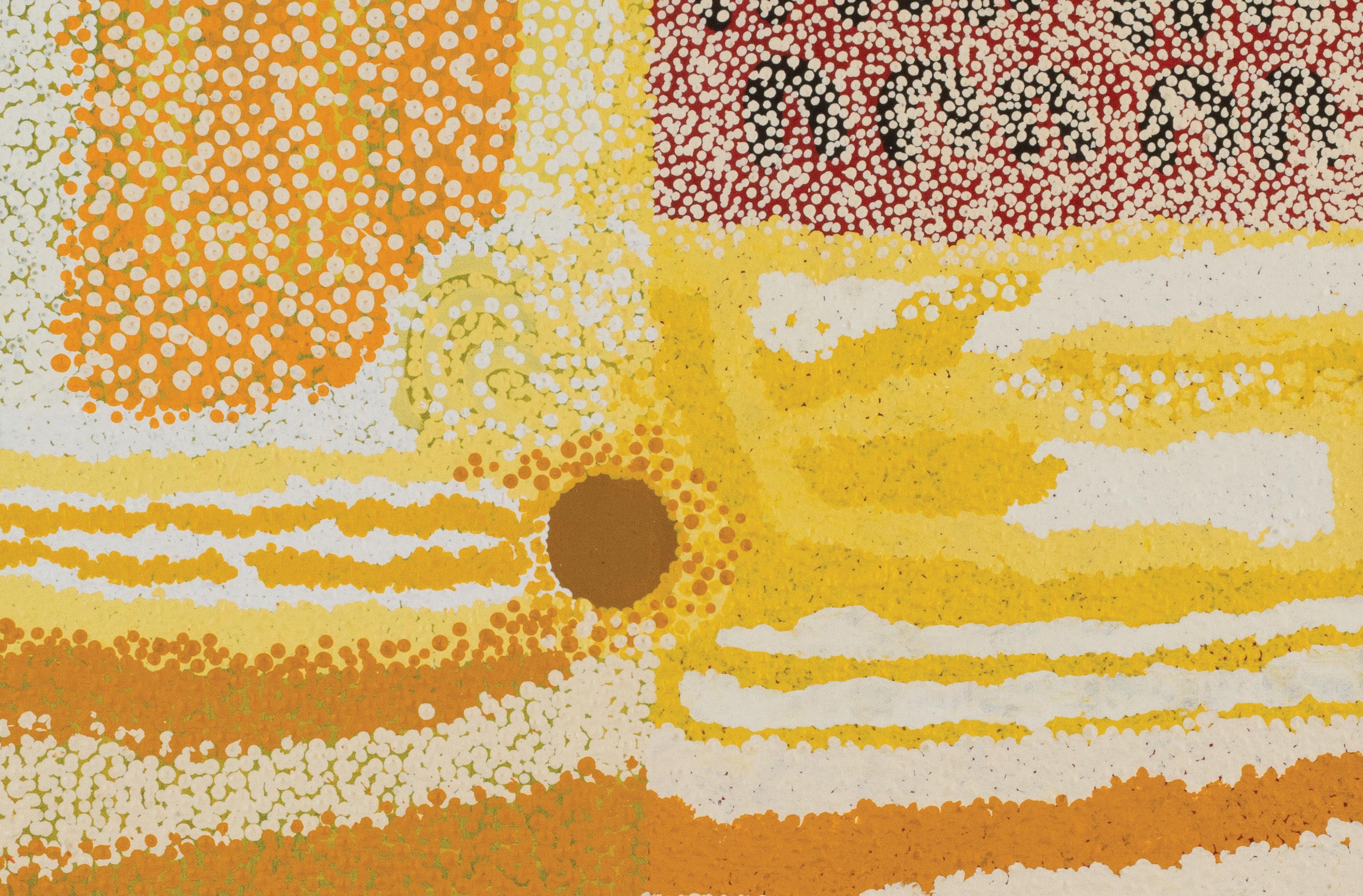 Water, particularly as a generative life force, is the central motif in almost all of the exhibiting artists’ work. In Winpurpurla I , Imelda Gugaman Yukenbarri depicts seven tjurnu as irregularly shaped circles. Through the use of pattern and its absence, she establishes these sources of water as points of origin for the surrounding abundance of bush foods, rendering them as unmodulated fields of colour, while articulating the land through a peppering of dots. It is an aesthetic approach informed by the artistic practices of her parents, specifically an even more dense dotting style pioneered by her mother, Lucy Napanangka Yukenbarri, coined kinti kinti (close close). Beyond its centrality in the life and work of the exhibiting artists, water is also a useful and resonant metaphor for understanding the conceptual focus of Waltja: One Family In the work of the exhibiting artists, it conveys ancestral stories and the flow of an aesthetic language between family members: a cultural and artistic inheritance, and its evolution.