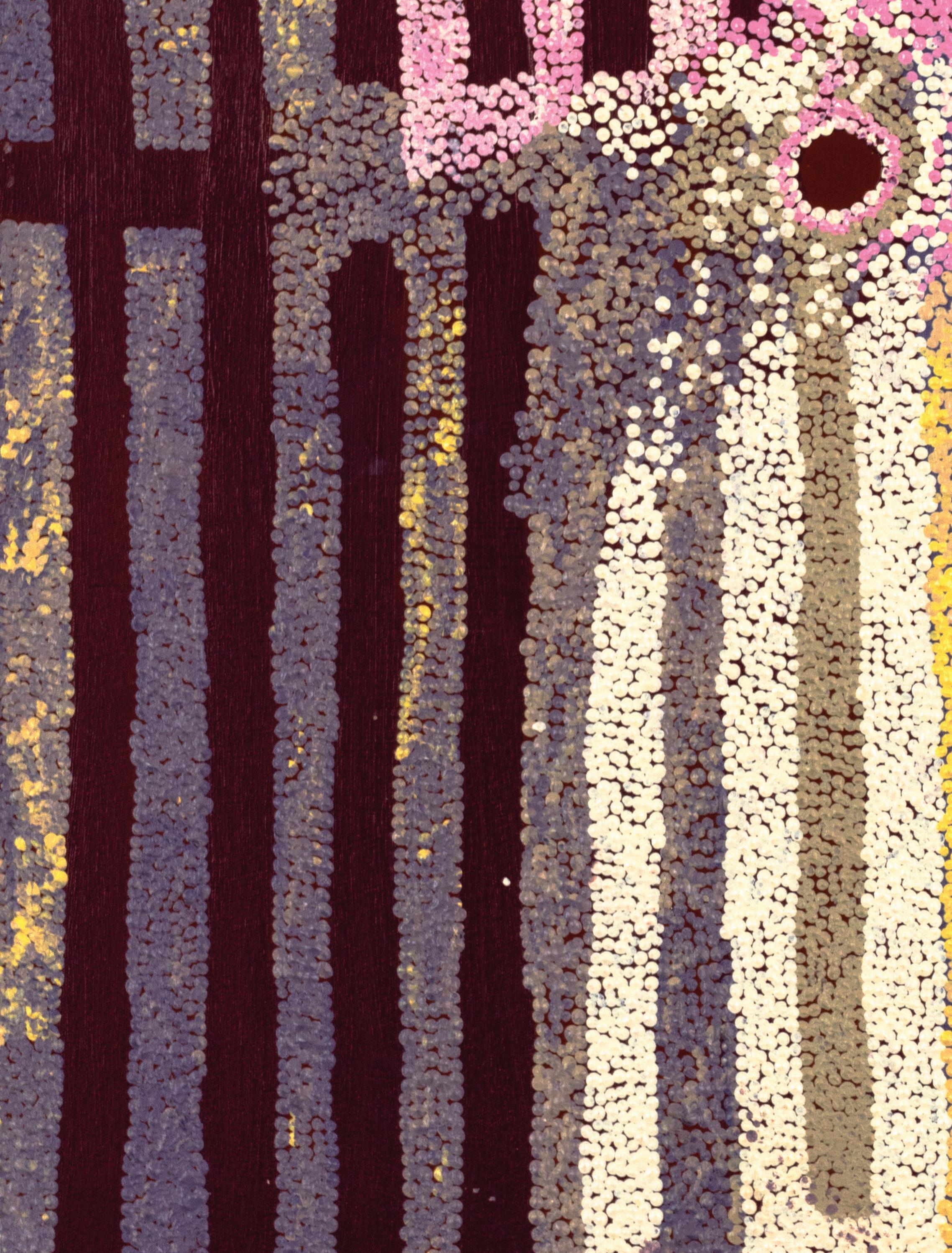 Imelda Gugaman Yukenbarri, Winpurpurla (Bushtucker) I (detail), 2024, acrylic on linen, 120cm x 40cm. Image courtesy of Sergey Novikov.