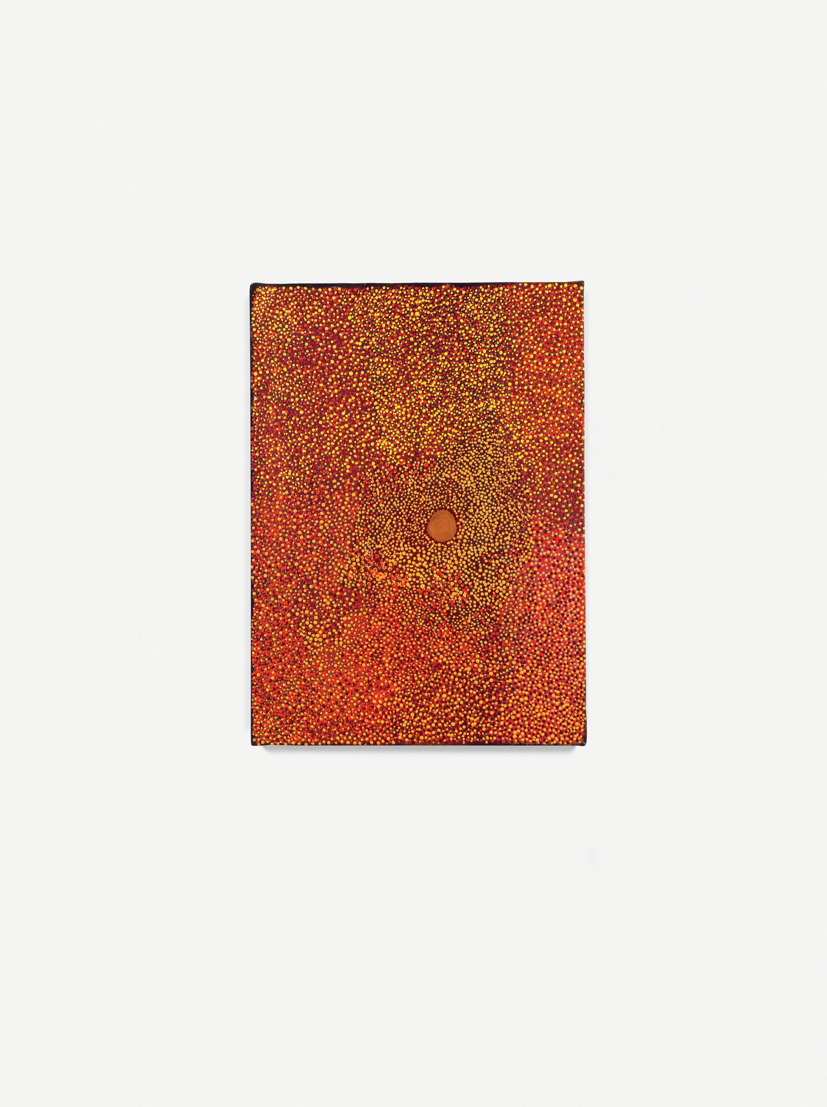 We see this difference in two paintings from Waltja: One Family: Lucy’s Marpa 01 (2002) and Helicopter’s Wangkartu 05 (2008). Both paintings are composed around a central node, a waterhole, and employ a similar palette comprised of orange, red, yellow and white acrylic. While in Lucy’s work, there is a sense of the central node, painted in black, pulling in what surrounds it, in Helicopter’s, guiding lines move the viewer’s eyes from one vertical side of the canvas to the other, over and through the painting’s central node. This difference in force and structure is a defining feature of Lucy and Helicopter’s individual practices at this point in the early 2000s. We can see Lucy practicing her dotting technique in a very physical way, using different strands of colour to carve out masses in Marpa 01 where, for example, in the upper right section of the painting, she layers white over yellow, red over yellow. The tugging and tucking of these ribbons of colour creates a dynamic composition of relief and recession, like a complex weave, or a skeletal or organ system. Helicopter also seems to have painted Wangkartu 05 sequentially, using one colour to form parallel lines before starting with another. His dotting technique conversely creates a general, unidirectional movement across the canvas and licks of paint indicate where he has lifted the paintbrush between each dot. The effect of this is not dissimilar to sand accumulating around vegetation and rock formations when winds carry it through the desert, which creates dunes and hills.