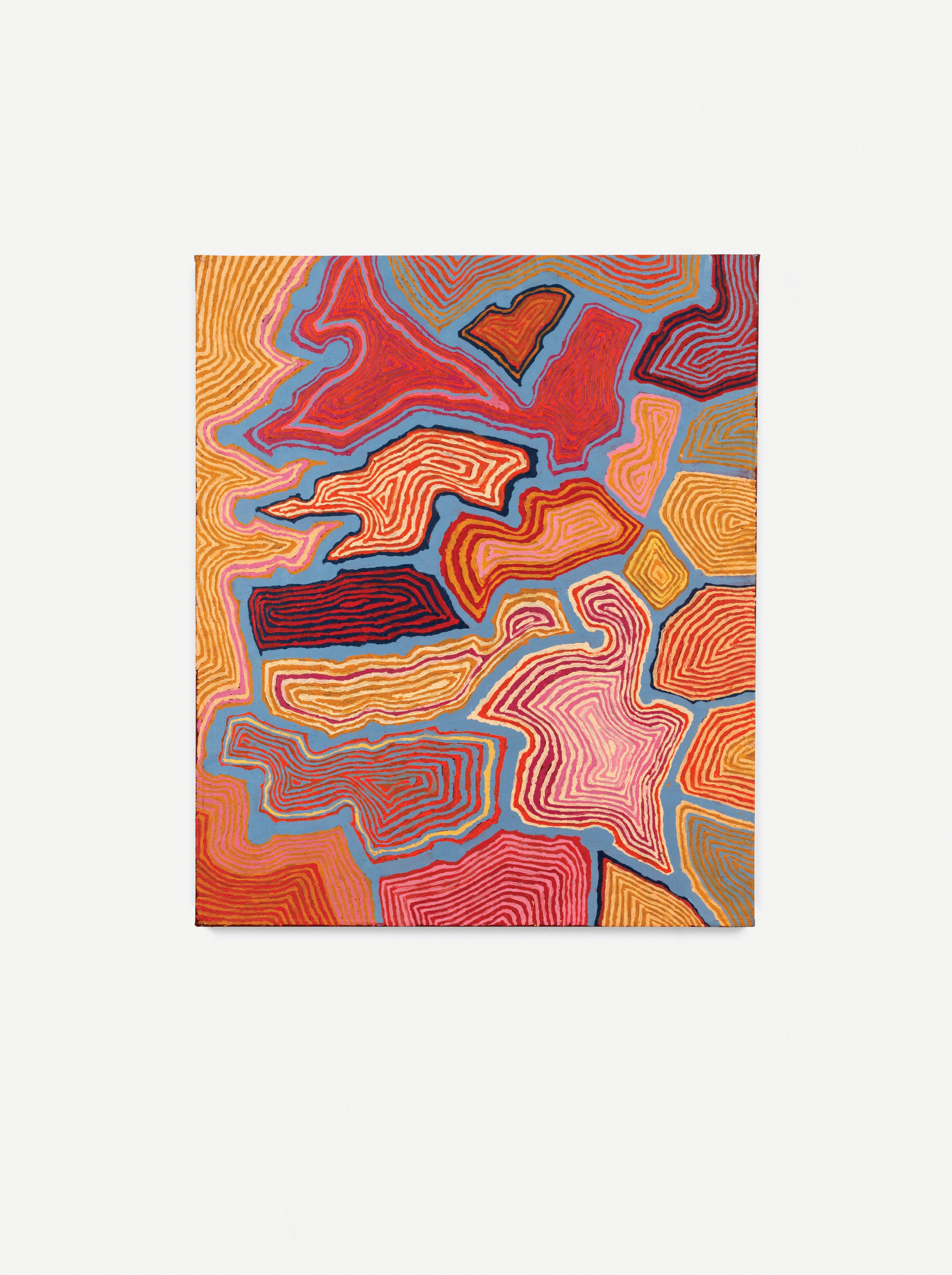 tali (sandhills) and tjurnu (soakwater), which he depicts topographically in a distinct linear style. In Wangkartu a representation of Tjungurrayi’s traditional Country, south-west of Wirrimanu in the Great Sandy Desert, sandhills painted in red, orange and pink sit within a light blue outline, representing the flow of water which, though sparse in this region, still nourishes the land, as well as Tjungurrayi’s kin and community. The effect of the concentric linework is twofold, both mimicking the undulating sandhills of Wangkartu and evoking a sense of pulsating life. The painting seems to embody the concept of Waltja expressing the interrelation of water, life and landscape and creating a potent metaphor for sustaining and enriching connections between places and people.