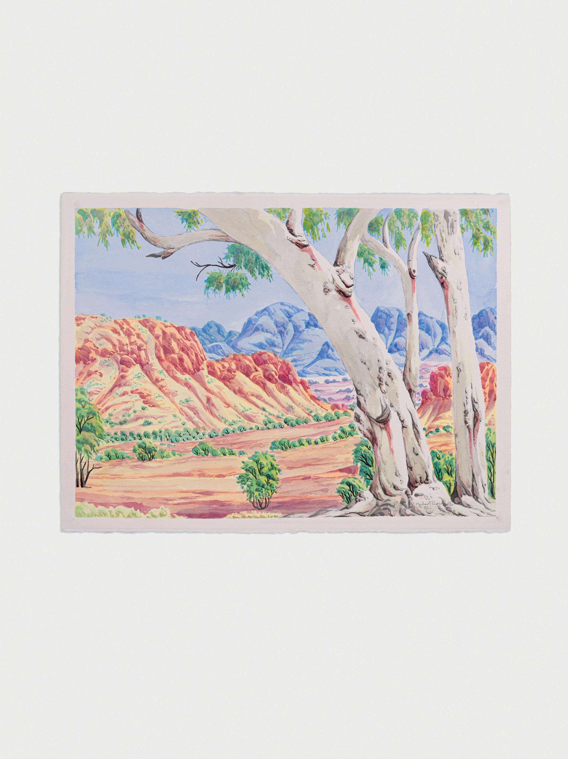 Hubert Pareroultja, Ghost Gum & James Range 2024, watercolour on paper, 52cm x 71cm. Image courtesy of Ken McGregor.