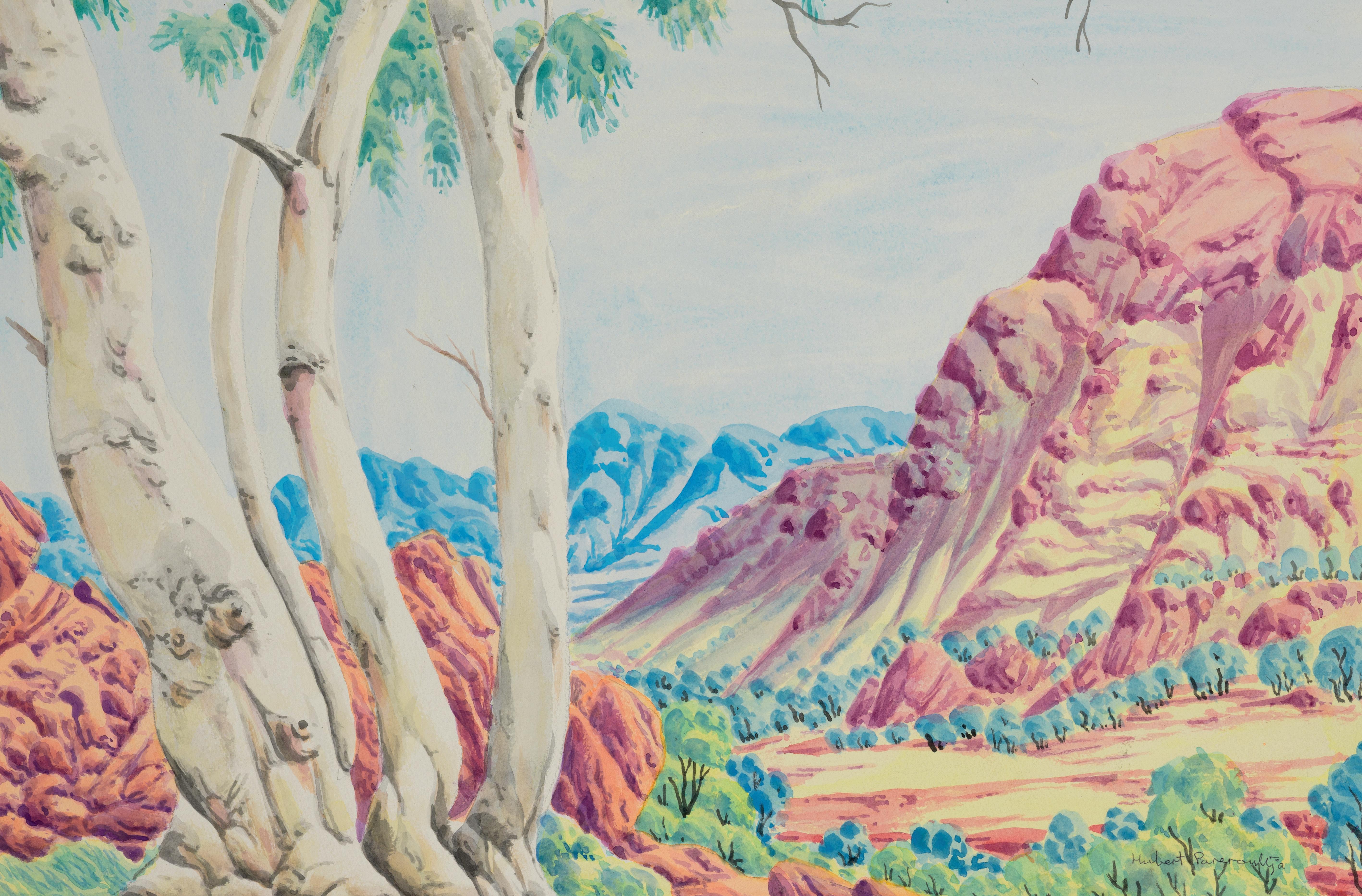 One legacy of this coexistence is the Hermannsburg School, an artistic movement and style of painting pioneered by a non-Indigenous Australian watercolour artist, Rex Battarbee, and Pareroultja’s great grandfather's second wife's grandson, Albert Namatjira. Having seen Battarbee’s paintings in 1934, Namatjira approached the artist, asking for artistic instruction and advice. Battarbee obliged, and Namatjira then rapidly absorbed and developed his own representational style, producing works that now stand as archetypes of the Hermannsburg School. Pareroultja's father and uncles, in turn, received artistic tuition from Namatjira, as did Namatjira's children. Although, of course, each exponent has their own visual lexicon, what unites almost all Hermannsburg practitioners is a hybridity of one-point perspective European landscape painting, and the earth-bound philosophy of the Arrernte. The aesthetic – luminous, almost hallucinatory in its effect, but always representational – is emblematic of the cultural exchange that took place around the Hermannsburg Mission in the early to mid-twentieth century. No known painting by an Indigenous Australian had, until this moment in the 1930s, utilised the one-point perspective of European landscape painting, a compositional framework which eyes adapted to the Western canon perhaps take for granted. Paintings such as Pareroultja’s Ghost Gums & James Range reconcile the perspectives – conceptual and compositional – of two different cultures, and in that hybridity, produce something unique to the Contemporary Indigenous Art Movement.