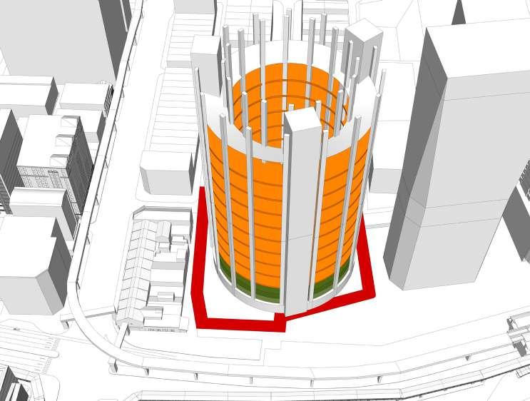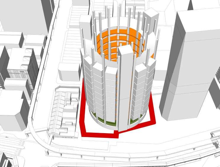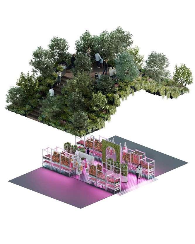 Vertical protrution of levels. Lower level as urban farm, higher level as residential