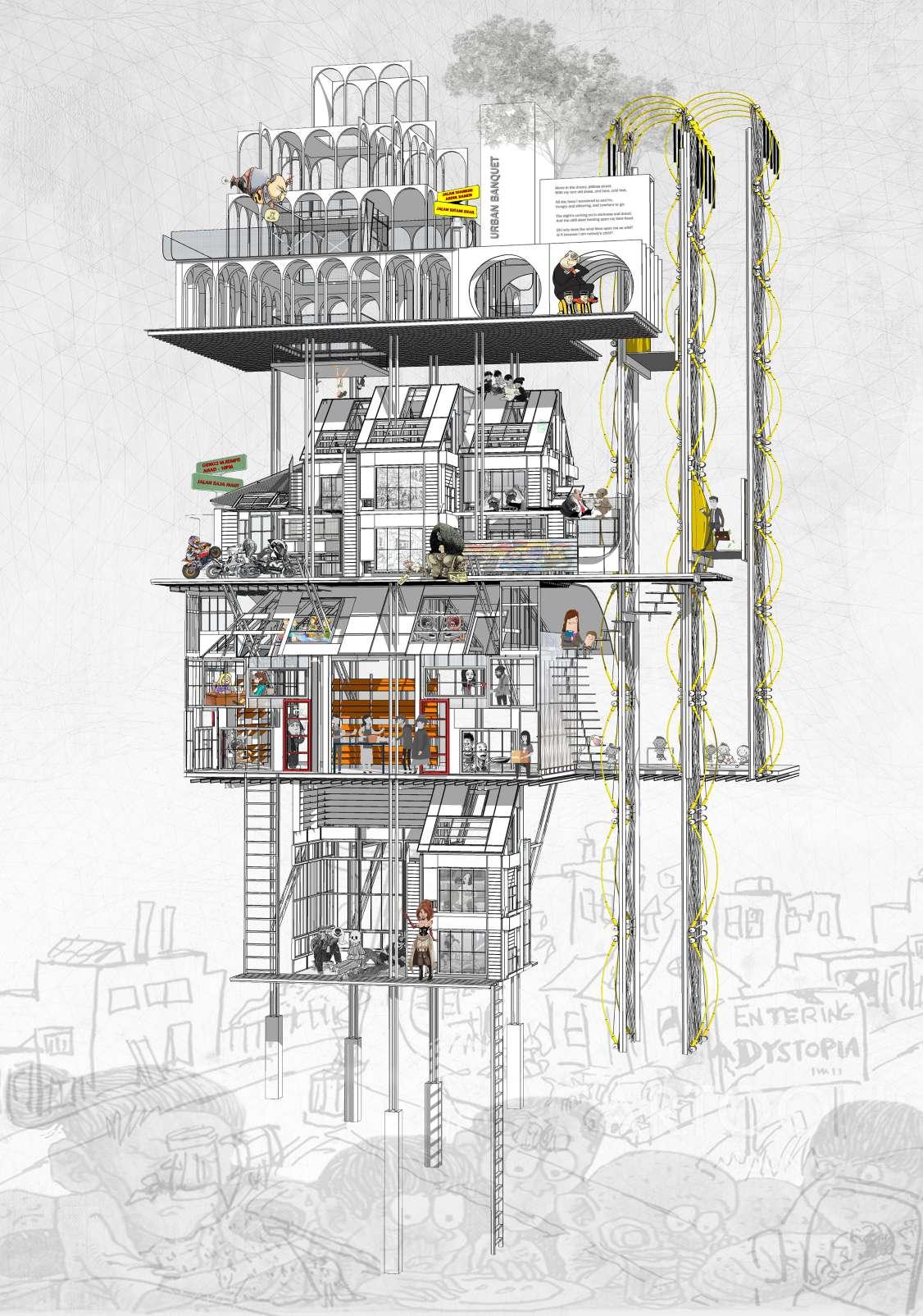 The Urban Banquet was an attempt to analyse the current hierarchy of status among the residents of Chow Kit. In this analogy, the ideation of a banquet is used to symbolise the difference in hierarchical strata among the urban masses which consist of the rich, the middle class and those of the lower class.