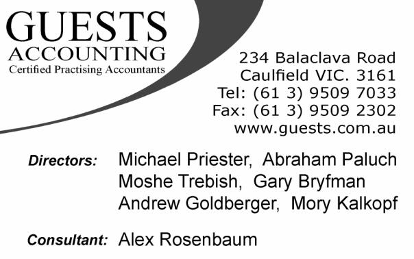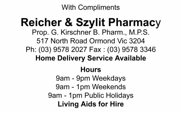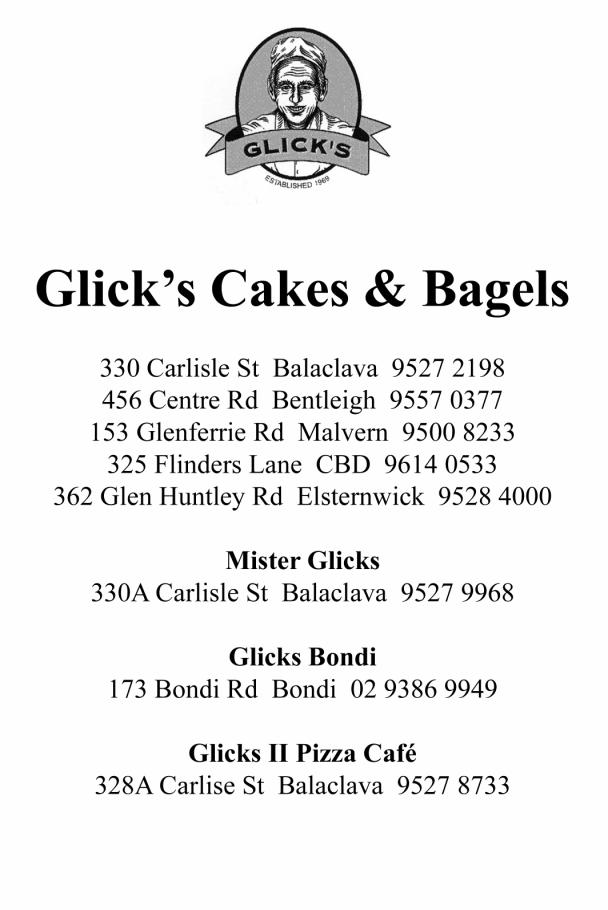 39 With the Compliments of Harry Blatt Pharmacy 781 Glenhuntly Road Caulfield South Ph. 9523 9695 www.kligerwood.com.au ESTATE AGENTS, AUCTIONEERS, PROPERTY MANAGERS, VALUERS DIRECTORS Barry Novy & Eugene Wood ASSOCIATE DIRECTORS Nicholas Breheny & Rogan Sedger Proud of our reputation for excellence in professional property services for 66 years. 358 Glenhuntly Rd, Elsternwick. VIC. 3185 Ph: 95237824 Organic produce, health food, café and natural therapy store. OPEN 7 DAYS (Present this ad. for your free coffee or tea.)