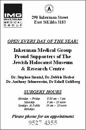 The Elsternwick Holocaust Centre has been in the news lately, as a place for fostering understanding and indicating what can occur when racism and hatred raises their ugly heads. Its importance and acceptance by the wider community was shown following the Caulfield attack on Menachem Vorchheimer. It was given a wide coverage by almost all of the daily press, TV and radio. And perhaps, as many Melbourne Herald Sun readers were reported as saying, due to recent events, it was a “frightening sign of the times”. There has also has been a general increase in anti-Semitic actions, including graffiti, indicating the urgent need for all to support the Centre and its activities, not only in keeping alive the message of the Holocaust but in its ever-widening diverse outreach educational program.
