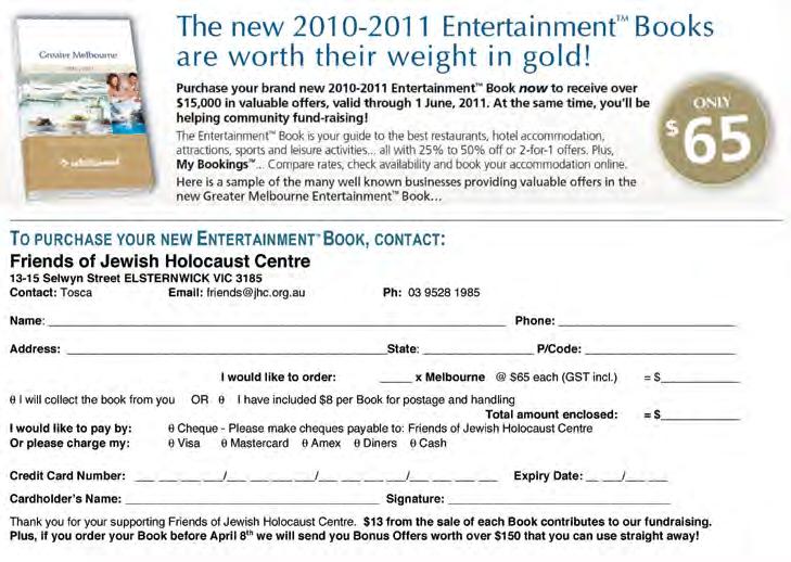 Fri: 10am–2pm Sun & Public Hols: 12pm–4pm Closed on Saturdays, Jewish Holy Days and some Public Holidays JHC Centre News Disclaimer: The opinions expressed in Centre News are those of the authors and do not necessarily reflect those of the magazine editor or editorial committee. While Centre News welcomes ideas, articles, photos, poetry and letters, it reserves the right to accept or reject material. There is no automatic acceptance of submissions. This publication has been designed and produced by Izigraphics Pty Ltd www.izigraphics.com.au CONTENTS FROM THE PRESIDENT 3 EDITOR’S LETTER 3 NEW MUSEUM OPENS AT THE JEWISH HOLOCAUST CENTRE 4 A LABOUR OF LOVE 6 SURVIVORS AND LIBERATORS COMMEMORATE THE LIBERATION OF AUSCHWITZ 8 STAFF AND EXECUTIVE CHANGES AT JHC 10 NEVER AGAIN 11 OUT OF THE DARK: THE EMOTIONAL LEGACY OF THE HOLOCAUST 12 EDUCATION 14 MARCH OF THE LIVING: A PERSONAL REFLECTION 15 THAT GADGET 16 EVENTS 17 DEAKIN UNIVERSITY TEAM RESEARCHES THE CENTRE’S HISTORY 23 CLUB JHC 24 THE JHC’S BEQUEST PROGRAM GAINS MOMENTUM 25 SEEN AROUND THE CENTRE 26 FRIENDS 28 TO LIFE: JHC FRIENDS ART AUCTION 29 STORIES FROM THE COLLECTION 30 NEW ACQUISITIONS 31 OBITUARIES 33 THANKS 35