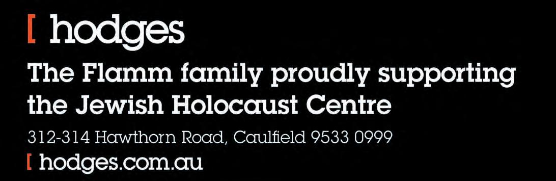 The gala dinner held in May to mark the 30 th anniversary of the JHC’s establishment and coordinated by a dedicated team of volunteers and staff (Helen Mahemoff, Elly Brooks, Goldie Birch, Pauline Rockman OAM and Reuben Zylberszpic) was an outstanding success. It brought together supporters to acknowledge our progress and to contemplate plans for the future. Special materials produced for the gala include the commemorative booklet, edited by Ruth Mushin, with photography by Zina Sofer and graphic design by Izi Marmur, and the wonderful video produced by Robbie Simons. I wish to acknowledge and to thank our 30th Anniversary supporters – the Gandel Family and Gandel Philanthropy; Les and Kathy Janovic (in memory of Dezso and Medi Janovic); and Gala supporters Sunraysia Foundation; Jeffrey Mahemoff AO and Helen Mahemoff; Pauline Rockman OAM and Sandra Jedwab; Regine Szmulewicz (in memory of Rushka and Ksiel Szmulewicz); Gary Peer; Lowe Lippmann; Highpoint Property Group; Bank of Melbourne; Outdoor Fitness Hub; and Arnold Bloch Liebler. I would also like to thank those who attended and donated generously to the Centre and the Jewish Holocaust Centre Foundation.
