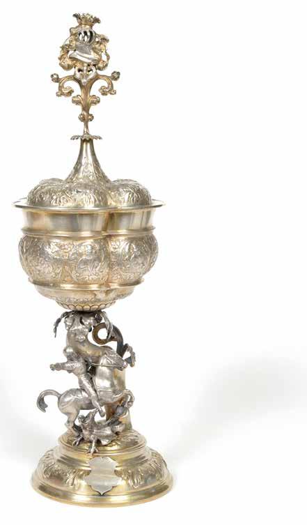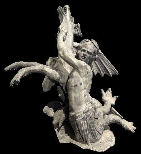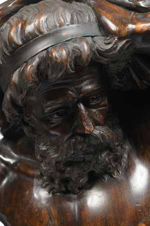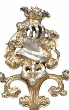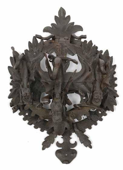 Richement décoré de trois monstres volants aquatiques et de têtes de serpents reposant sur une couronne de feuilles de chêne.