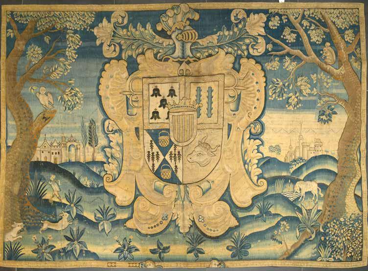 Encadrée de deux gros arbres au troncs tordus, les armoiries du duc de Cuidad Real, descendant des rois d’ Aragon, se détachent sur un paysage valloné, terminé de part et d’autre de l’écu par deux cités fortifiées. Quelques animaux agrémentent le paysage notamment la licorne, symbole de pureté.