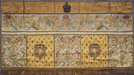 En trois frises superposées, l’une à fleurs de lys sur fond orangé, l’autre à décor végétal, la troisième alternant large bouquets de fleurs et blason au lion rugissant entouré d’un semis de fleurettes sur fond jaune.