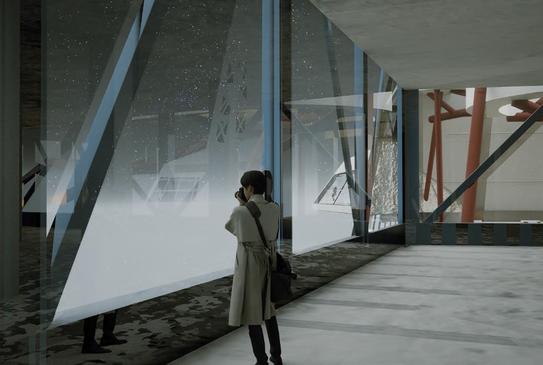 The atrium presents sixteen entrances within a single visual field, allowing visitors to choose freely. It symbolizes the chaotic emotional market, encouraging individuals to follow their inner judgment rather than drift with the crowd. Circulation varies by gallery theme. The central hall offers an immersive space for reflection and bodily awareness. An ascending passage gradually shifts from darkness to light and noise to silence, leading toward the universe. The planetarium becomes the final point of contemplation. Each sequence represents emotional transformation: manipulation, introspection, liberation, and balance. The atrium acts as a convergence of consciousness, while displacement, superimposition, drift, fragmentation, and ambiguity shape the deconstructive spatial strategy.