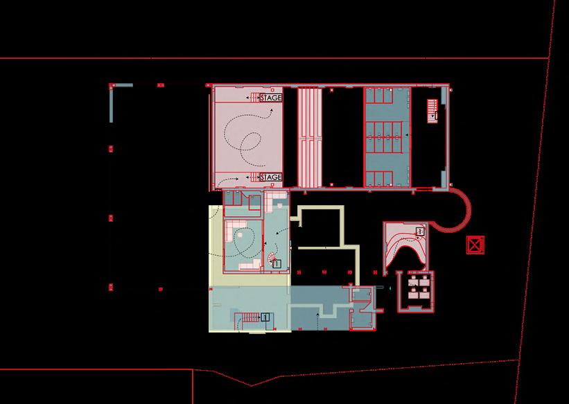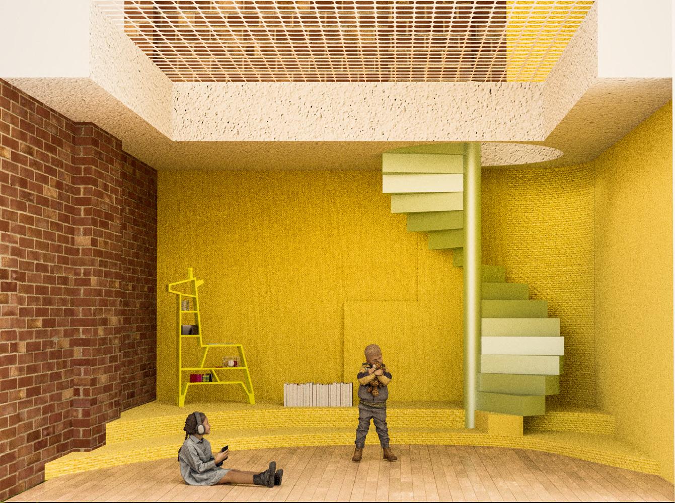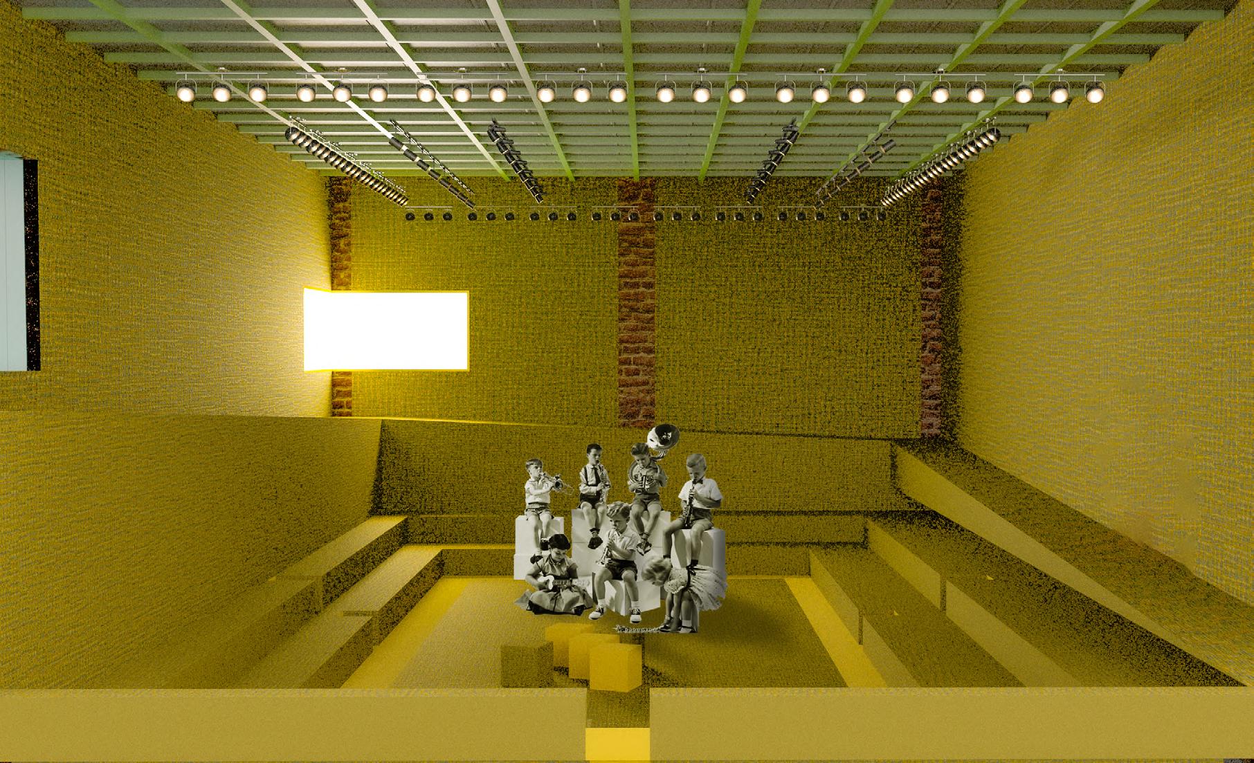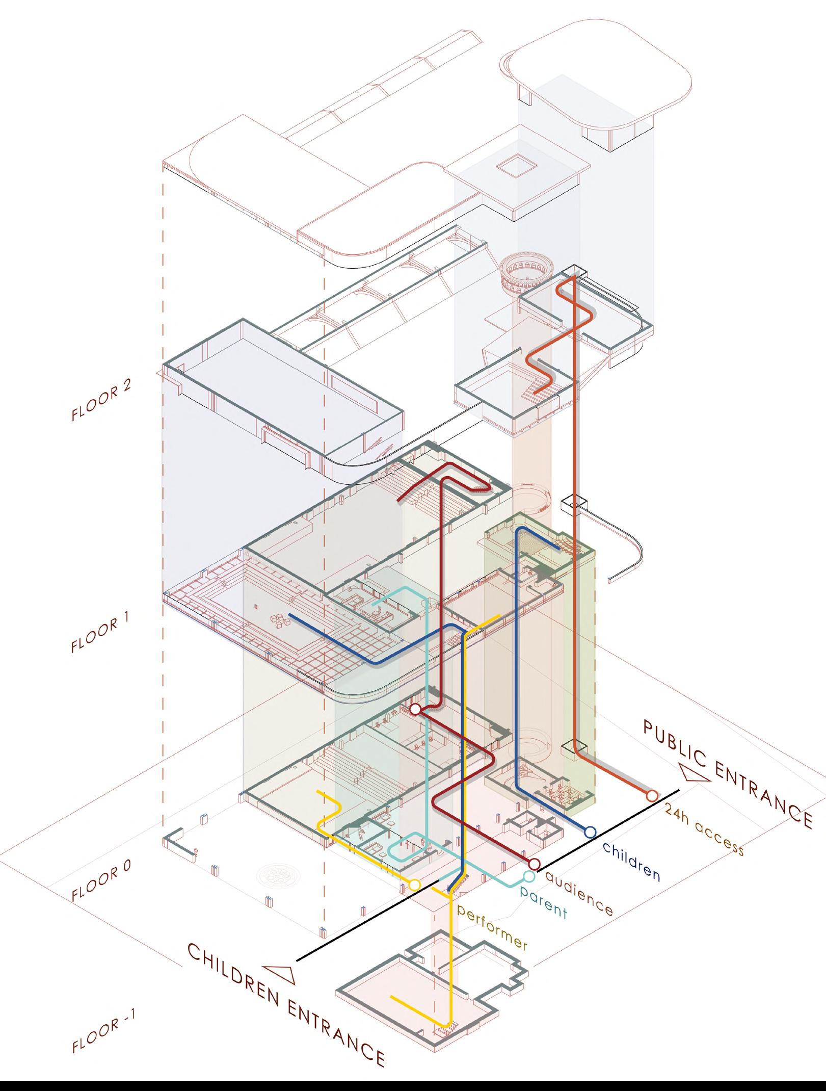 The main theatre welcomes children as the heart of the building, symbolizing birth and hope within its historical context. Serving as the entrance, lobby, and performance space, it encourages playful activities—performing, gaming, and creative exploration. Light is changeable, animating the space, while red brick, colourful fabrics, and modular, assembled seating create a lively, tactile environment. Abstract elements, like a bath and water, evoke cleanliness and health, while the central stage becomes a metaphorical nucleus for imagination and growth. This dynamic, interactive space fosters joy, learning, and communal engagement, celebrating childhood and the future potential of architecture through playful design.