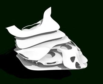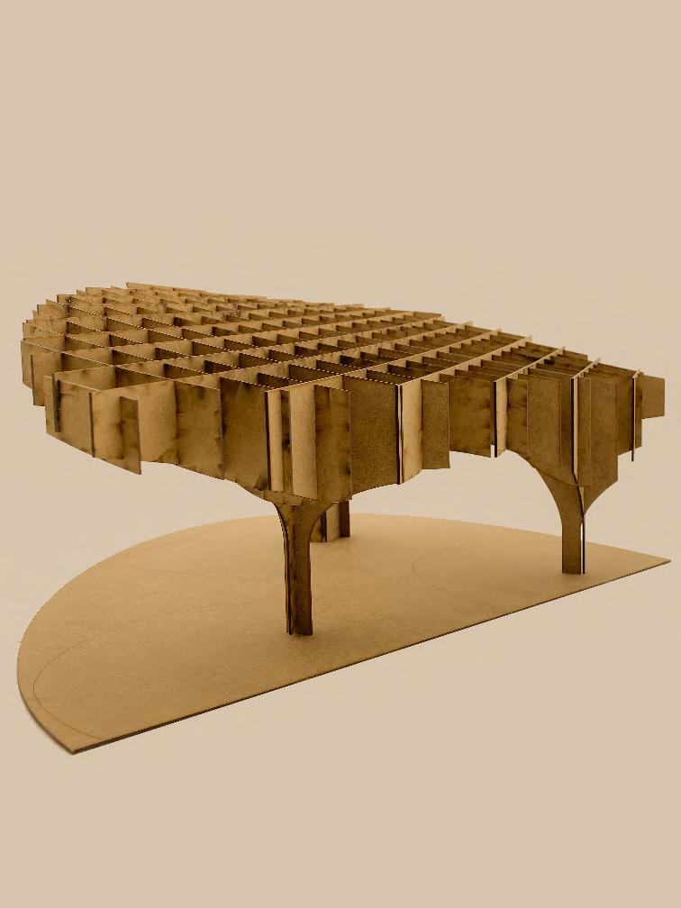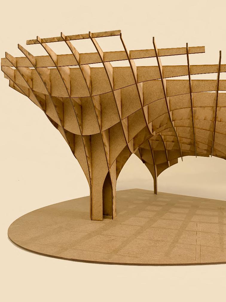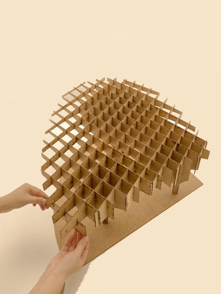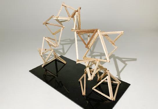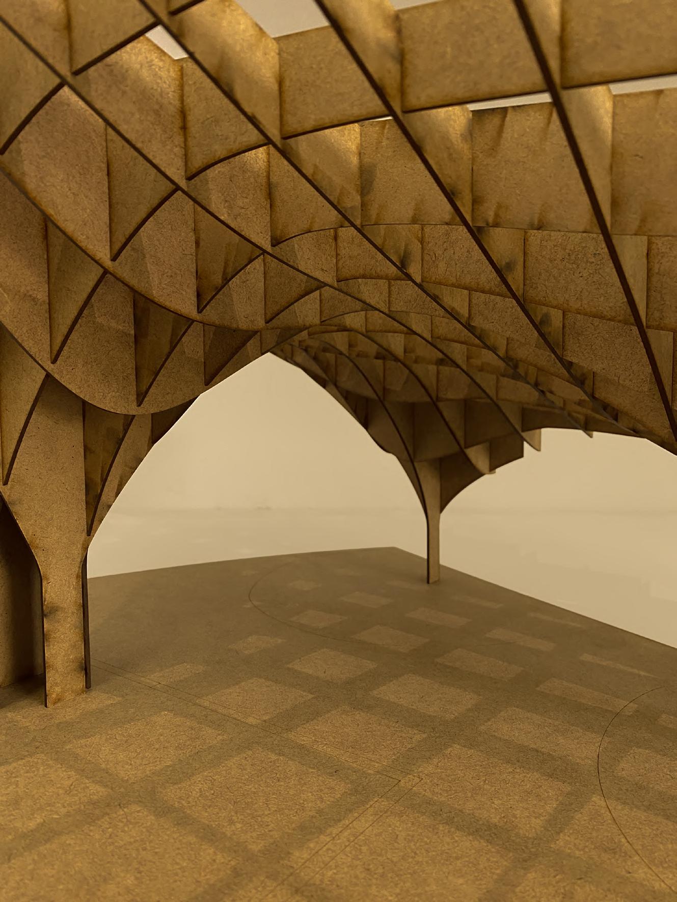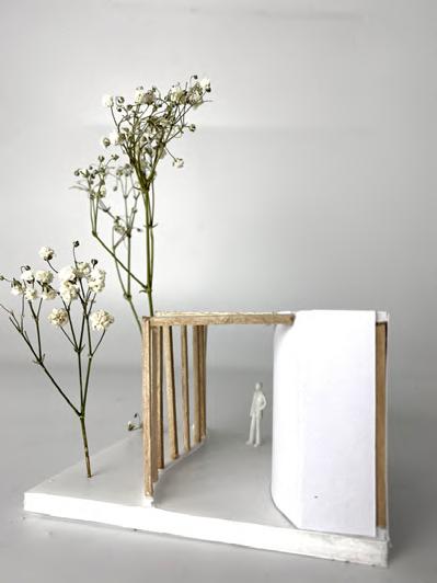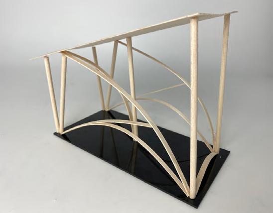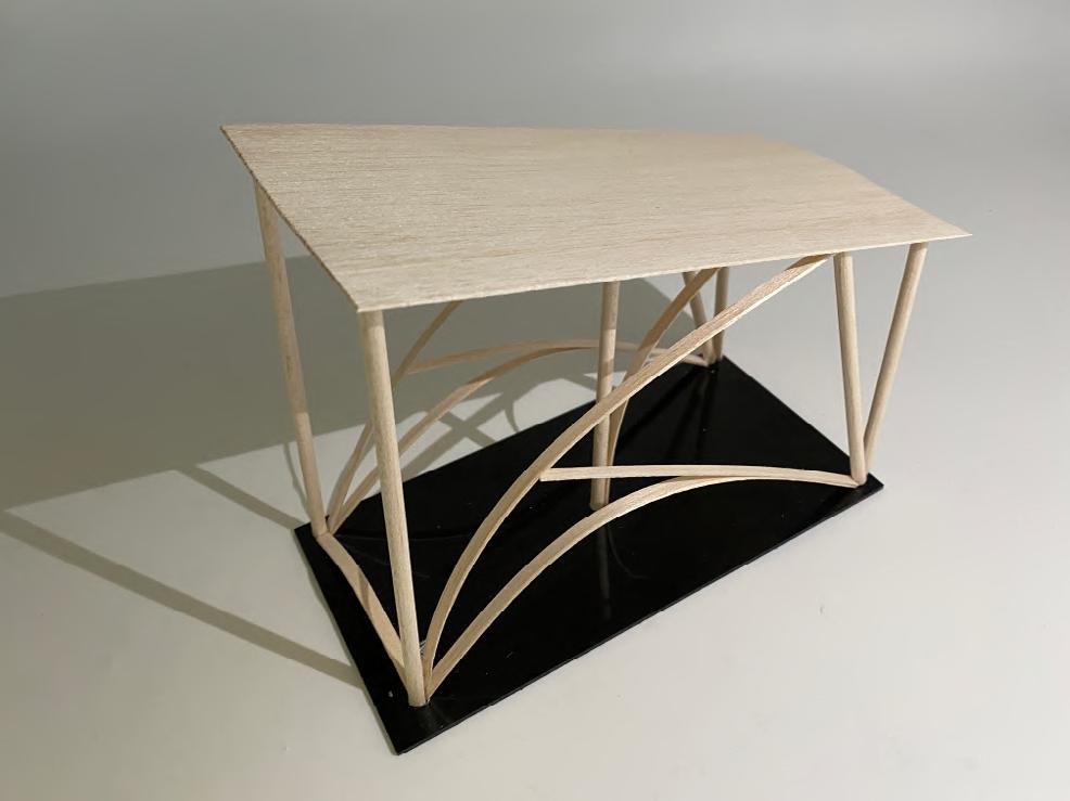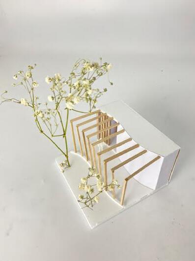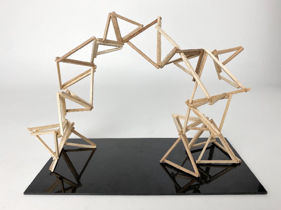 This is an experiment of bamboo strips, The interacting force form the curve without gluing. In this model, I explored the patterns that can be created with wooden strips. Triangles facing different directions continuously form an arch, and sharp angles simulate the form of thorns, suggesting the sharp and self-protective aspect of the natural world.
