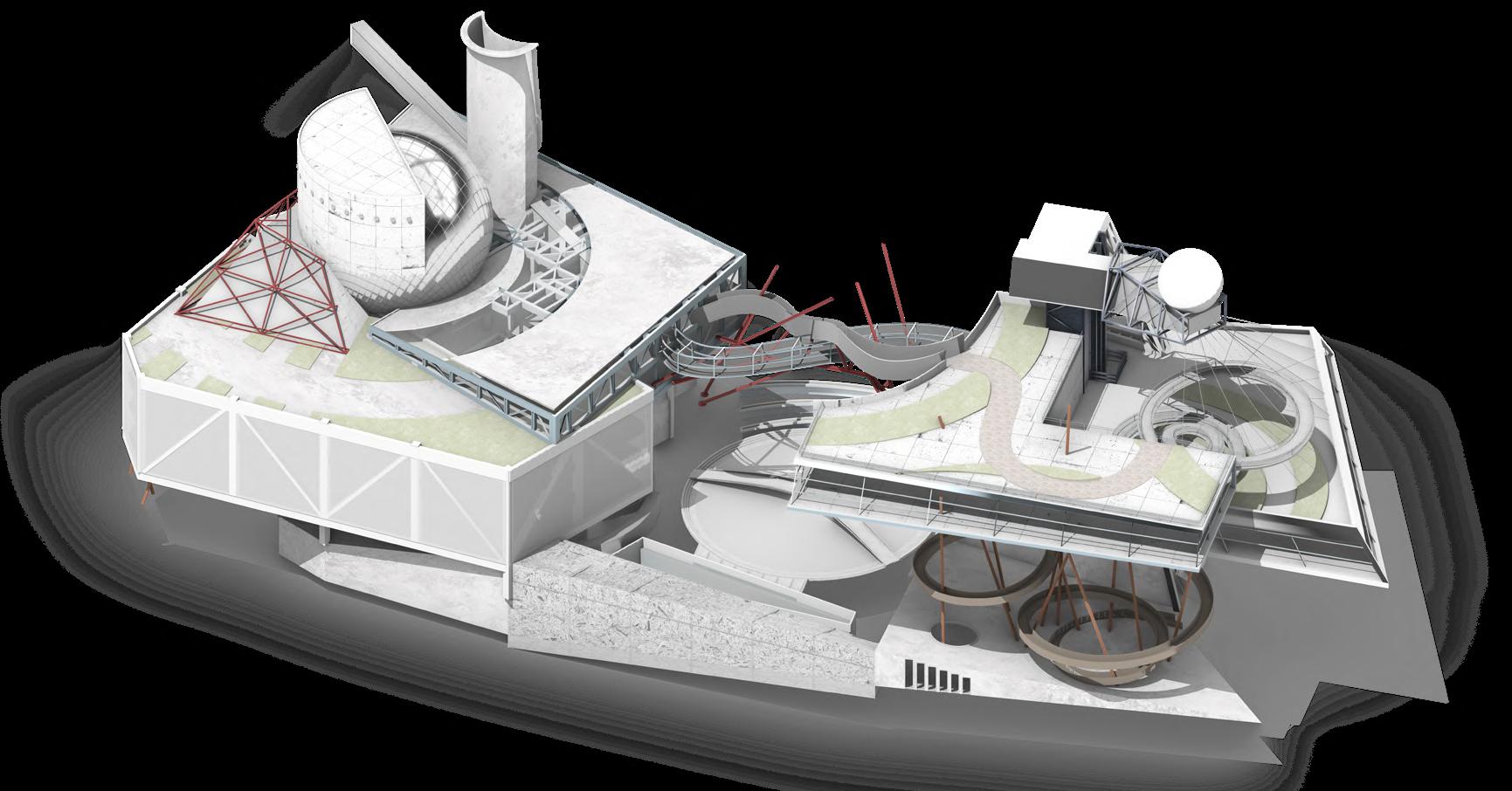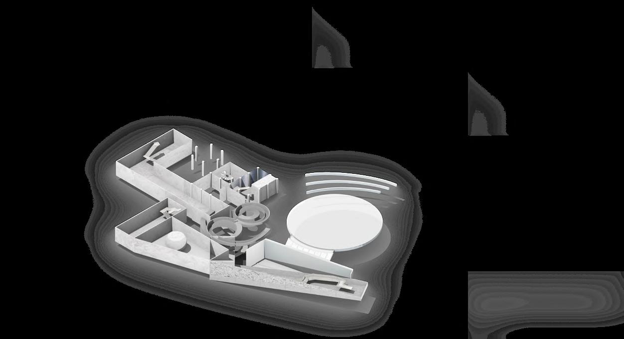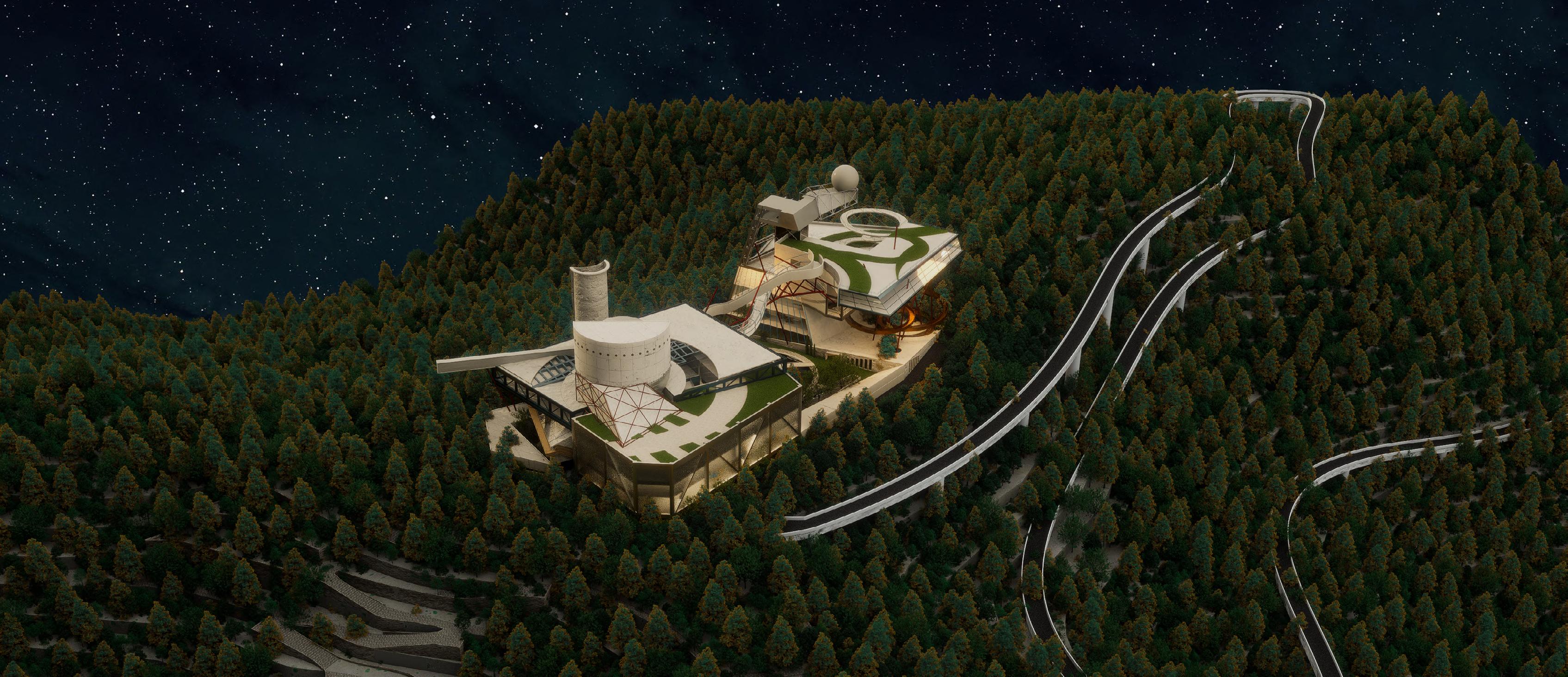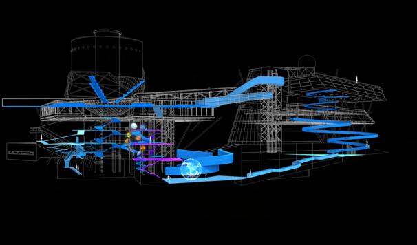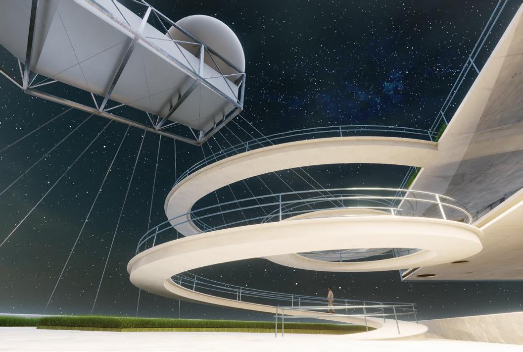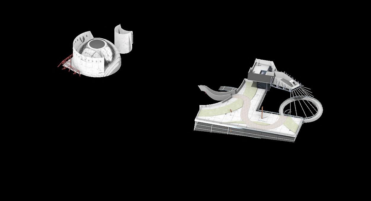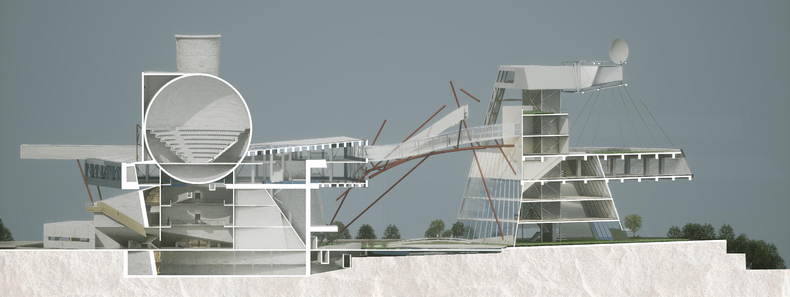 Visitors arrive either by taxi, dropping off at the ground floor, or by private car, parking in the garage. From different levels, they enter the atrium and choose a gallery to begin their visit. After following multiple exhibition paths, they reach the rear stargazing level, with open and semi-open leisure areas offering food, washing, and rest, allowing recovery after intense information intake. Crossing a bridge between the two buildings by ramp or escalator, visitors enter the planetarium. The circular route then returns to the parking area, where they may leave or continue exploring.