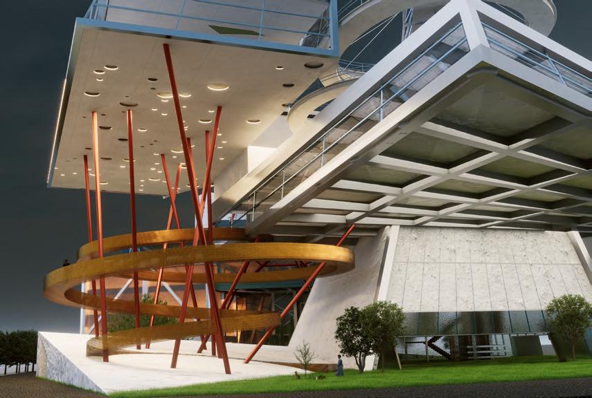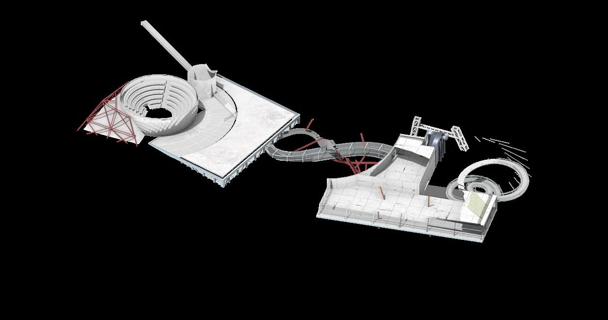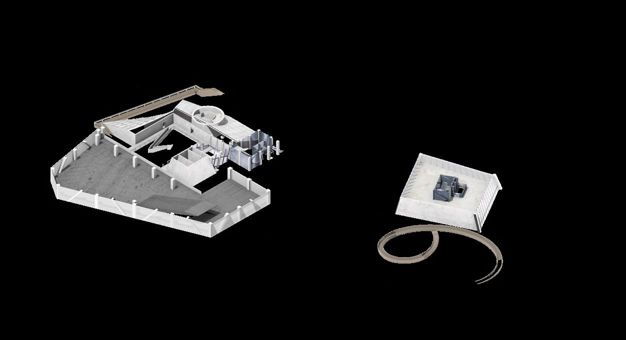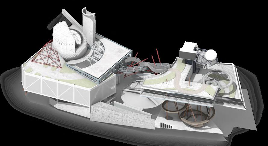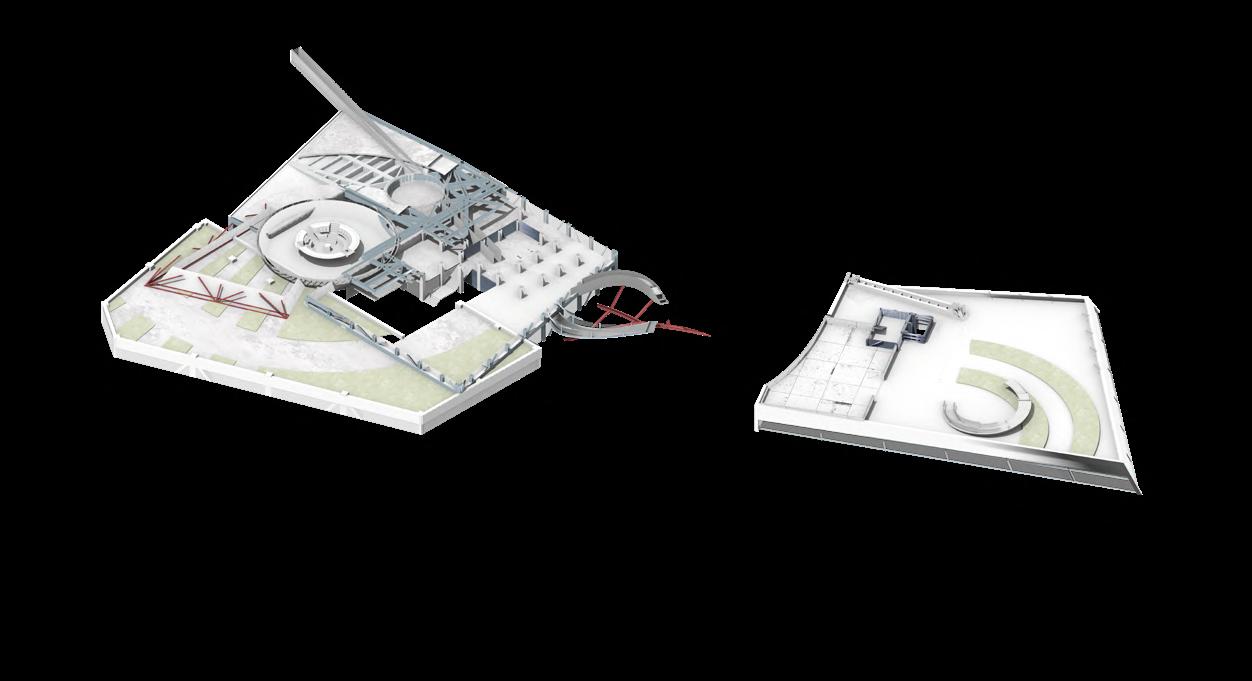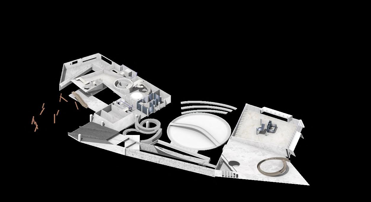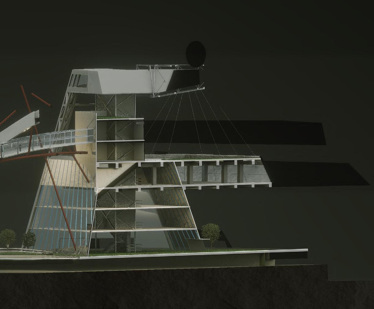 Visitors arrive either by taxi, dropping off at the ground floor, or by private car, parking in the garage. From different levels, they enter the atrium and choose a gallery to begin their visit. After following multiple exhibition paths, they reach the rear stargazing level, with open and semi-open leisure areas offering food, washing, and rest, allowing recovery after intense information intake. Crossing a bridge between the two buildings by ramp or escalator, visitors enter the planetarium. The circular route then returns to the parking area, where they may leave or continue exploring.