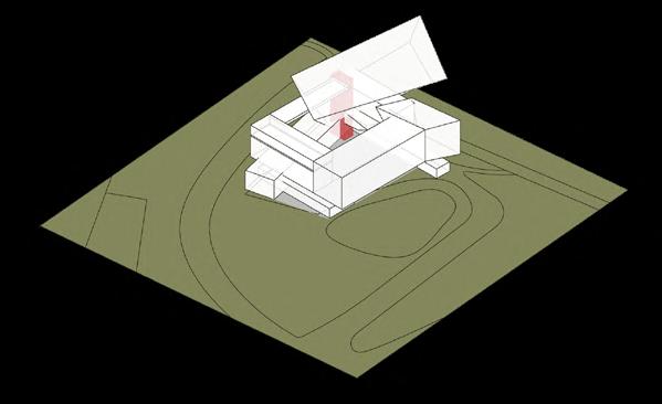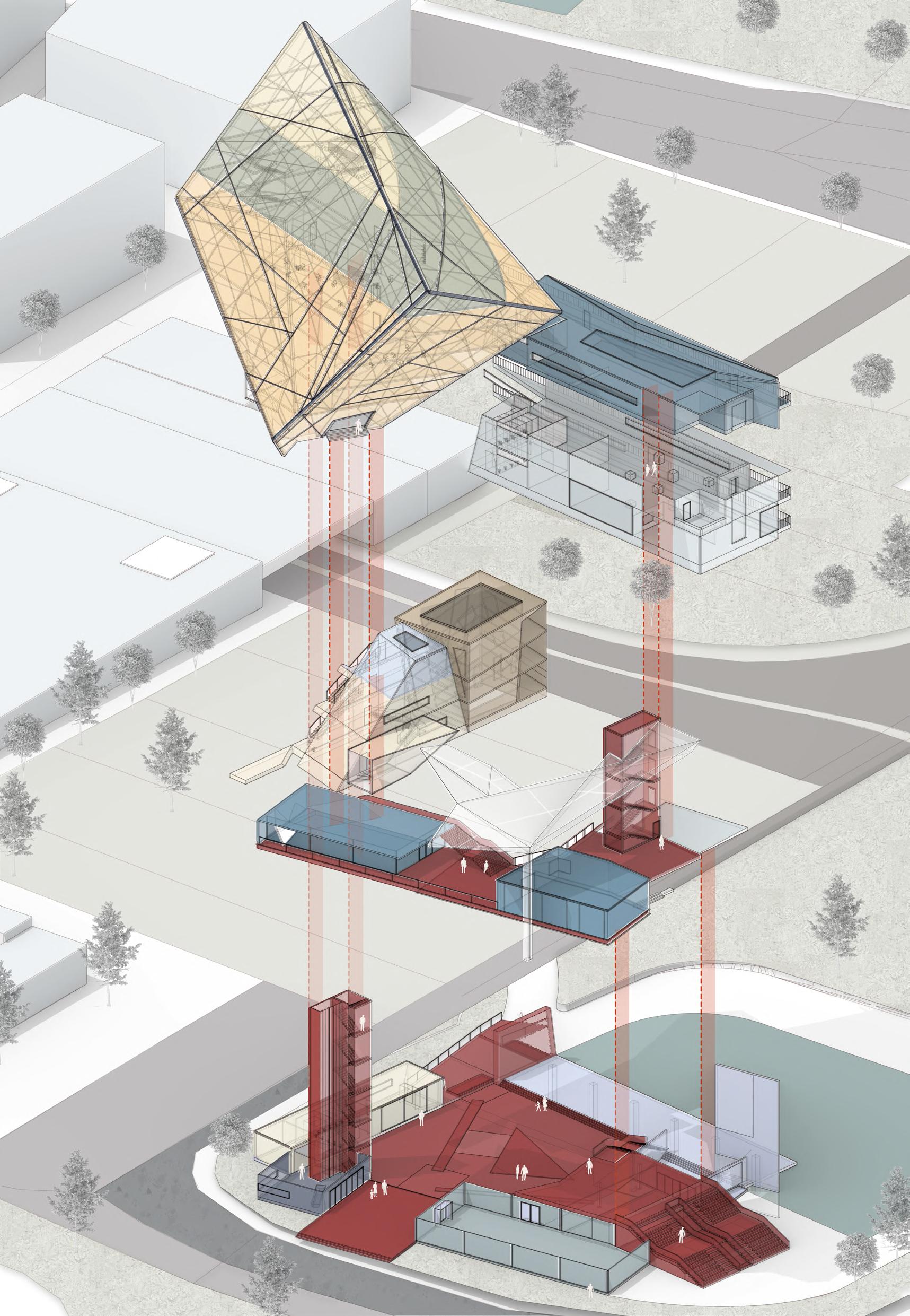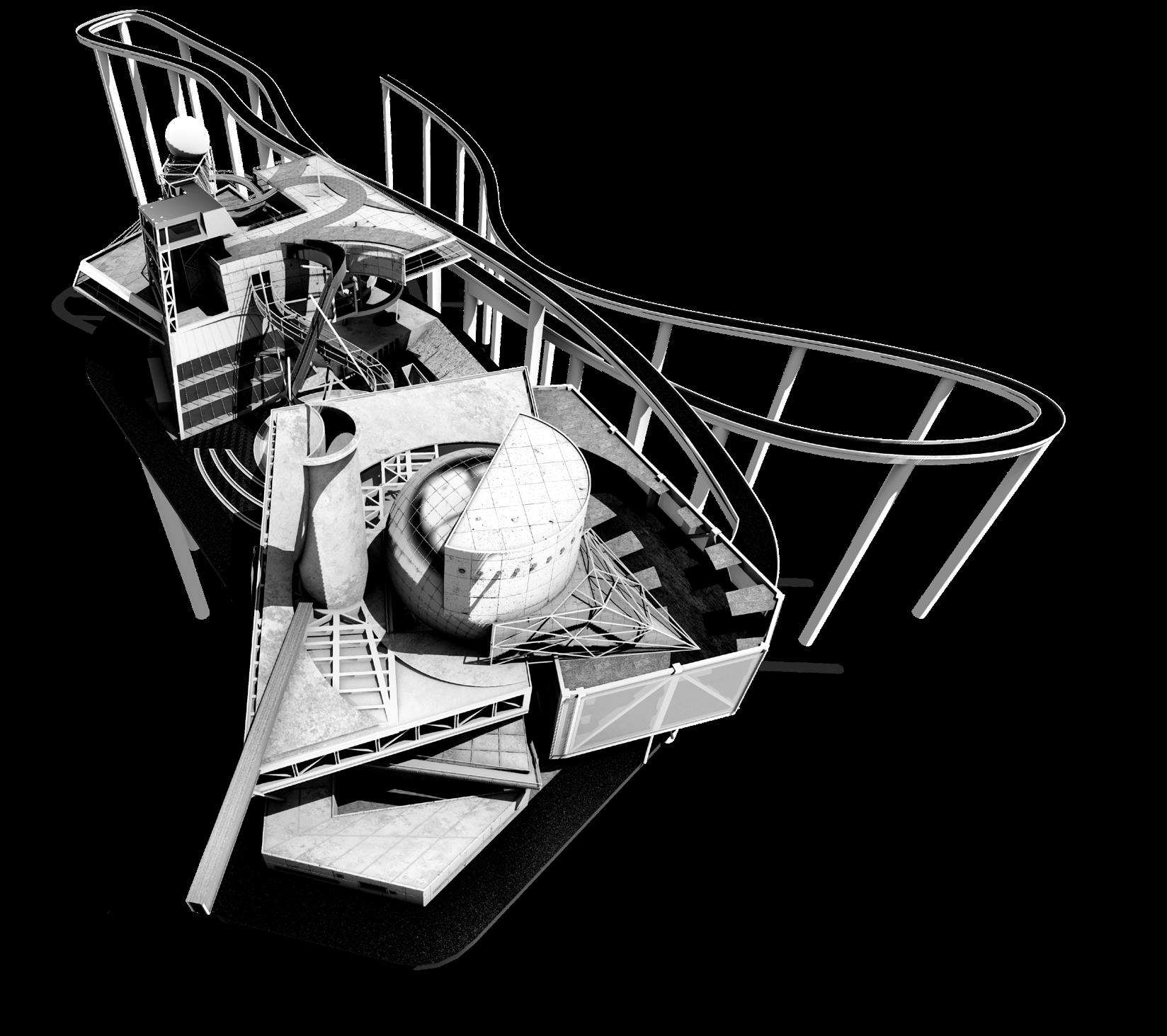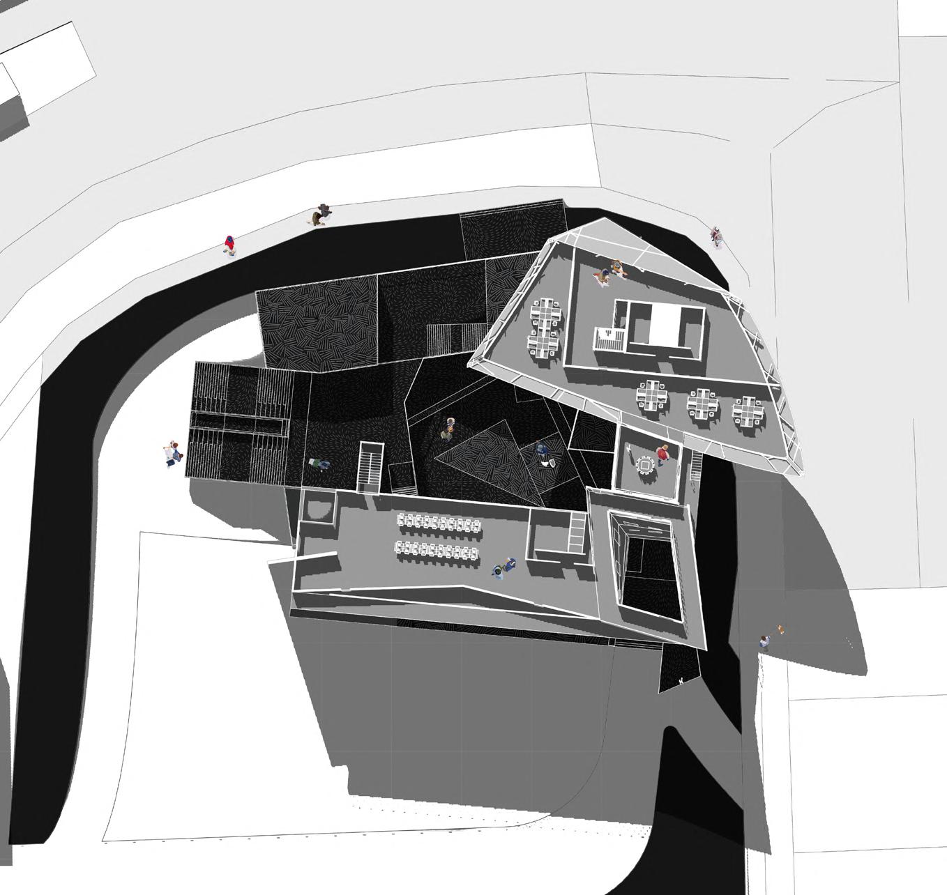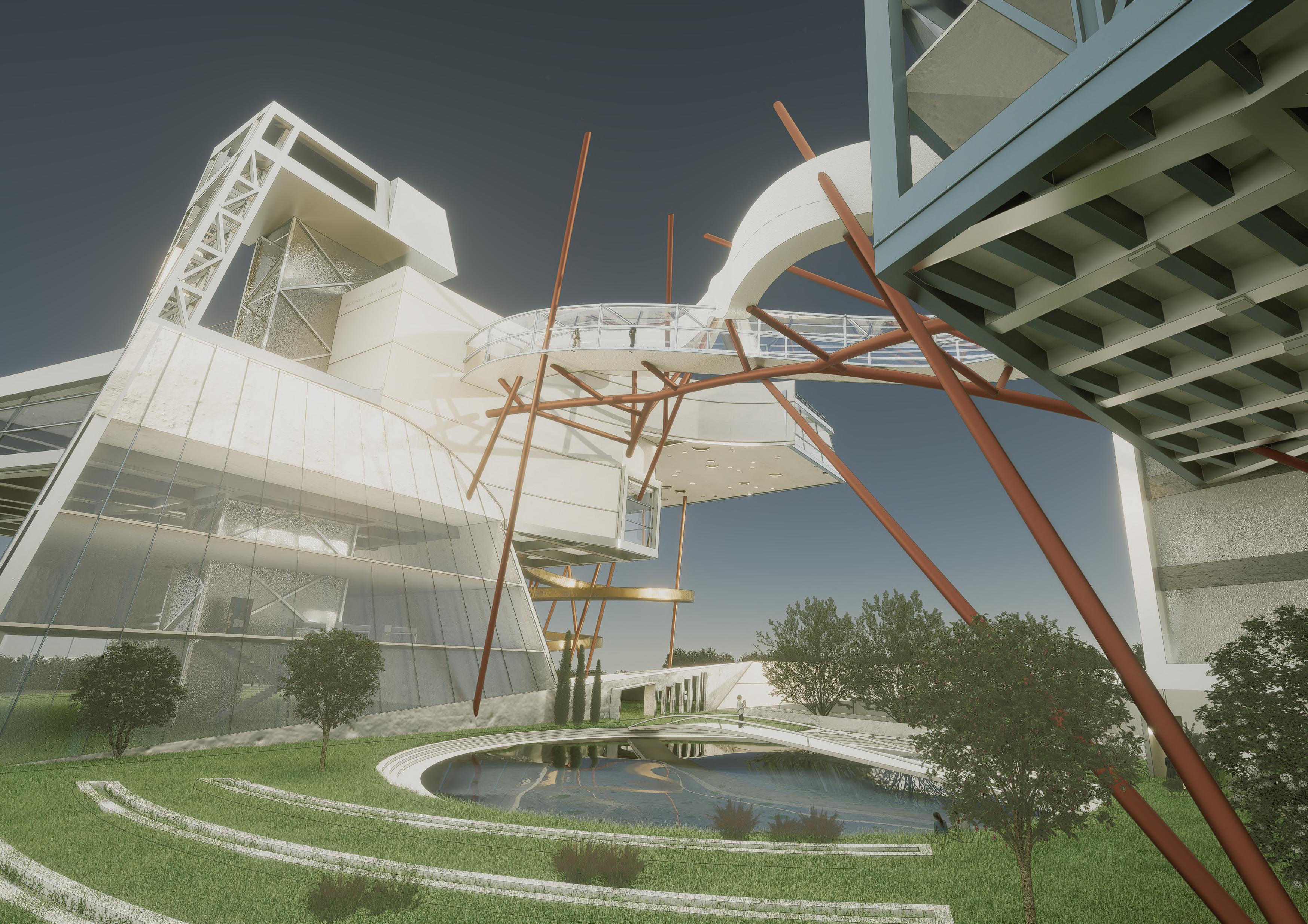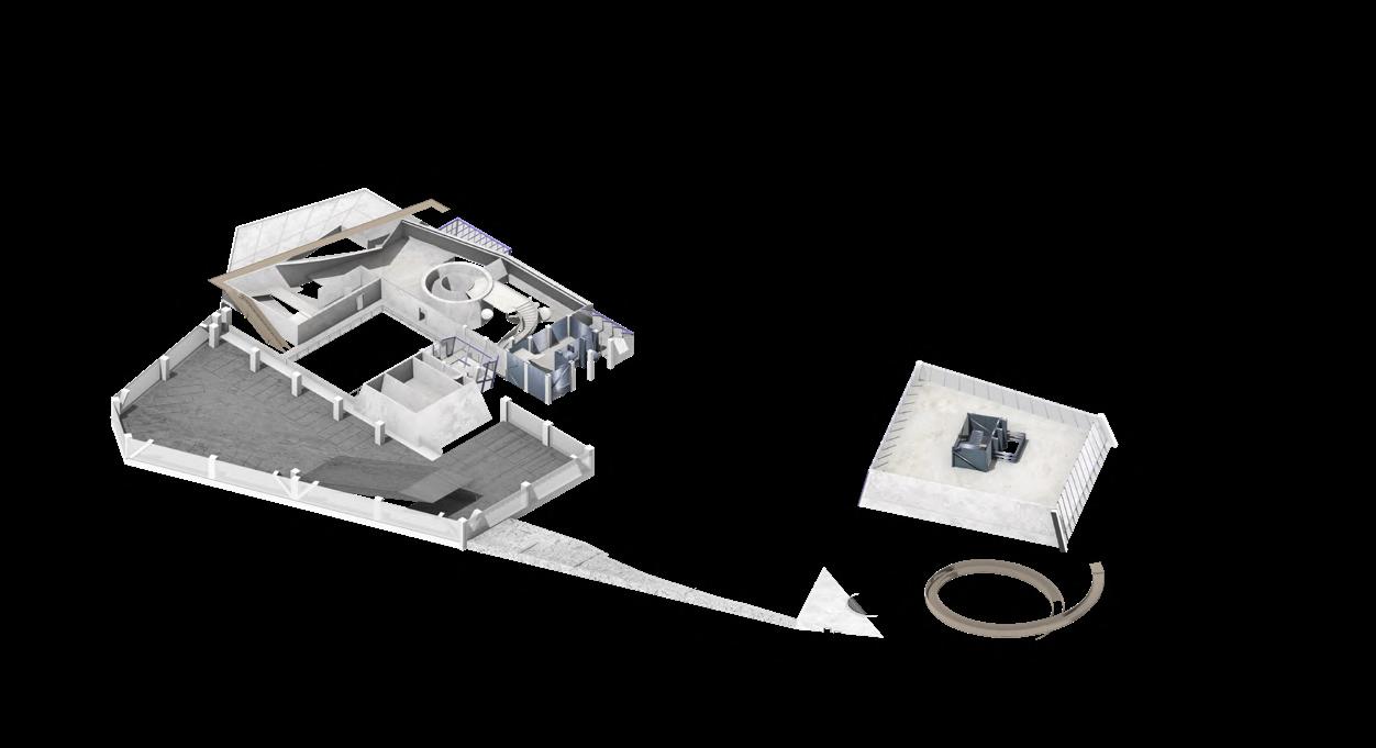 Visitors arrive either by taxi, dropping off at the ground floor, or by private car, parking in the garage. From different levels, they enter the atrium and choose a gallery to begin their visit. After following multiple exhibition paths, they reach the rear stargazing level, with open and semi-open leisure areas offering food, washing, and rest, allowing recovery after intense information intake. Crossing a bridge between the two buildings by ramp or escalator, visitors enter the planetarium. The circular route then returns to the parking area, where they may leave or continue exploring.