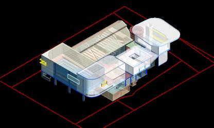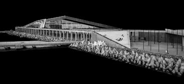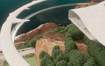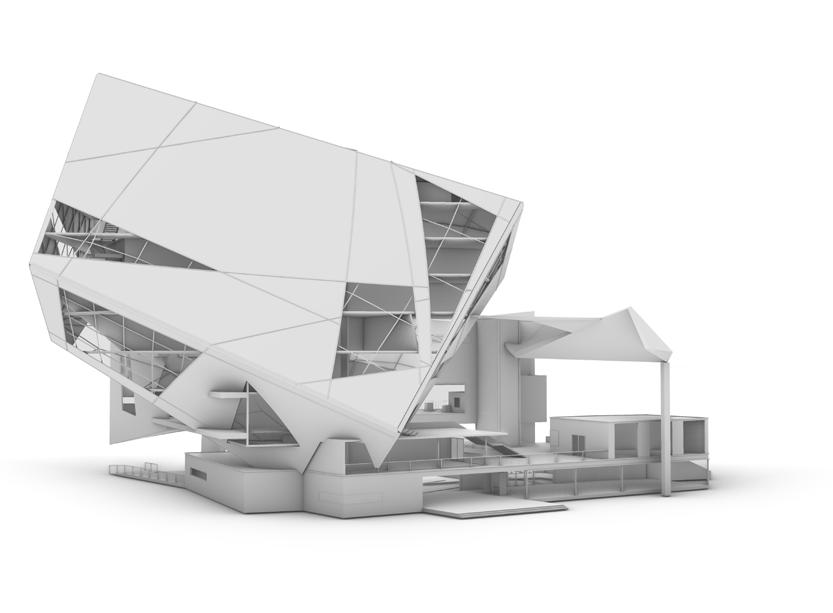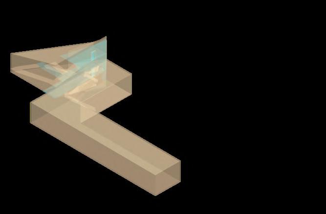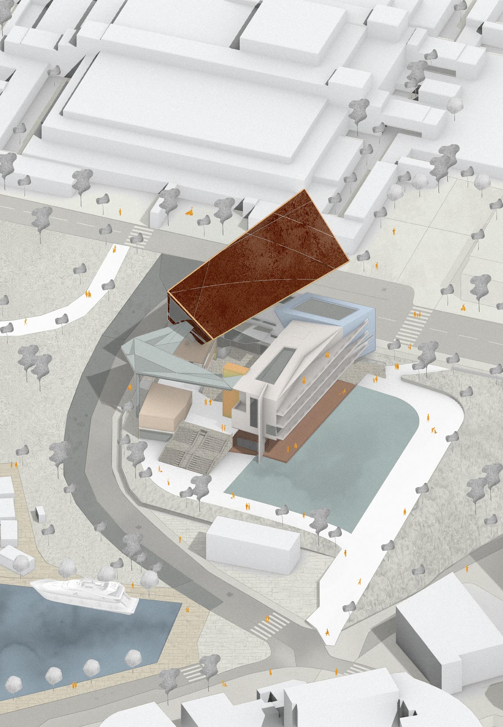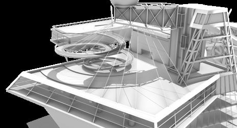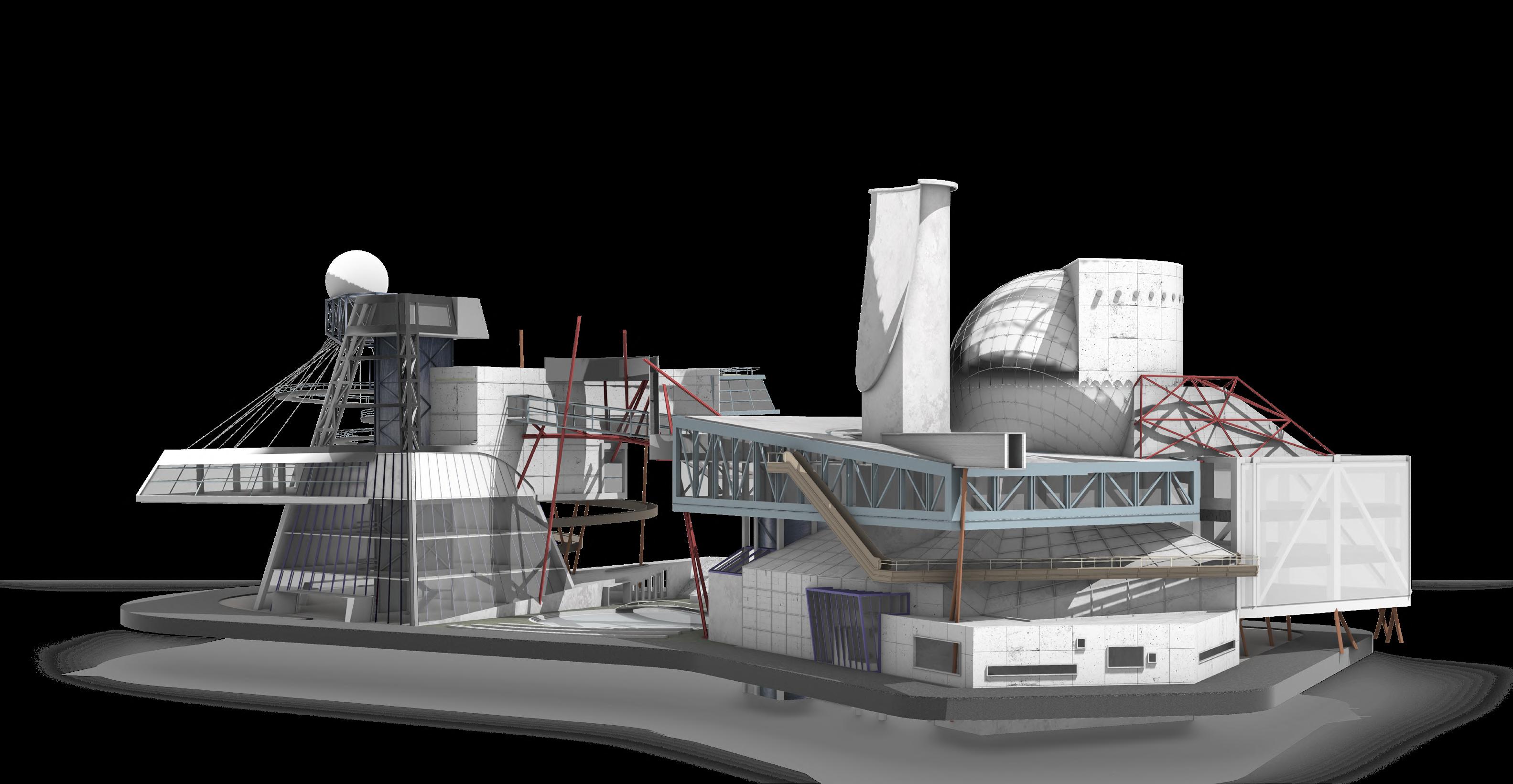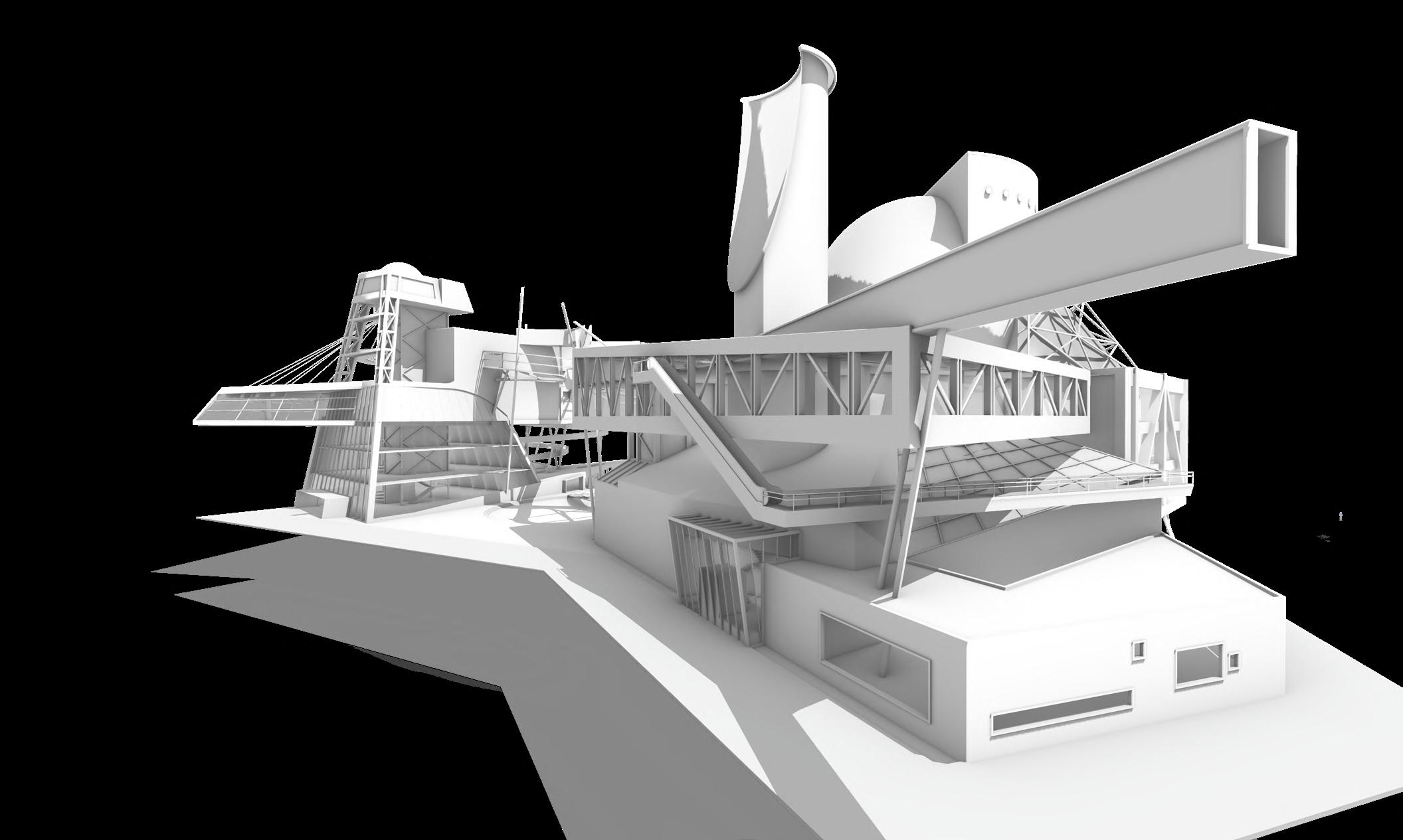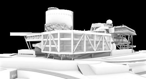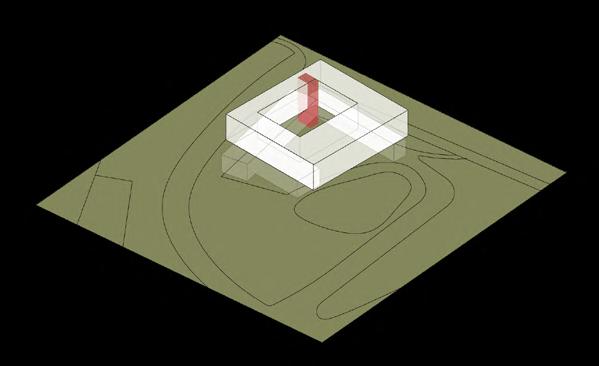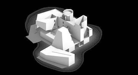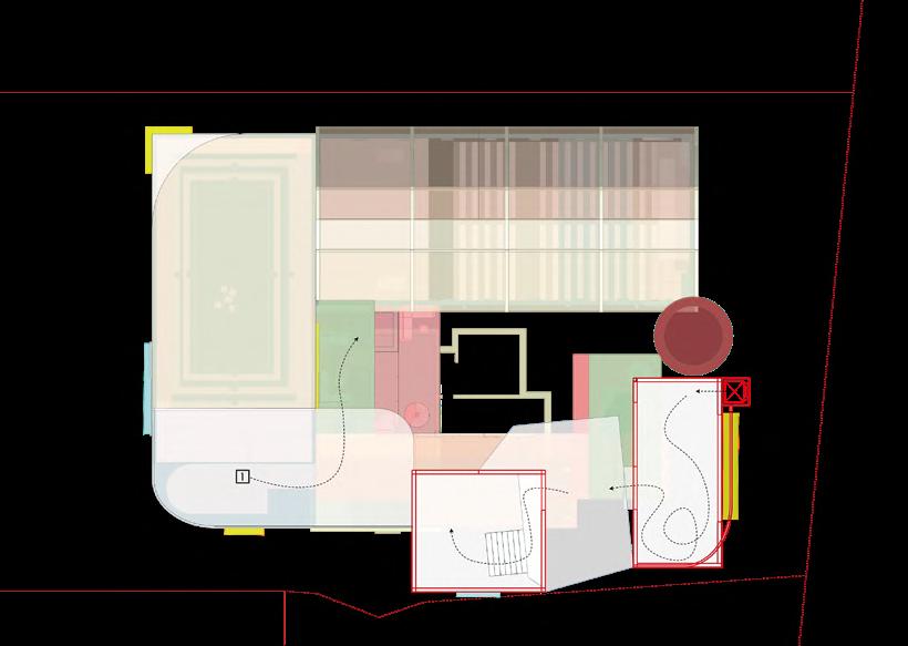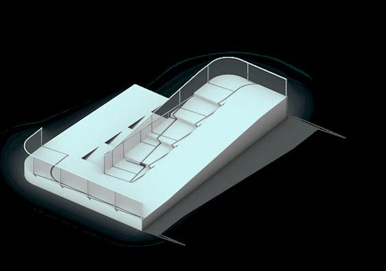 Visitors arrive either by taxi, dropping off at the ground floor, or by private car, parking in the garage. From different levels, they enter the atrium and choose a gallery to begin their visit. After following multiple exhibition paths, they reach the rear stargazing level, with open and semi-open leisure areas offering food, washing, and rest, allowing recovery after intense information intake. Crossing a bridge between the two buildings by ramp or escalator, visitors enter the planetarium. The circular route then returns to the parking area, where they may leave or continue exploring.