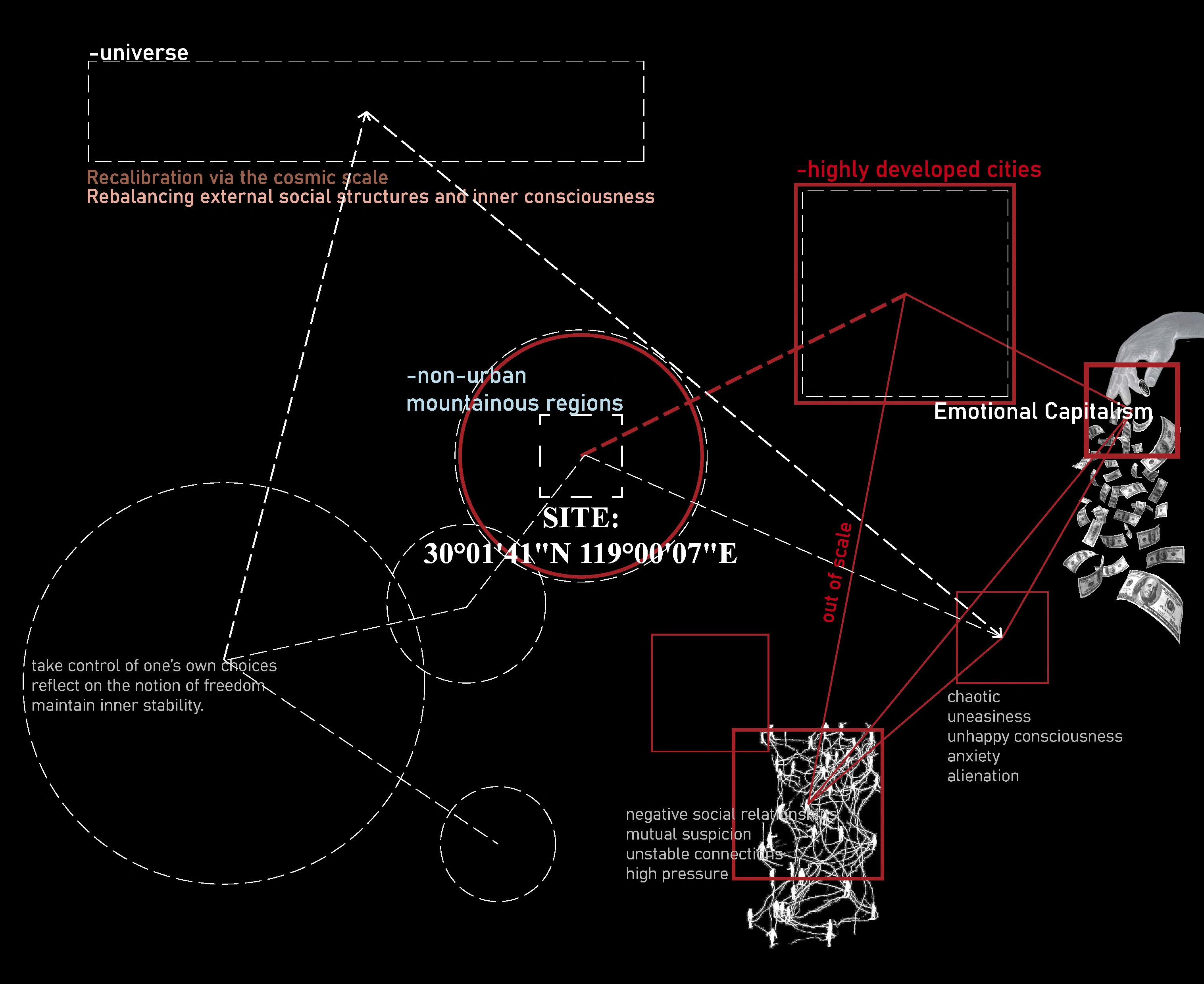 Based on Eva Illouz’s theory of emotional capitalism, this project explores how contemporary society commodifies emotions through markets and social media, weakening authentic emotional perception and producing superficial social relations. The proposal responds by creating a de-capitalized emotional space through the spatial experience of a planetarium, encouraging visitors to reconsider their feelings through the scale of the cosmos. The site is located on Qianniu Ridge near Hangzhou, a popular but undeveloped stargazing destination currently affected by traffic congestion and environmental damage. The project introduces an educational planetarium, observatory hall, and supporting facilities to foster a more reflective engagement with the night sky.
