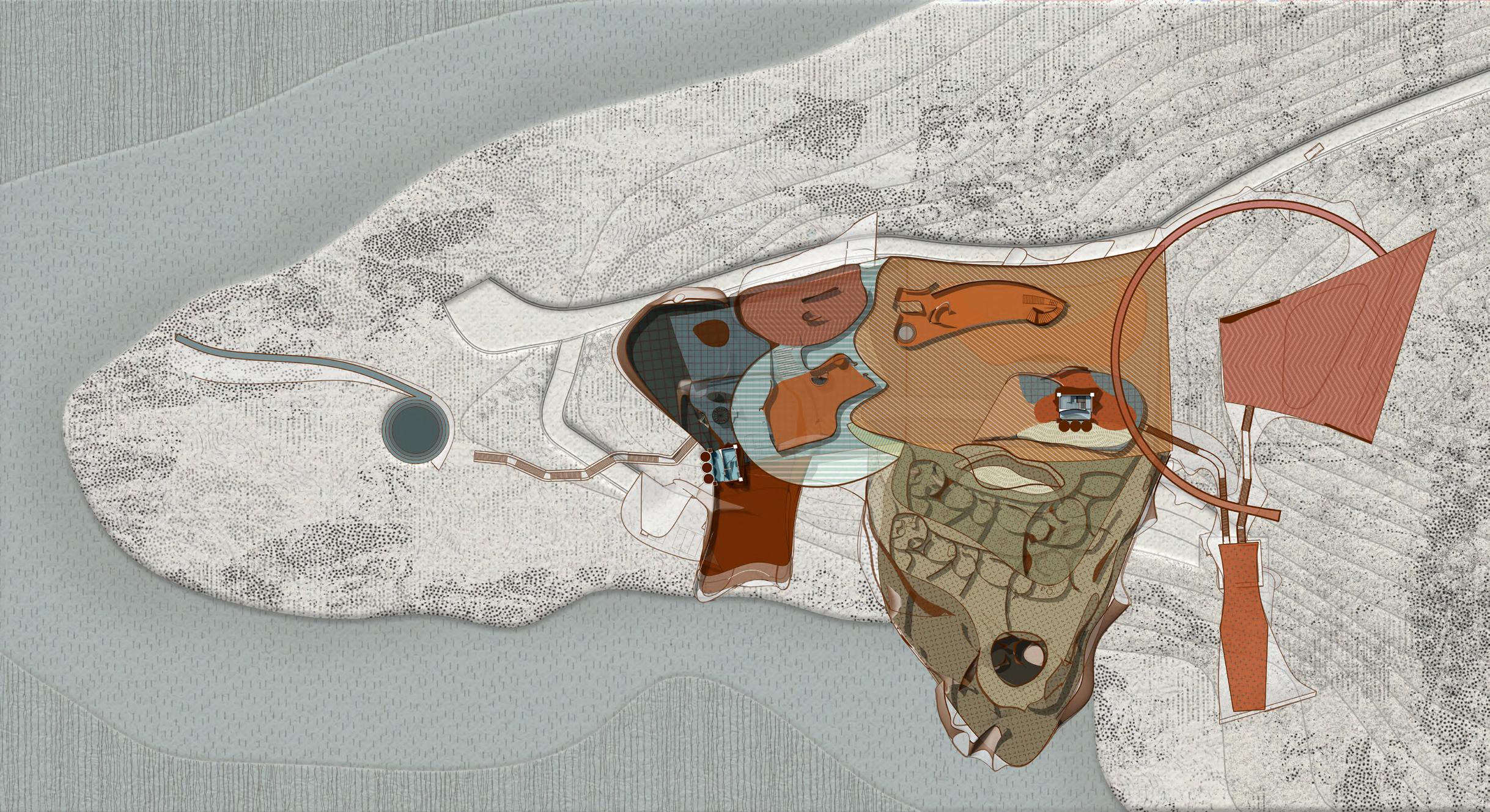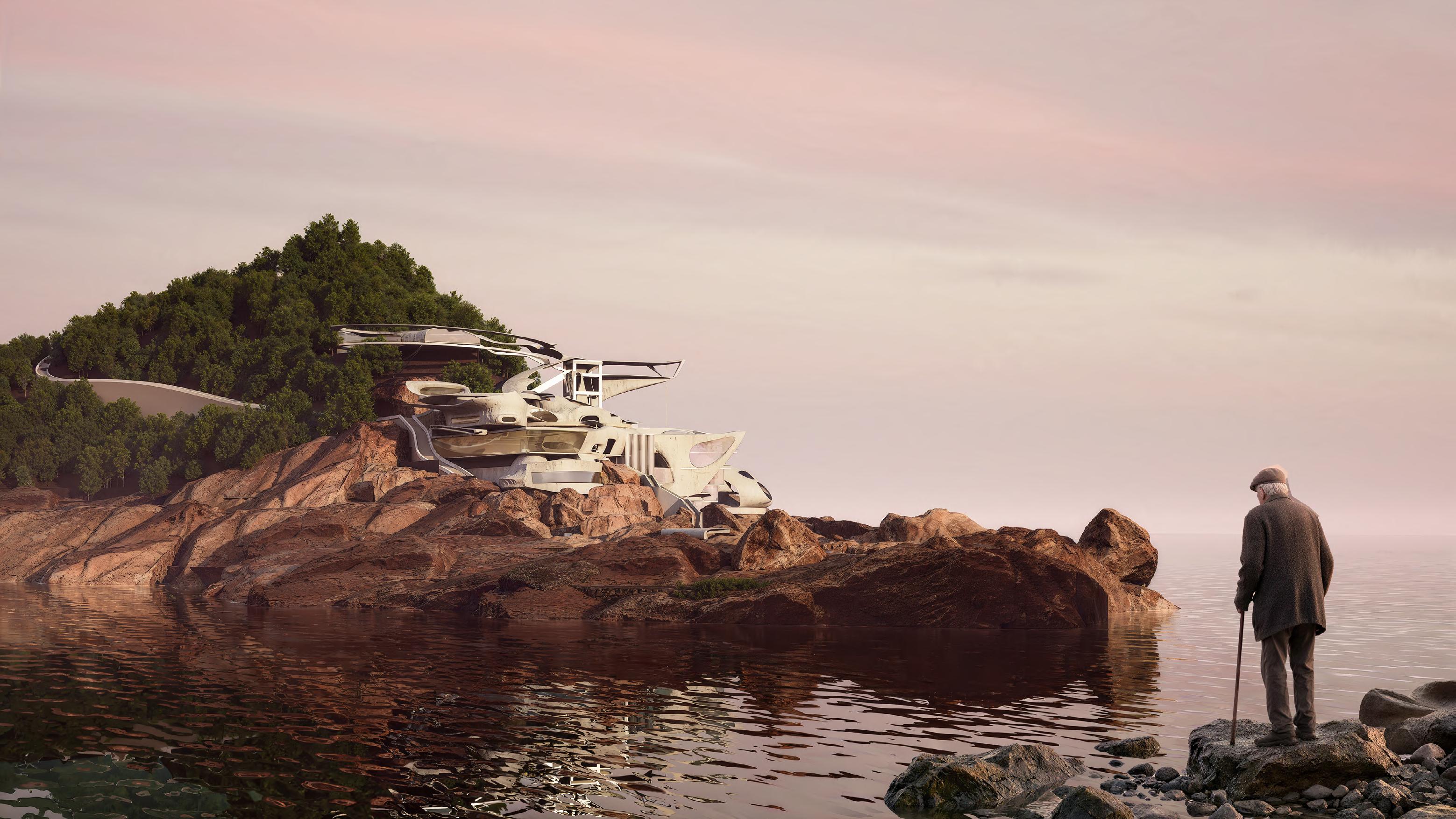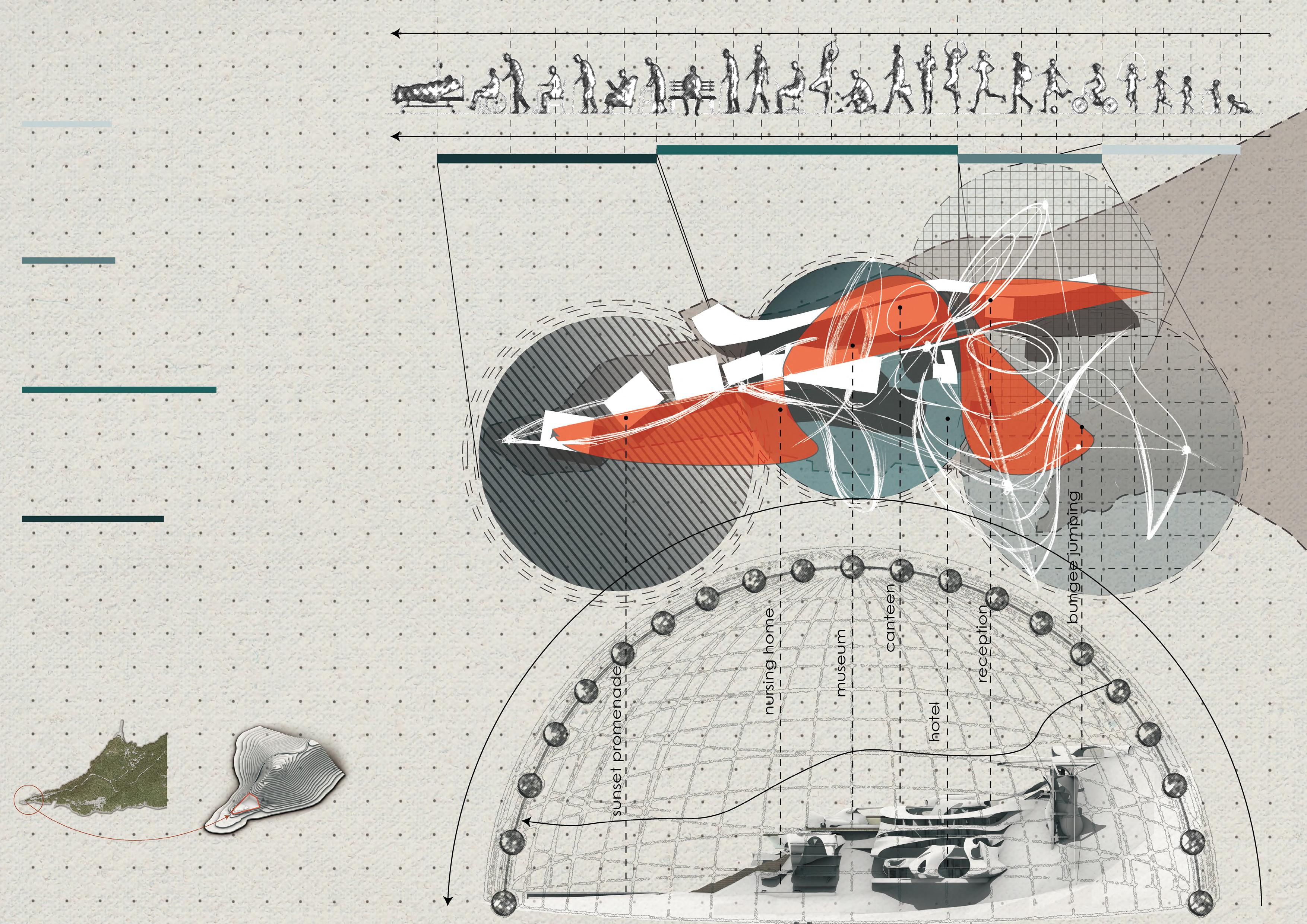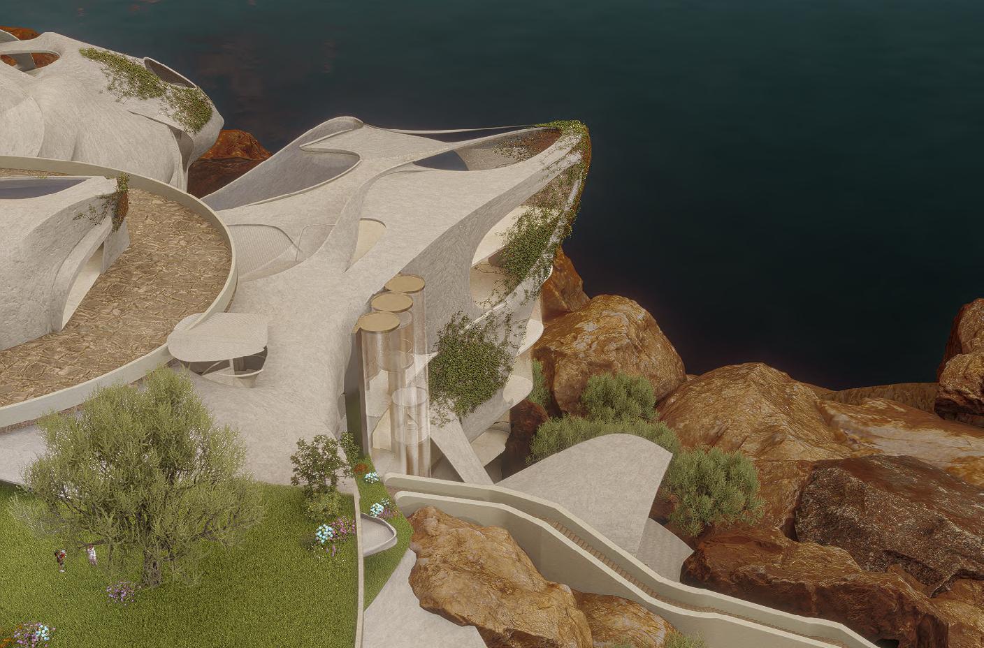 The project is organized as a spatial sequence of life stages: reception (childhood), climbing and bungee (youth), museum and meditation (middle age), and a nursing home (old age). Each zone is positioned along the terrain and oriented toward the sea. At the most dangerous rocky tip—currently a popular sunset destination— a protected viewing promenade is introduced, transforming risk into safety. Circulation cores and layered pathways interconnect the six main components, allowing independent operation while maintaining visual and physical continuity across the site.