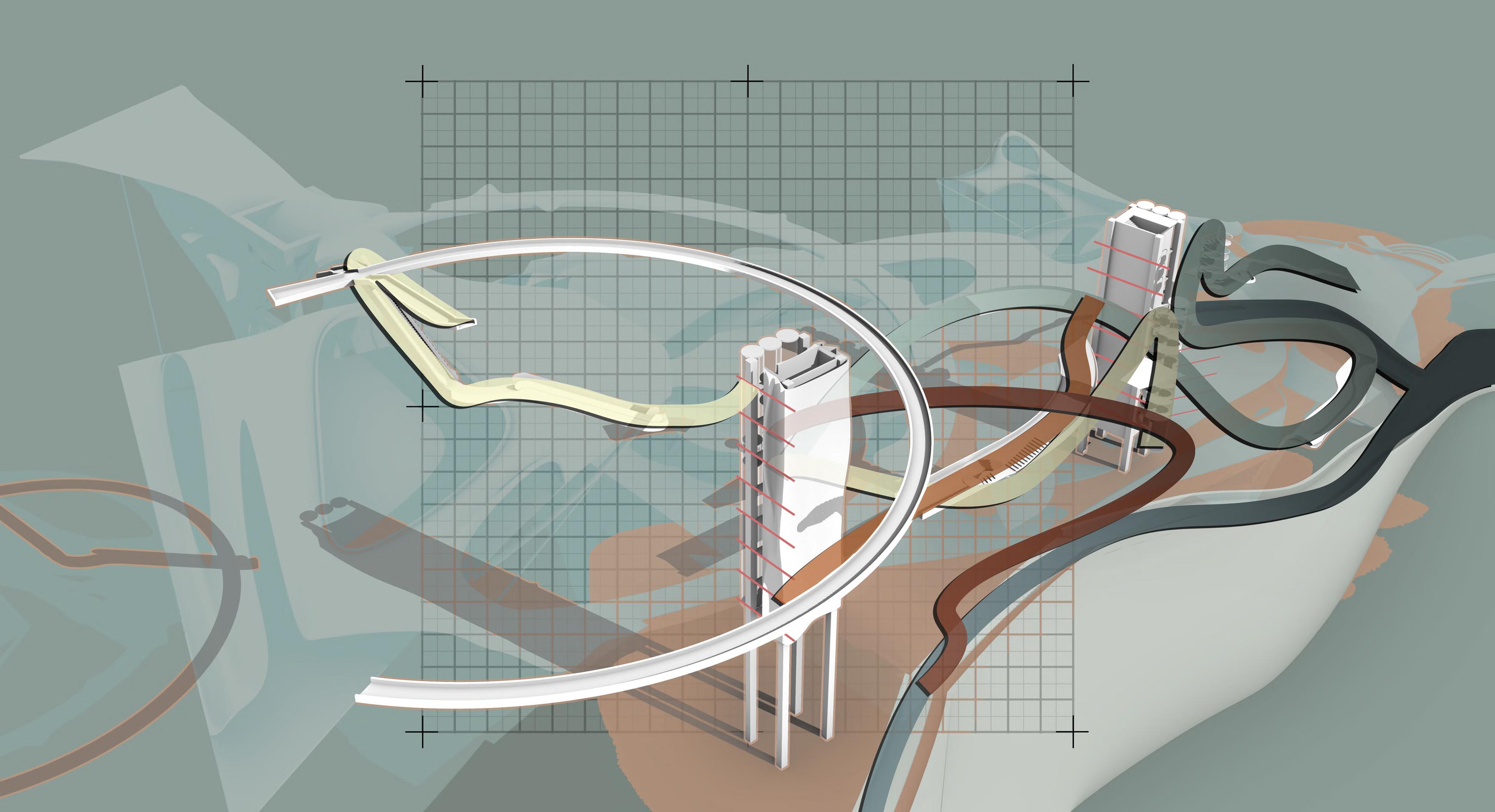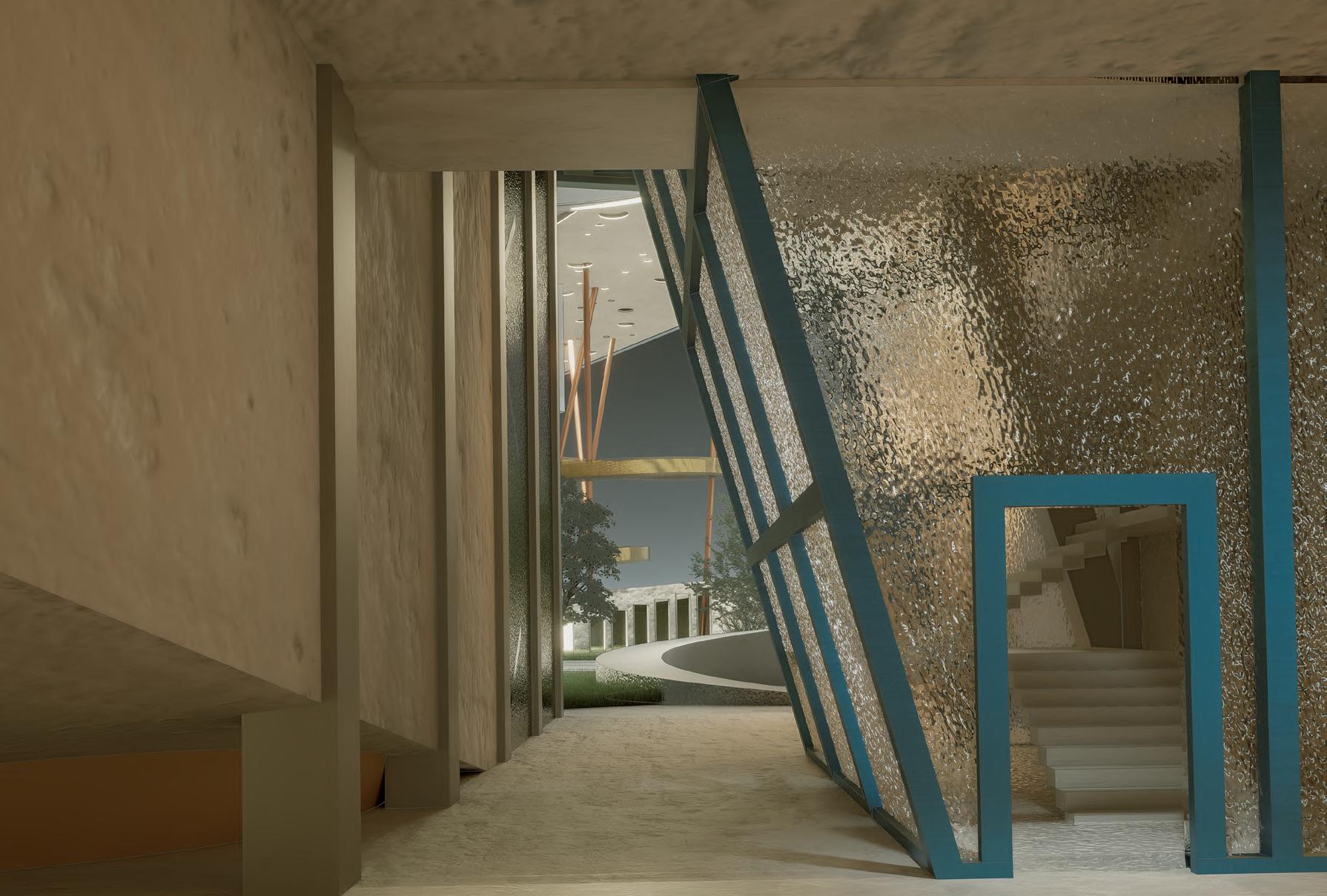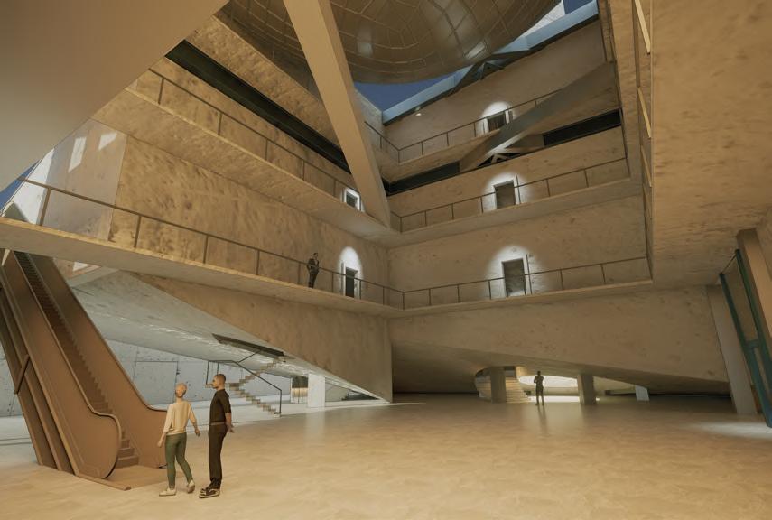 The museum features both a panoramic elevator and a sculptural spiral staircase. The elevator provides smooth, accessible vertical circulation with continuous visual connection, while the spiral stair offers a dynamic, bodily ascent. Together, they create varied speeds, perspectives, and spatial experiences within the exhibition sequence.