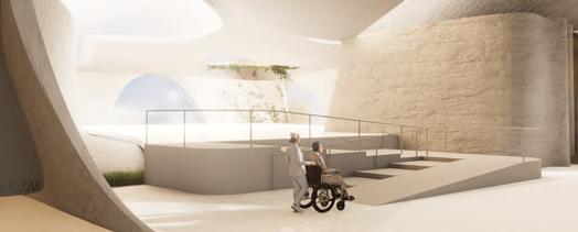 A transitional space connects the nursing home and the museum, integrating both an accessible indoor route and an outdoor landscape path leading directly toward the coastline.