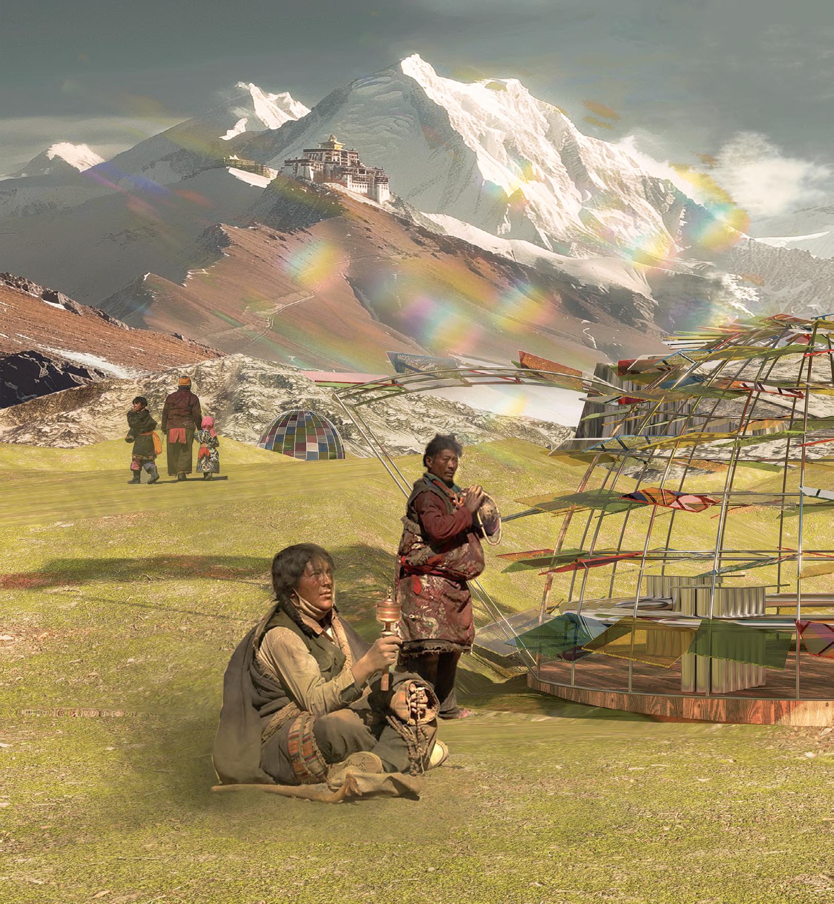 In response to the arduous journey undertaken by Tibetan Buddhist devotees who perform prostrations at the sacred Mount Kailash, we have initiated this project to create a supportive resting pavilion. Devotees endure extreme hardships in the snowy and high-altitude environment, motivated by their dedication to praying for the well-being of all. To alleviate some of their challenges, the region's abundant sunlight and high ultraviolet radiation are utilized to generate solar power.