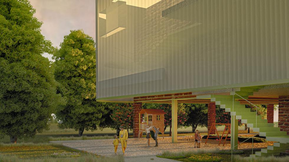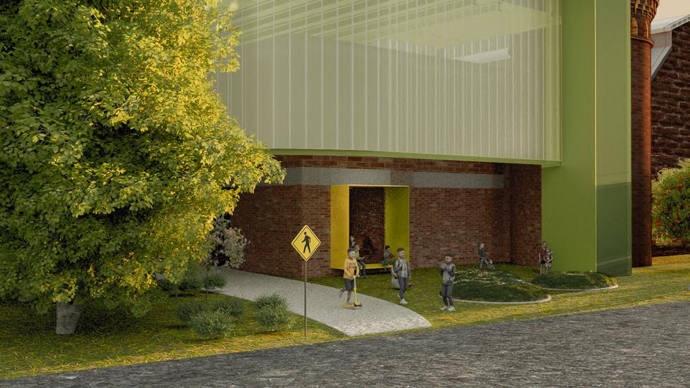 A semi-transparent polycarbonate facade and a reflective aluminum roof hover above the original red-brick structure, creating a sense of lightness and levitation. Teal-colored steel frames reinforce the original building while adding a playful, vibrant contrast that evokes a sense of childlike wonder. Colorful aluminum window frames and stairs are scattered across the translucent surfaces, drawing children's attention and encouraging visual curiosity.