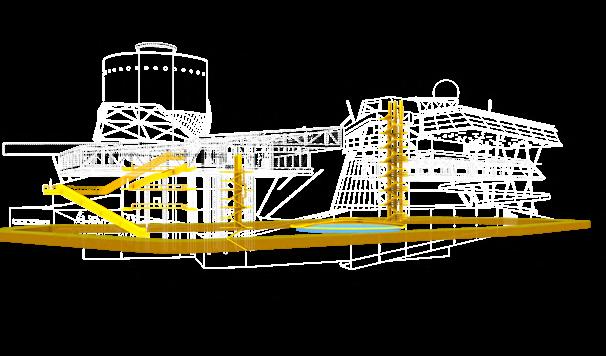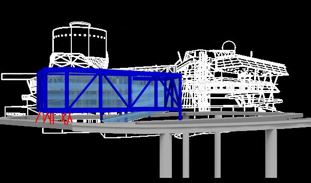A fast ramp links the two primary cores. A 5-meter-wide ramp with a 1.55° incline (≈2.7% slope) resolves the height difference, supporting wheelchairs, mechanical transport, and large equipment movement.